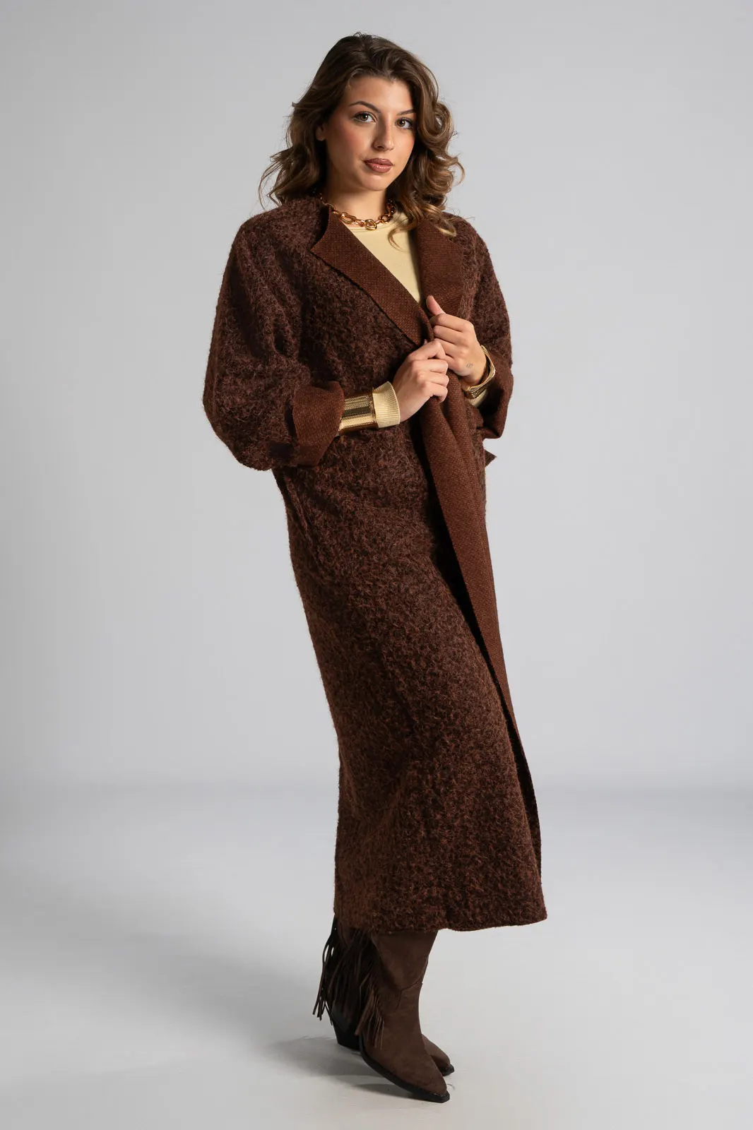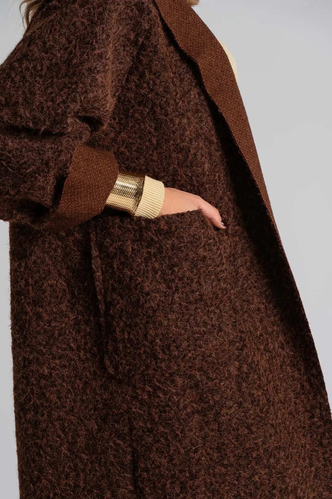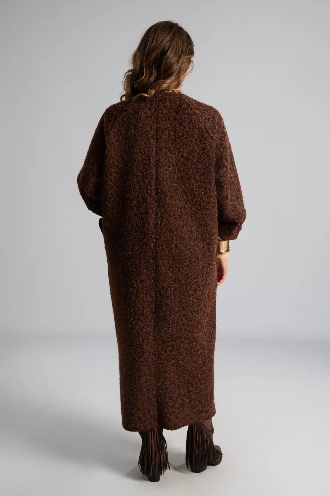 Παλτοζακέτα με στρογγυλή λαιμόκοψη. Είναι σε χνουδωτή υφή και διαθέτει μακριά μανίκια. Είναι maxi. Στο μπροστινό μέρος έχει τσέπες. Η μέτρηση έχει γίνει με άνοιγμα μιας παλάμης. Δεν διαθέτει φόδρα. Οι μετρήσεις του πίνακα είναι αντιπροσωπευτικές για κάθε κωδικό. 100% polyester.