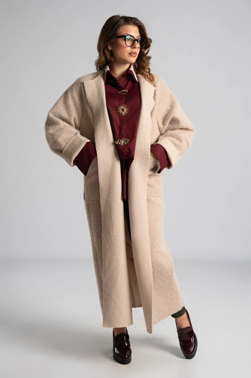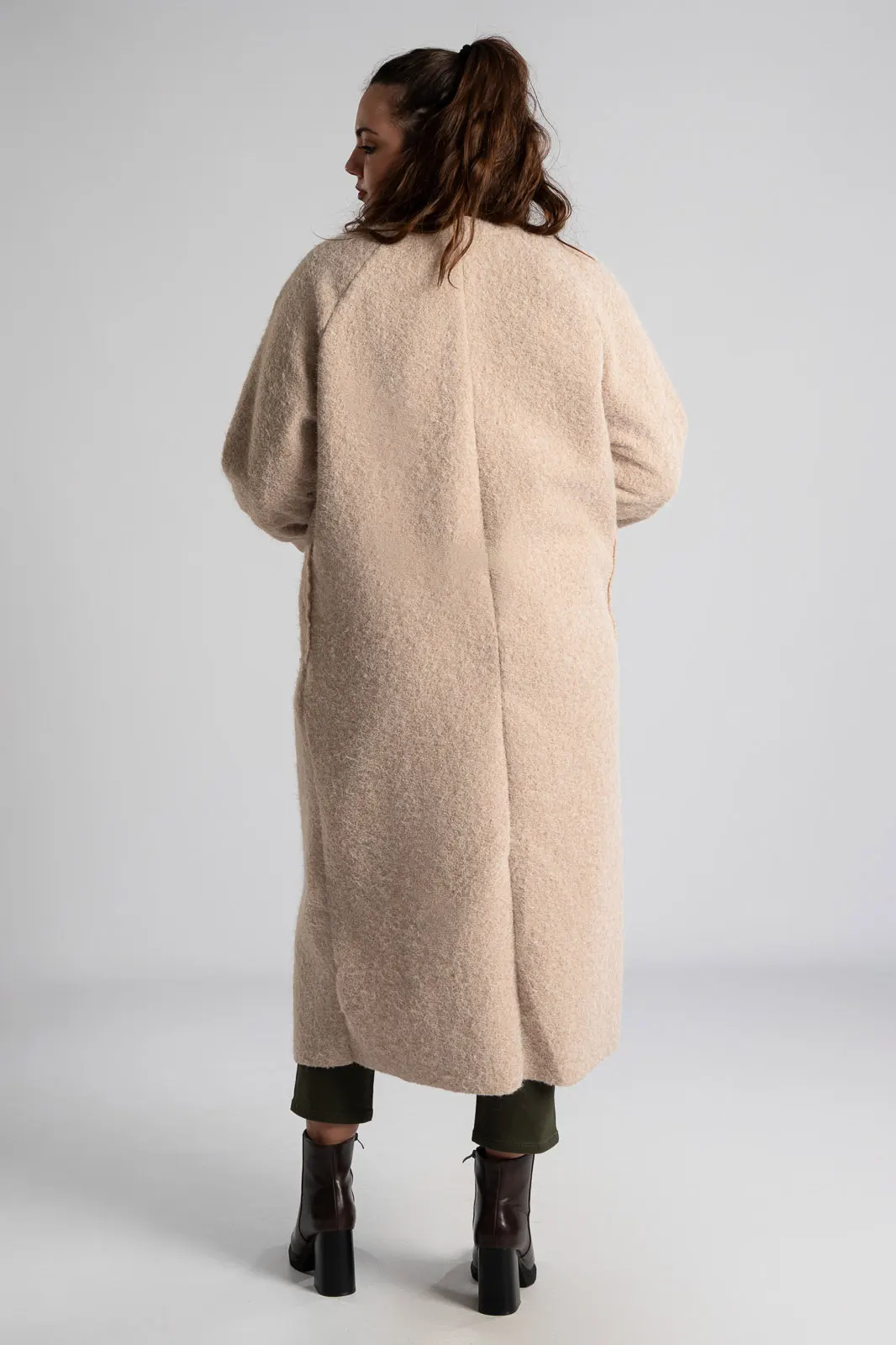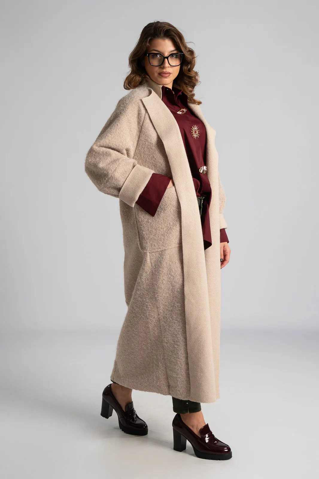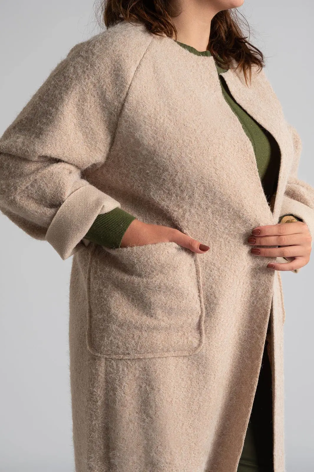 Παλτοζακέτα με στρογγυλή λαιμόκοψη. Είναι σε χνουδωτή υφή και διαθέτει μακριά μανίκια. Είναι maxi. Στο μπροστινό μέρος έχει τσέπες. Η μέτρηση έχει γίνει με άνοιγμα μιας παλάμης. Δεν διαθέτει φόδρα. Οι μετρήσεις του πίνακα είναι αντιπροσωπευτικές για κάθε κωδικό. 100% polyester.