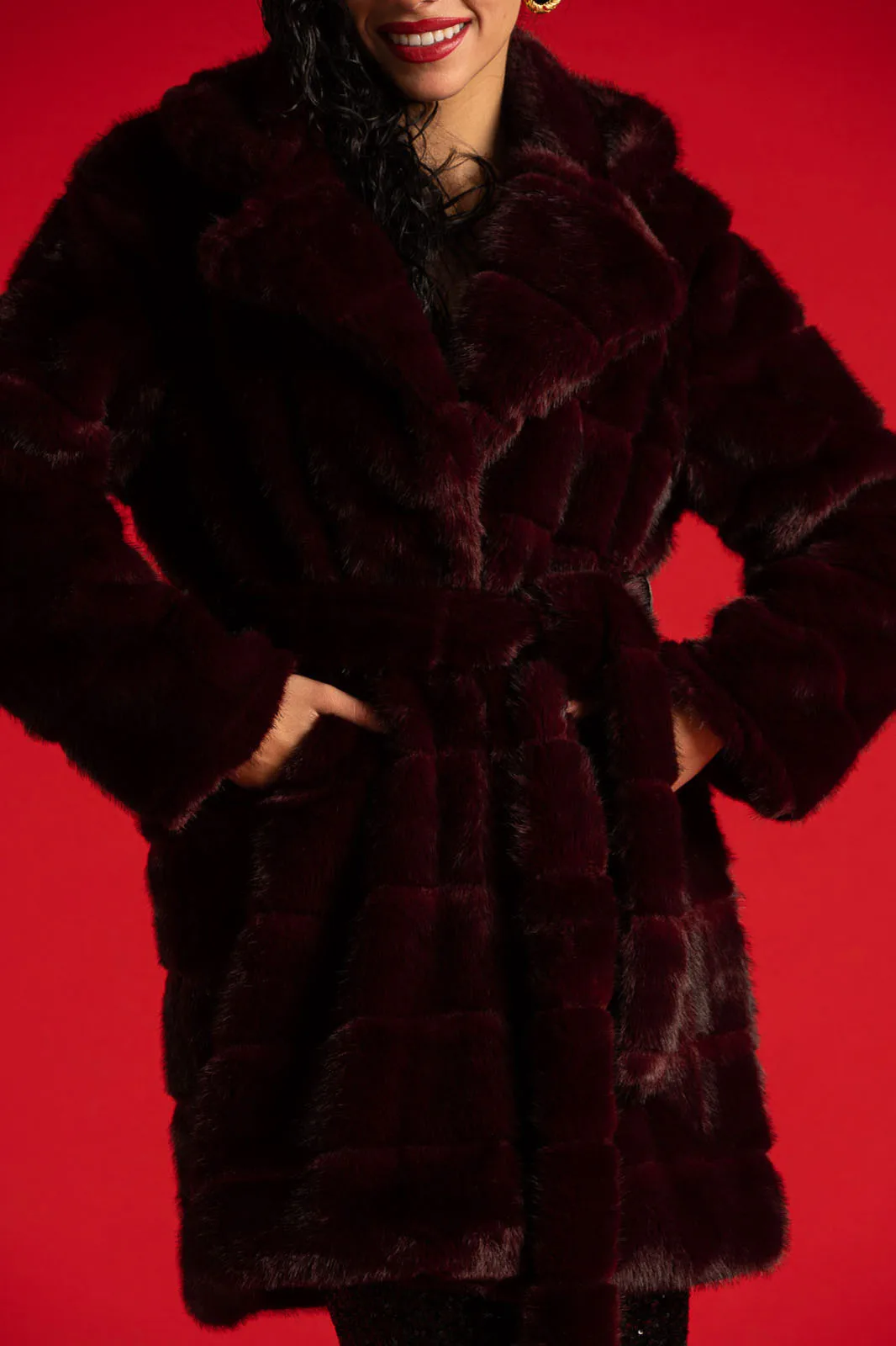 Coat with collar and short lapels. The entire surface is made of soft synthetic fur. It has long sleeves. Pockets on the sides. Comes with a matching belt for a better fit. Lined on the inside. Closes with two clutch buttons. Measurements taken with buttons closed. The measurements in the table are representative of each product. 100% polyester.