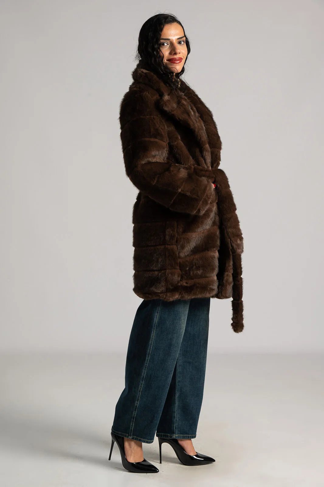 Coat with collar and short lapels. The entire surface is made of soft synthetic fur. It has long sleeves. Pockets on the sides. Comes with a matching belt for a better fit. Lined on the inside. Closes with two clutch buttons. Measurements taken with buttons closed. The measurements in the table are representative of each product. 100% polyester.