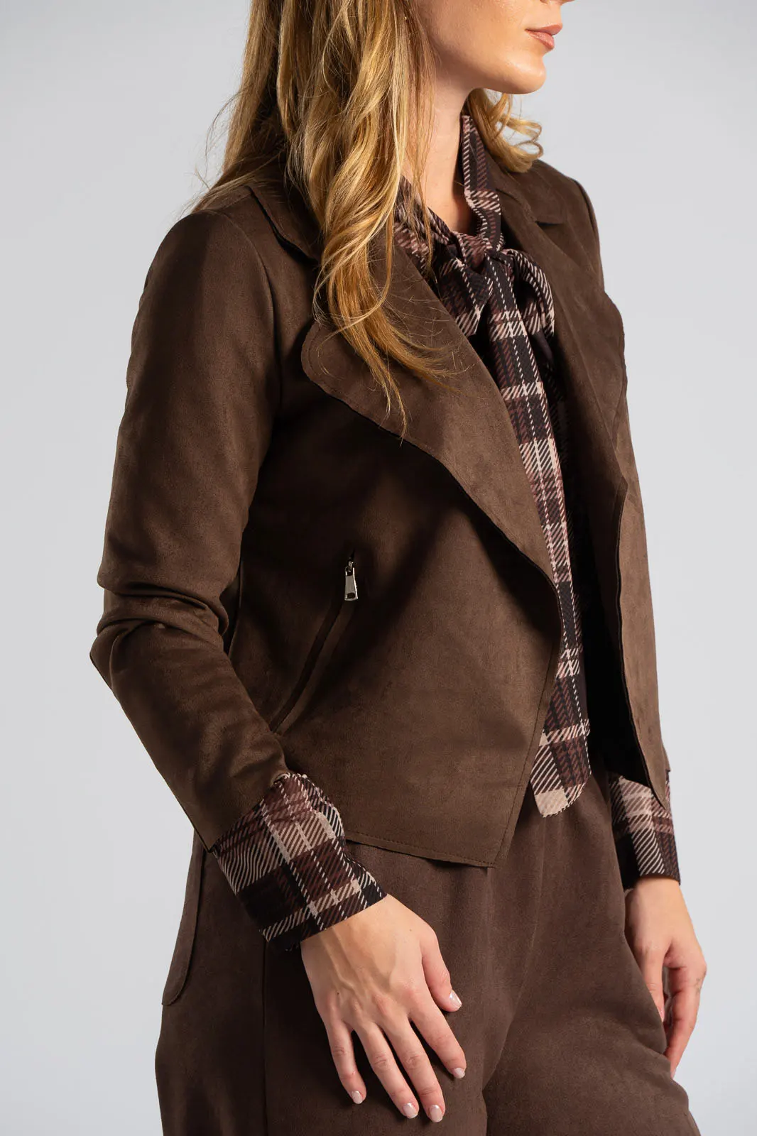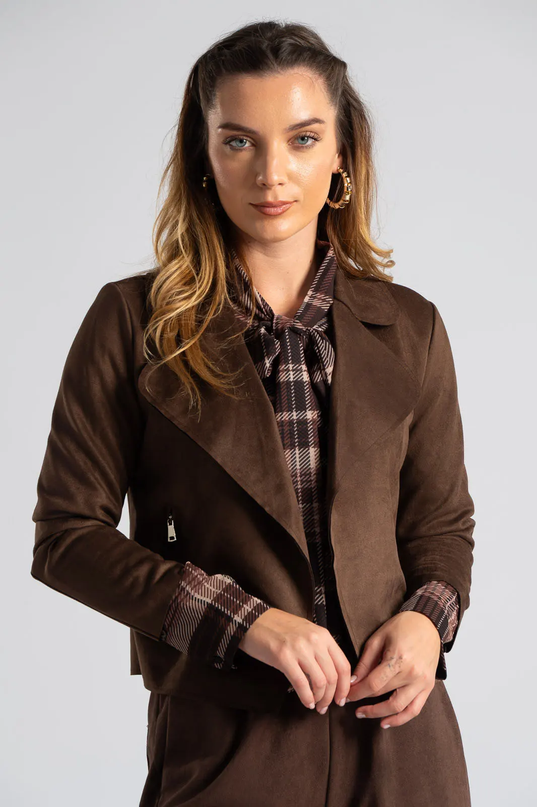 Πανωφόρι σε σουέτ υφή. Διαθέτει γιακά και πέτο. Έχει μακριά μανίκια. Στα πλαινά διαθέτει εικονικές τσέπες με φερμουάρ. Δεν είναι φοδραρισμένο και δεν διαθέτει κουμπί. Η μέτρηση έχει γίνει με το άνοιγμα μια παλάμης. Οι μετρήσεις του πίνακα είναι αντιπροσωπευτικές για κάθε προϊόν. 97% polyester, 3% elastane.