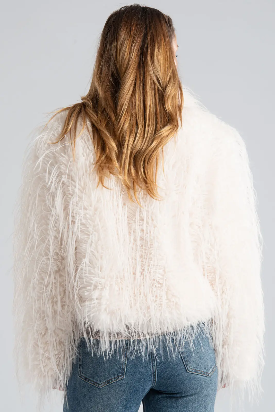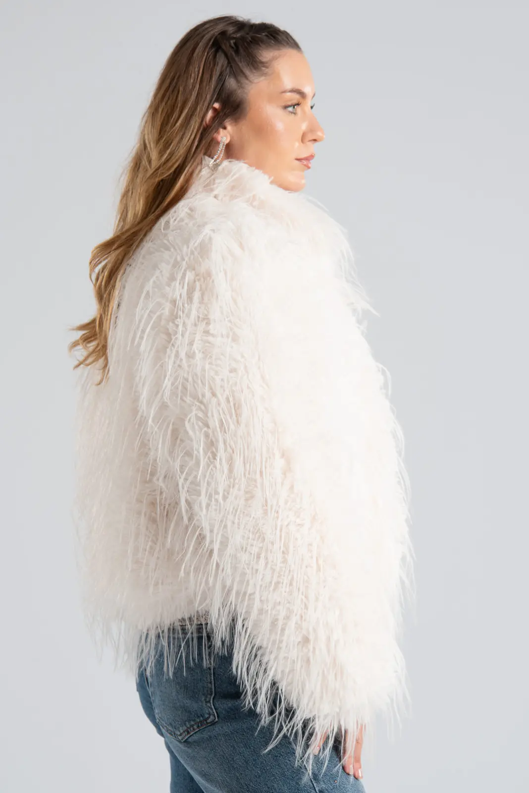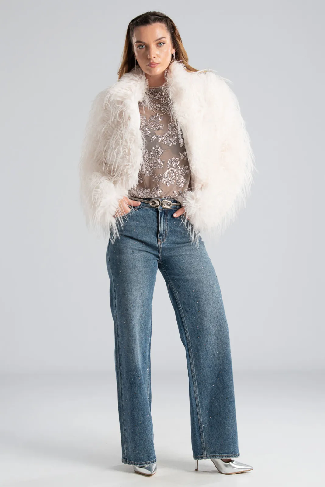Πανωφόρι με οικολογική συνθετική γούνα που προσφέρει κομψότητα και πολυτέλεια. Διαθέτει μακριά μανίκια. Στα πλαινά έχει τσέπες. Σε όλη την επιφάνεια έχει λεπτά νήματα φτερών. Εσωτερικά διαθέτει σατέν επένδυση. Κλείνει με κόπιτσες. Οι μετρήσεις του πίνακα είναι αντιπροσωπευτικές για κάθε προϊόν. 100% polyester.