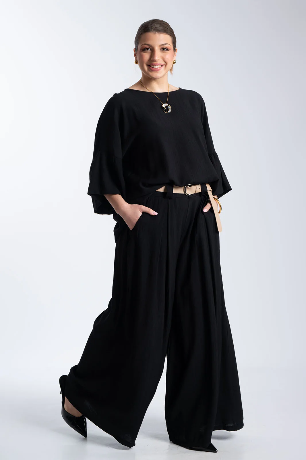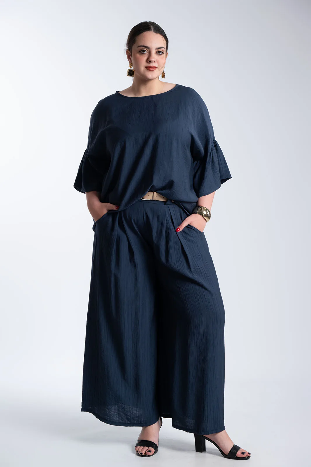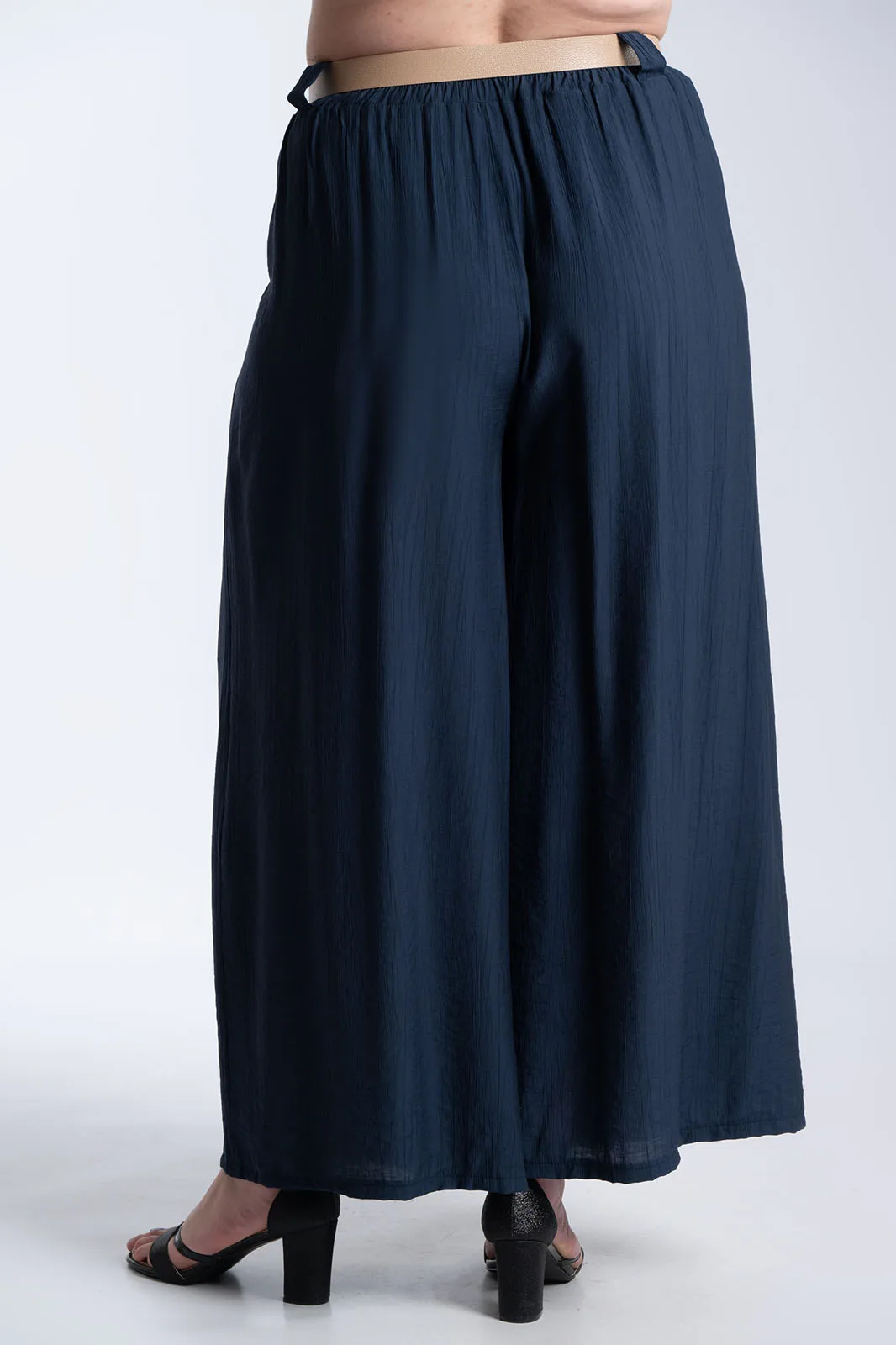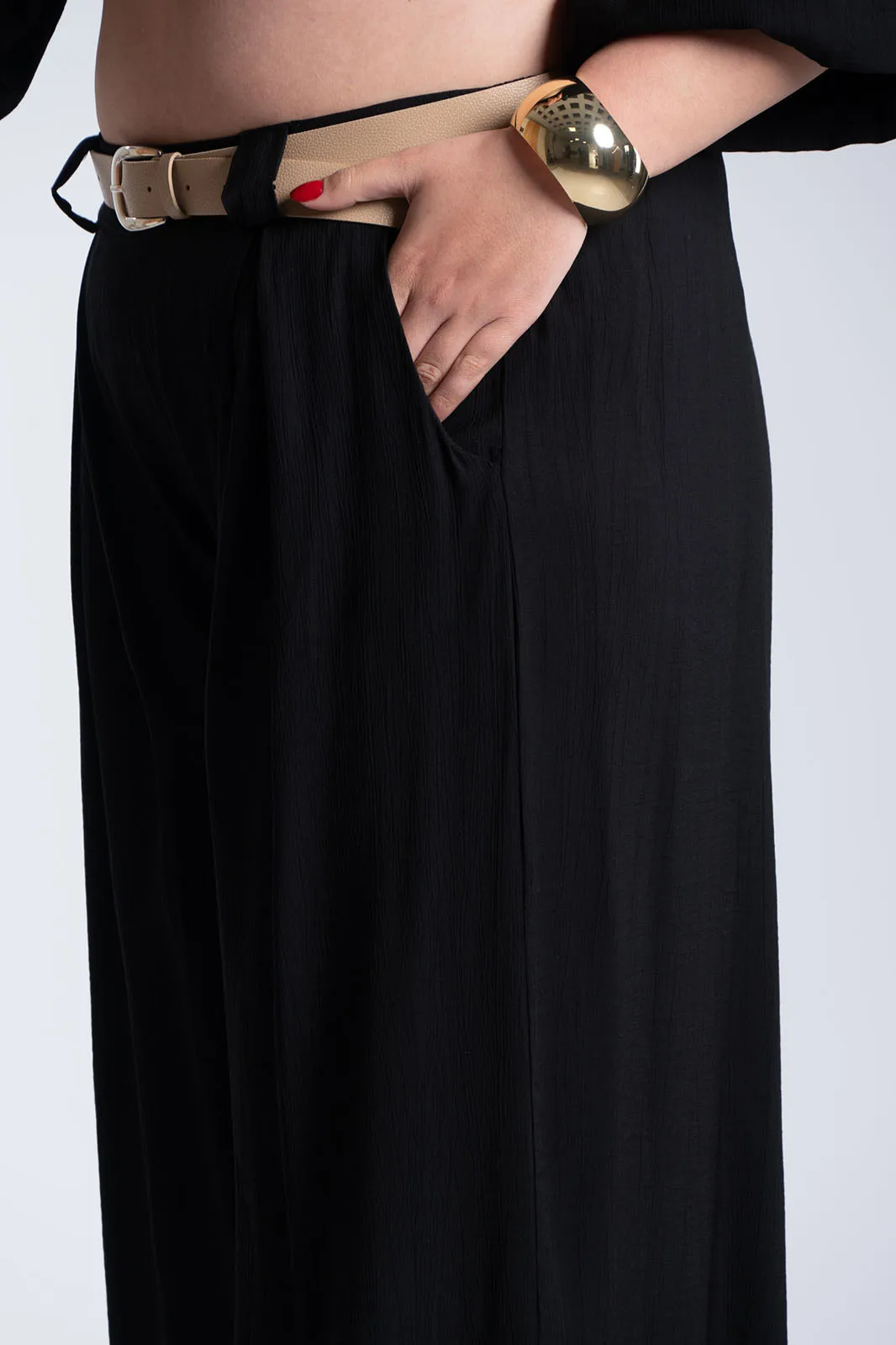 Κομψή παντελόνα με εφέ πλισέ σε φαρδιά γραμμή που συνδυάζει άνεση και στυλ. Διαθέτει φαρδύ λάστιχο στη μέση για σταθερή και άνετη εφαρμογή, ενώ συνοδεύεται από ζώνη που αναδεικνύει τη σιλουέτα. Οι πλαϊνές τσέπες προσθέτουν πρακτικότητα, ενώ το ανάλαφρο ύφασμα με διακριτική υφή χαρίζει κίνηση και κομψότητα σε κάθε βήμα. Ιδανική επιλογή για all day εμφανίσεις, από το γραφείο έως τις βραδινές εξόδους.