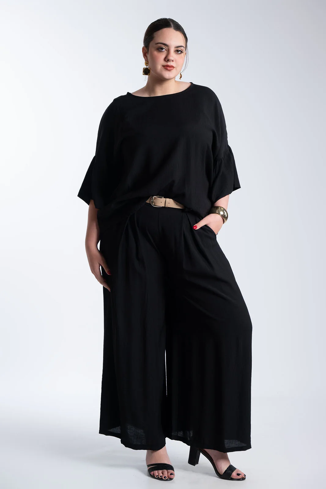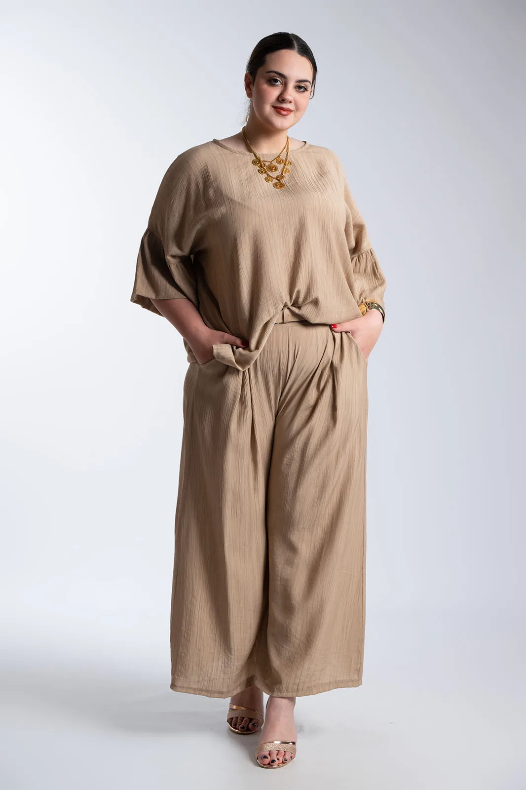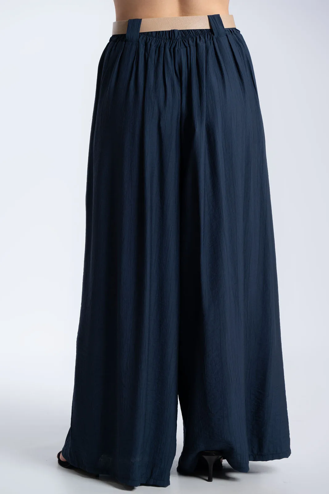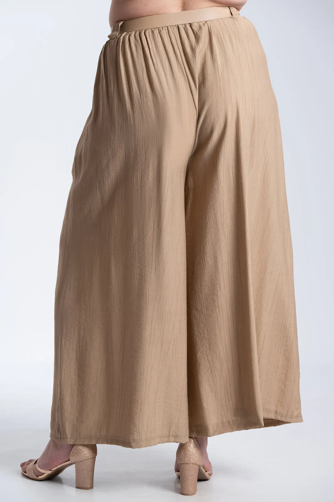 Κομψή παντελόνα με εφέ πλισέ σε φαρδιά γραμμή που συνδυάζει άνεση και στυλ. Διαθέτει φαρδύ λάστιχο στη μέση για σταθερή και άνετη εφαρμογή, ενώ συνοδεύεται από ζώνη που αναδεικνύει τη σιλουέτα. Οι πλαϊνές τσέπες προσθέτουν πρακτικότητα, ενώ το ανάλαφρο ύφασμα με διακριτική υφή χαρίζει κίνηση και κομψότητα σε κάθε βήμα. Ιδανική επιλογή για all day εμφανίσεις, από το γραφείο έως τις βραδινές εξόδους.