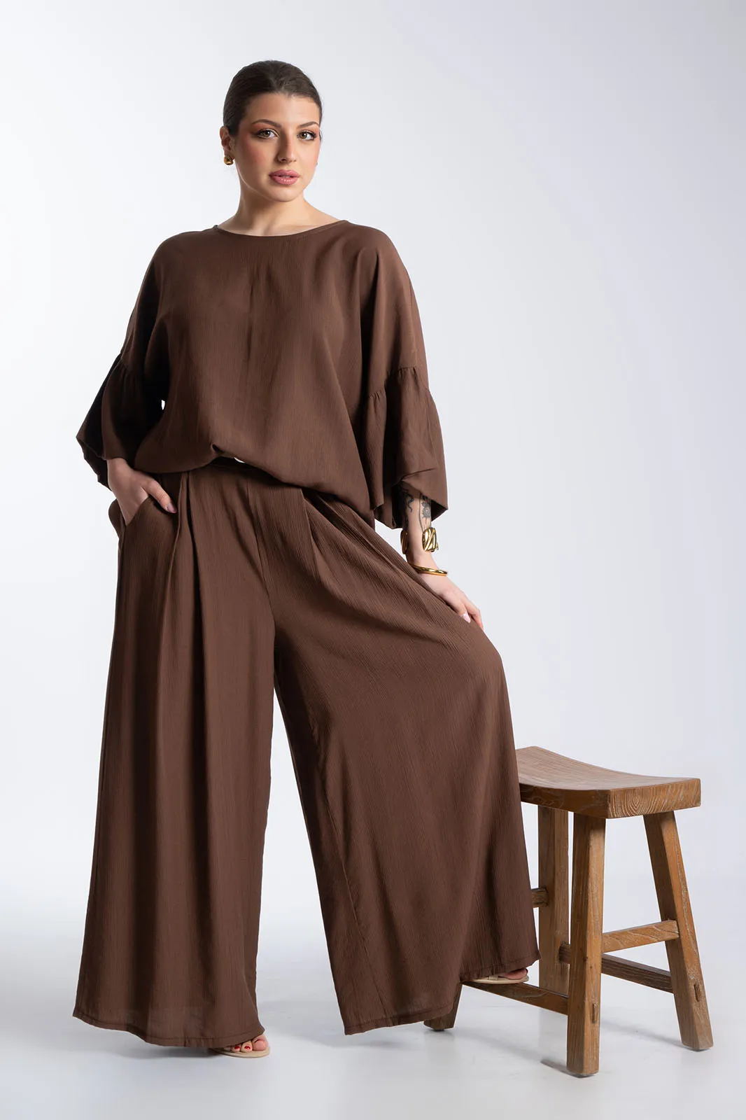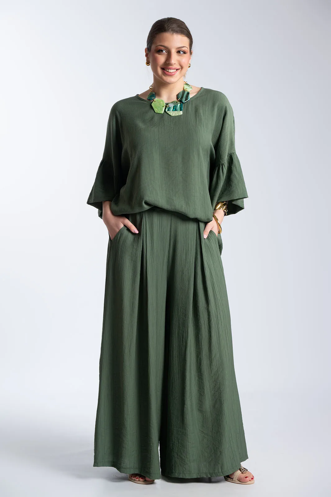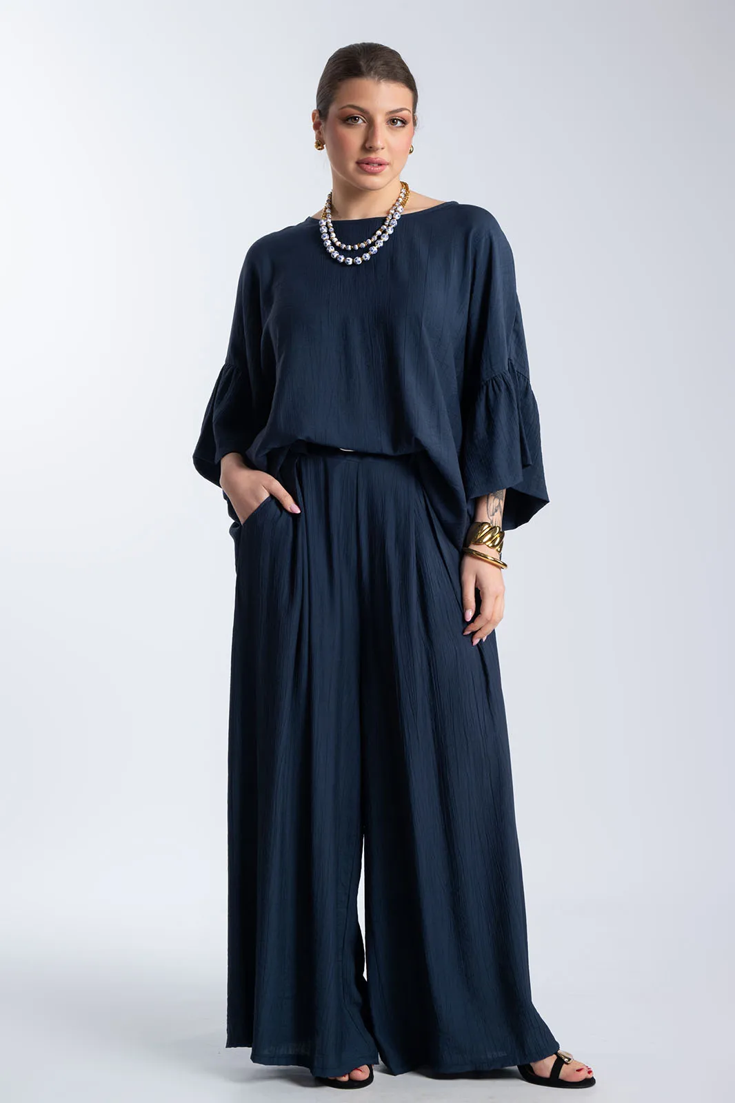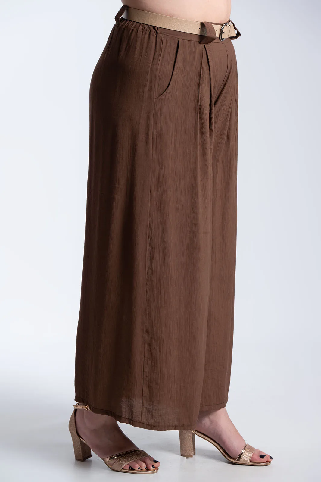 Κομψή παντελόνα με εφέ πλισέ σε φαρδιά γραμμή που συνδυάζει άνεση και στυλ. Διαθέτει φαρδύ λάστιχο στη μέση για σταθερή και άνετη εφαρμογή, ενώ συνοδεύεται από ζώνη που αναδεικνύει τη σιλουέτα. Οι πλαϊνές τσέπες προσθέτουν πρακτικότητα, ενώ το ανάλαφρο ύφασμα με διακριτική υφή χαρίζει κίνηση και κομψότητα σε κάθε βήμα. Ιδανική επιλογή για all day εμφανίσεις, από το γραφείο έως τις βραδινές εξόδους.