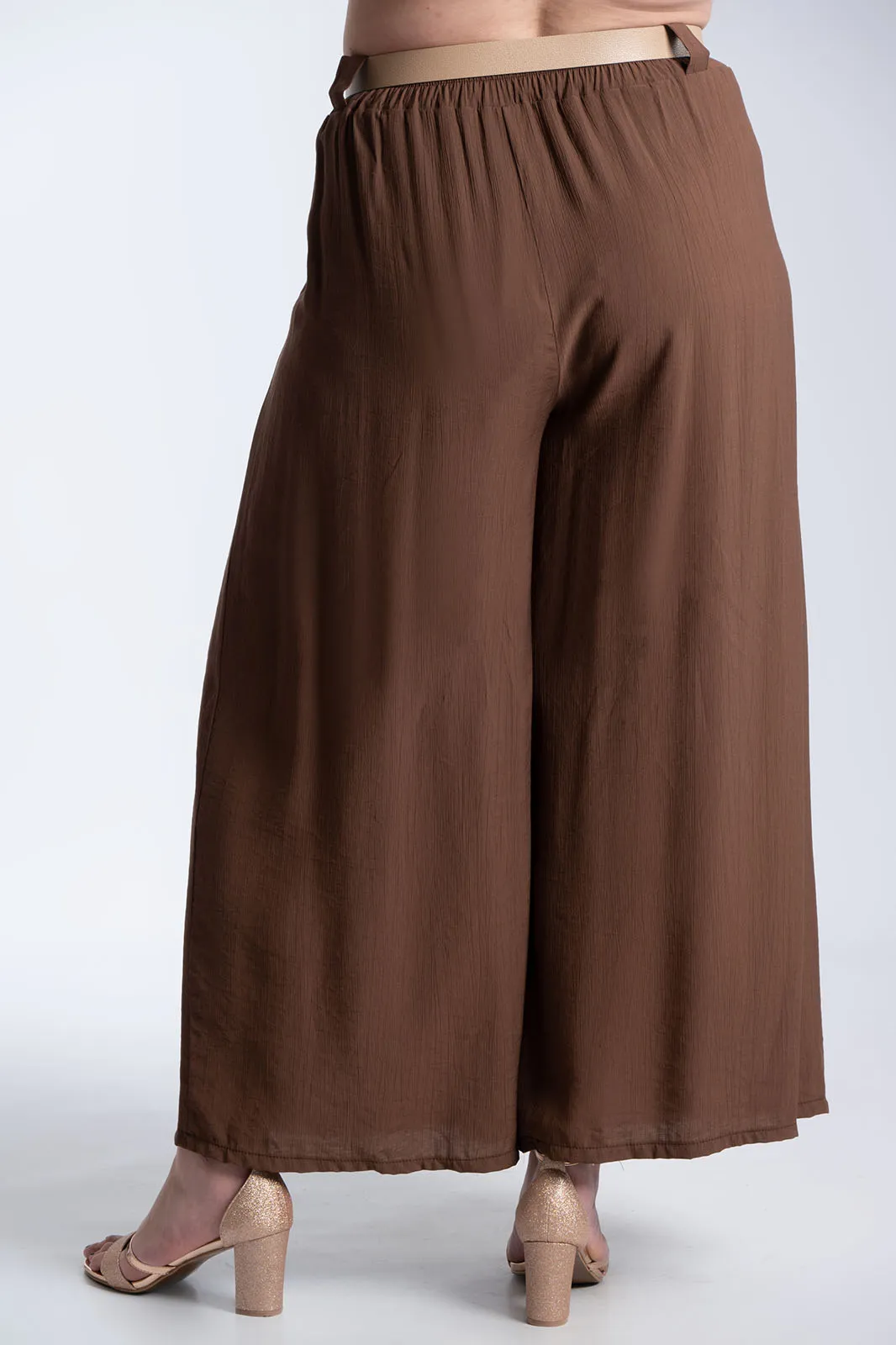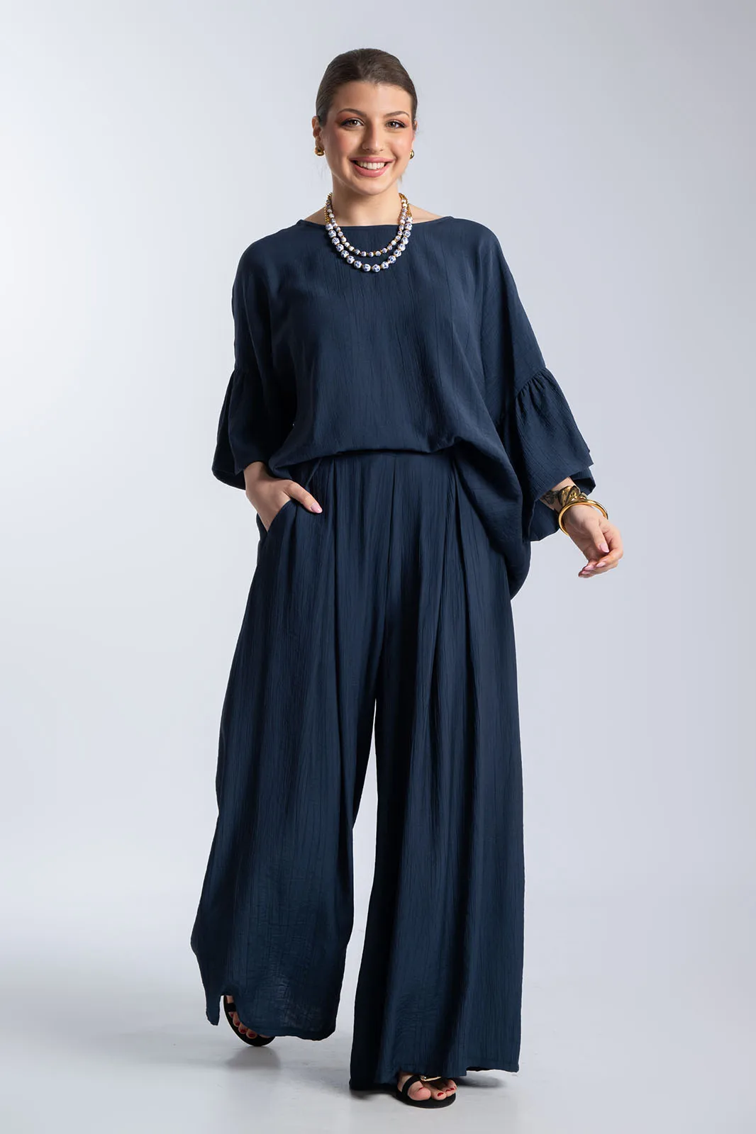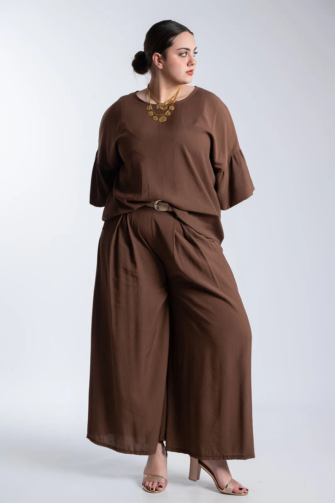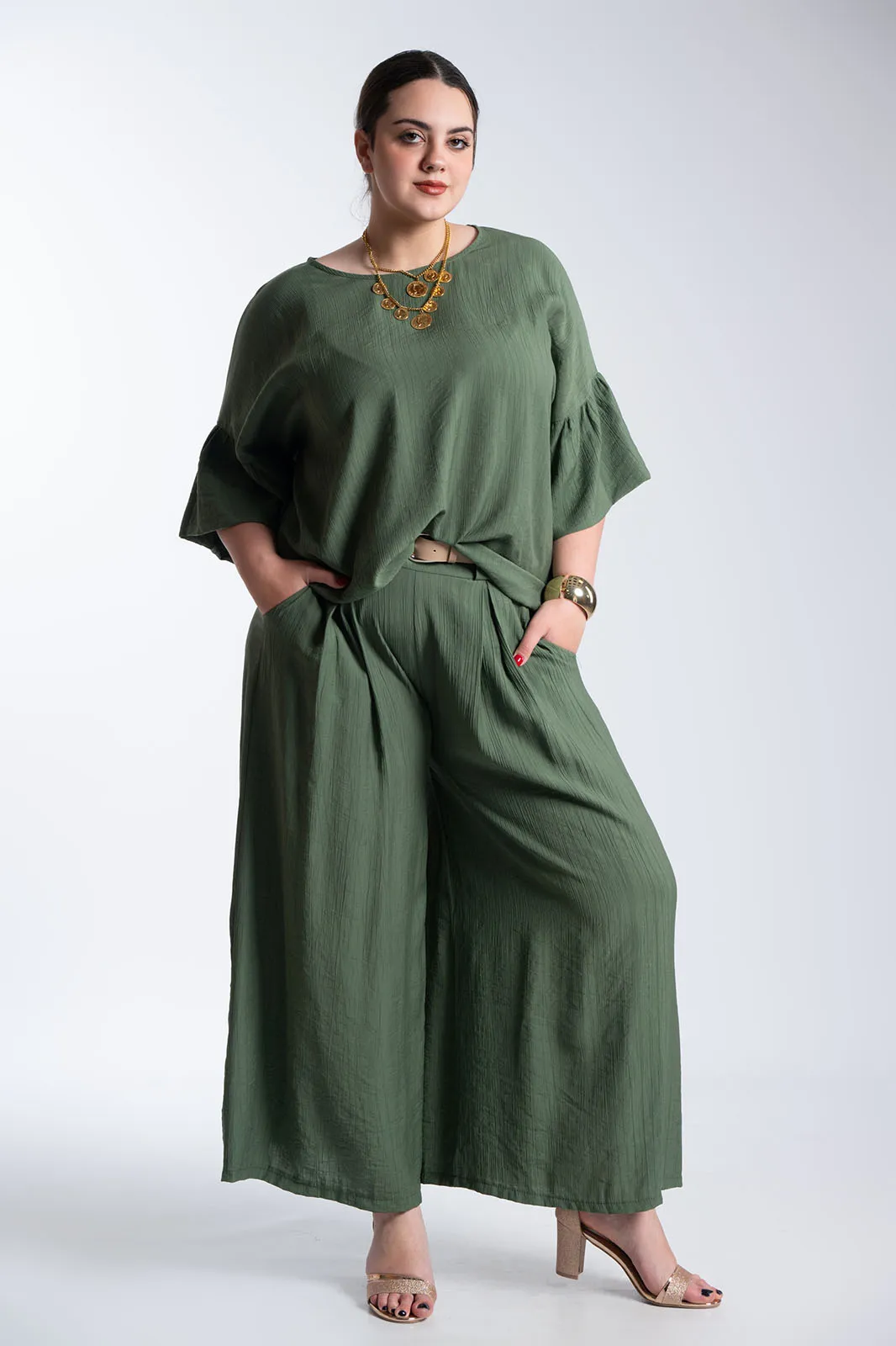 Κομψή παντελόνα με εφέ πλισέ σε φαρδιά γραμμή που συνδυάζει άνεση και στυλ. Διαθέτει φαρδύ λάστιχο στη μέση για σταθερή και άνετη εφαρμογή, ενώ συνοδεύεται από ζώνη που αναδεικνύει τη σιλουέτα. Οι πλαϊνές τσέπες προσθέτουν πρακτικότητα, ενώ το ανάλαφρο ύφασμα με διακριτική υφή χαρίζει κίνηση και κομψότητα σε κάθε βήμα. Ιδανική επιλογή για all day εμφανίσεις, από το γραφείο έως τις βραδινές εξόδους.