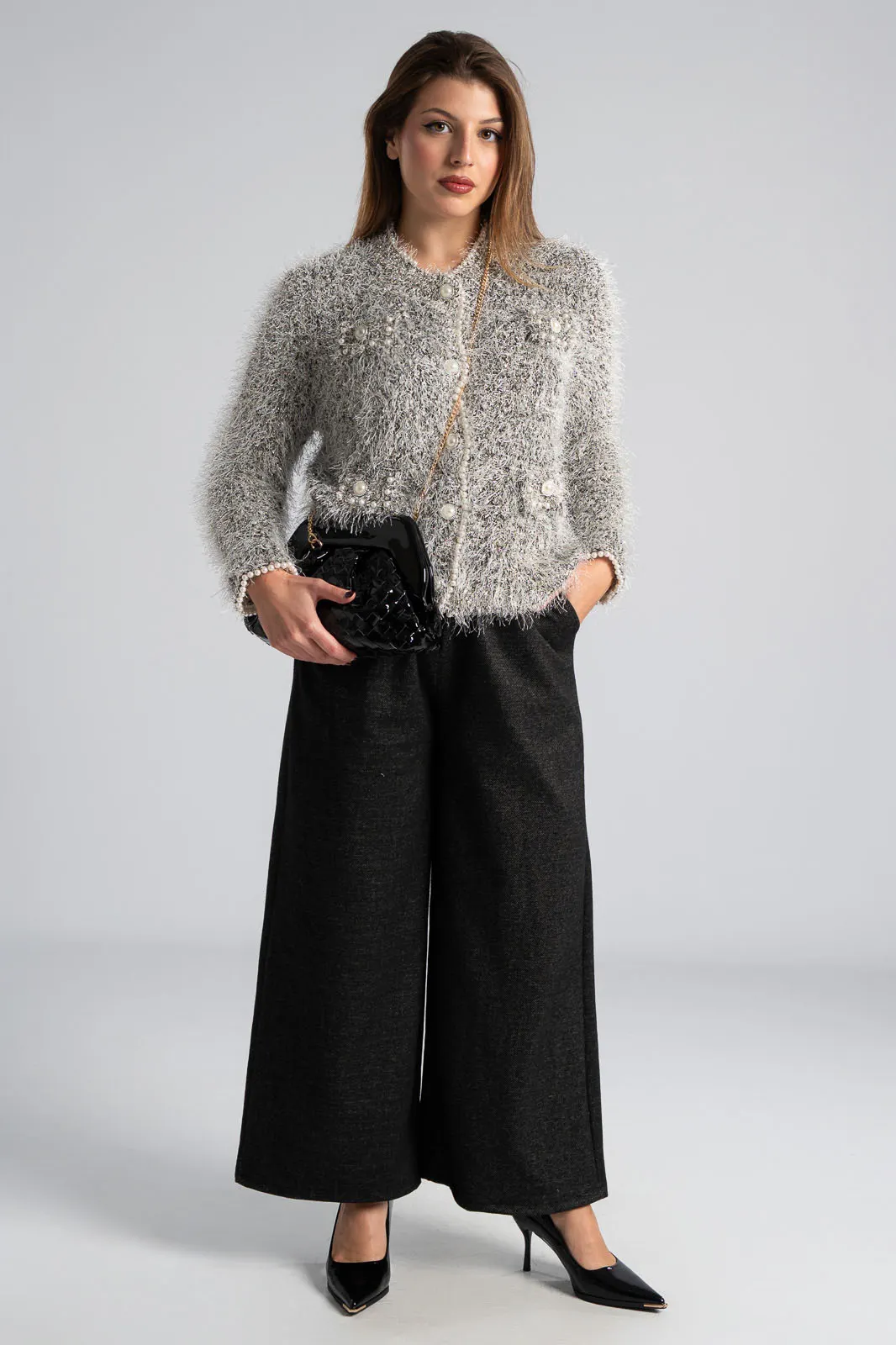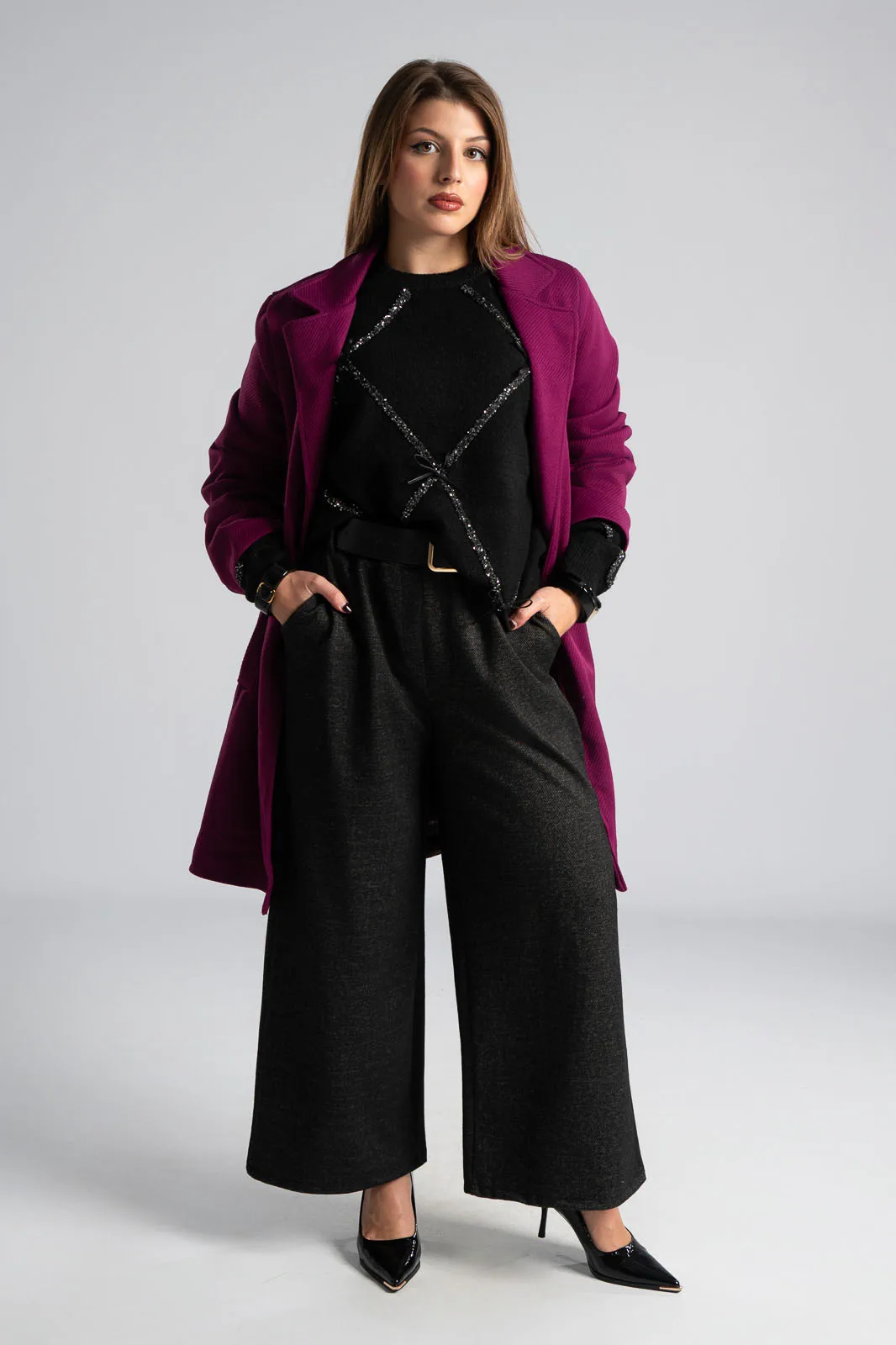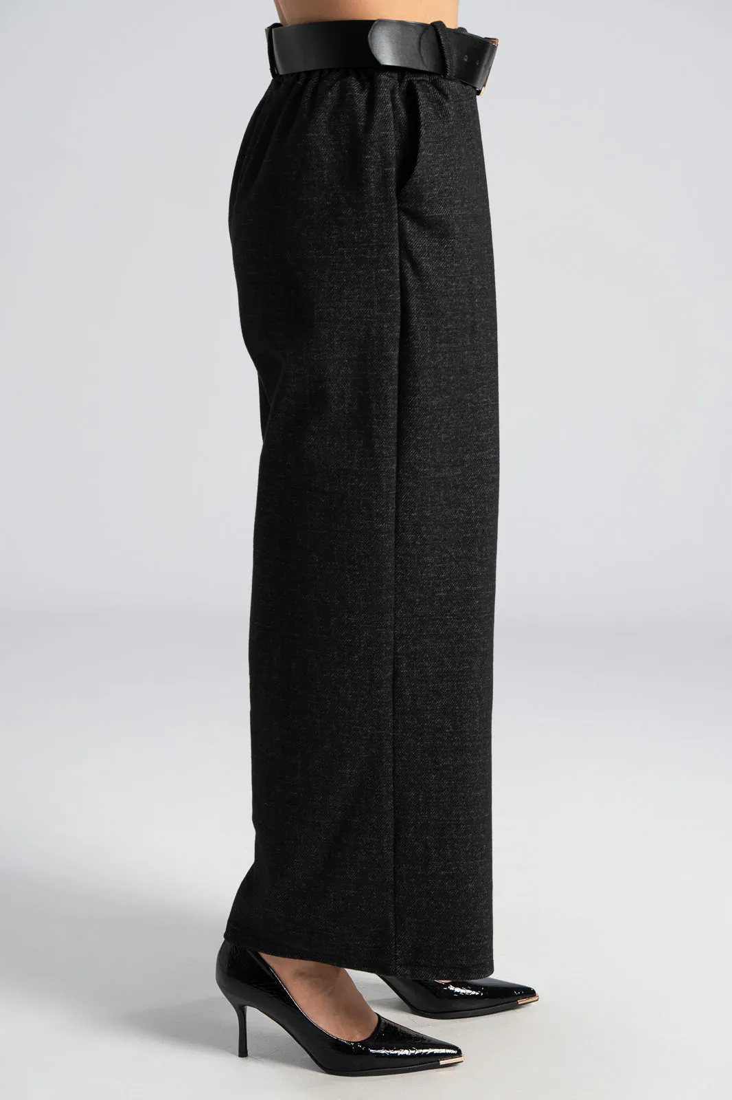 High-waisted pants with their own leather belt. They have elastic around the waist for a better fit. They have side pockets and no zipper. The fabric is striped and very soft. They are a great choice for any time of day. The measurements in the table are representative of each product. 85% polyamide, 10% viscose, 5% elastane.