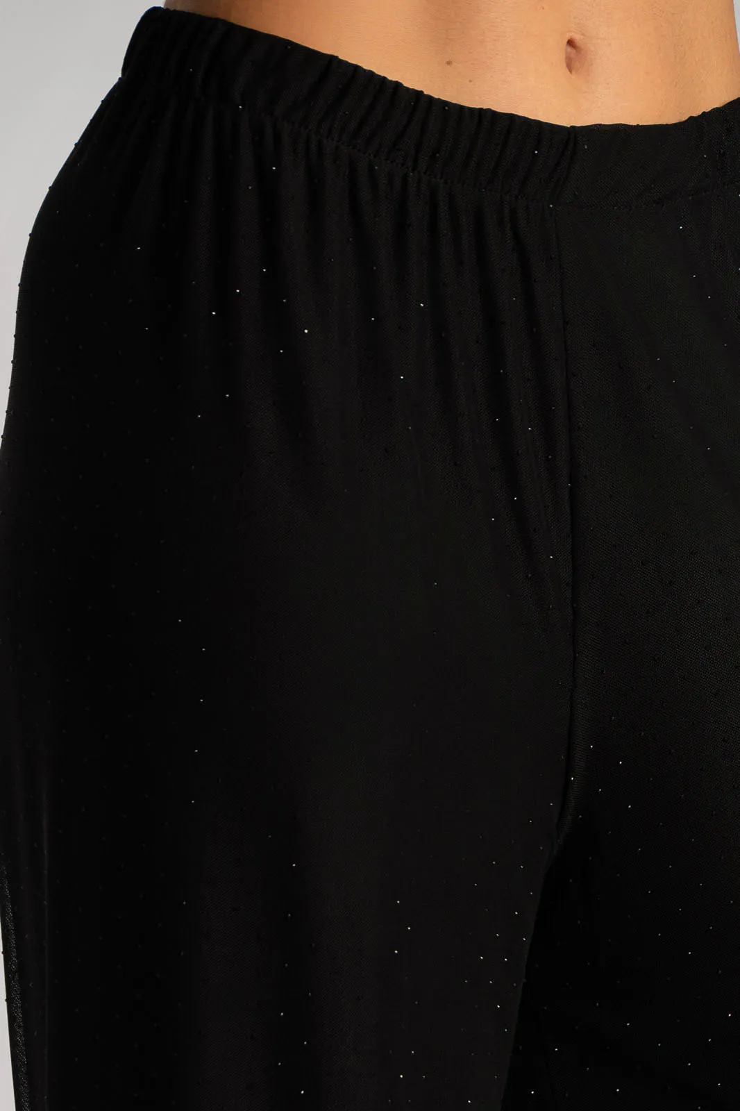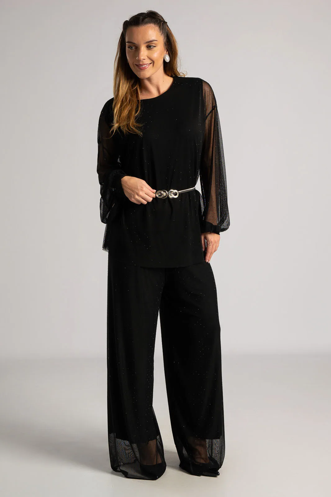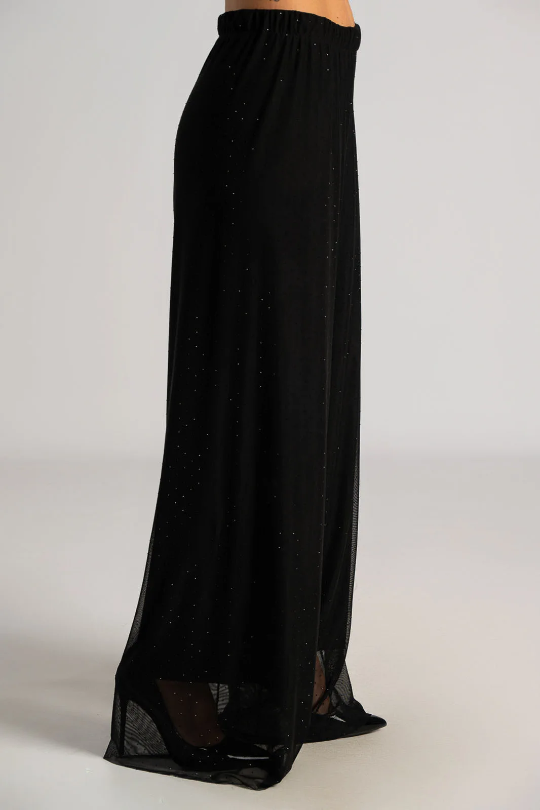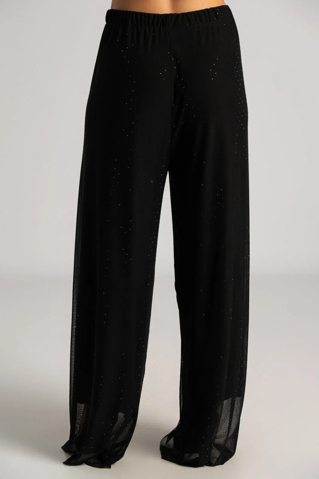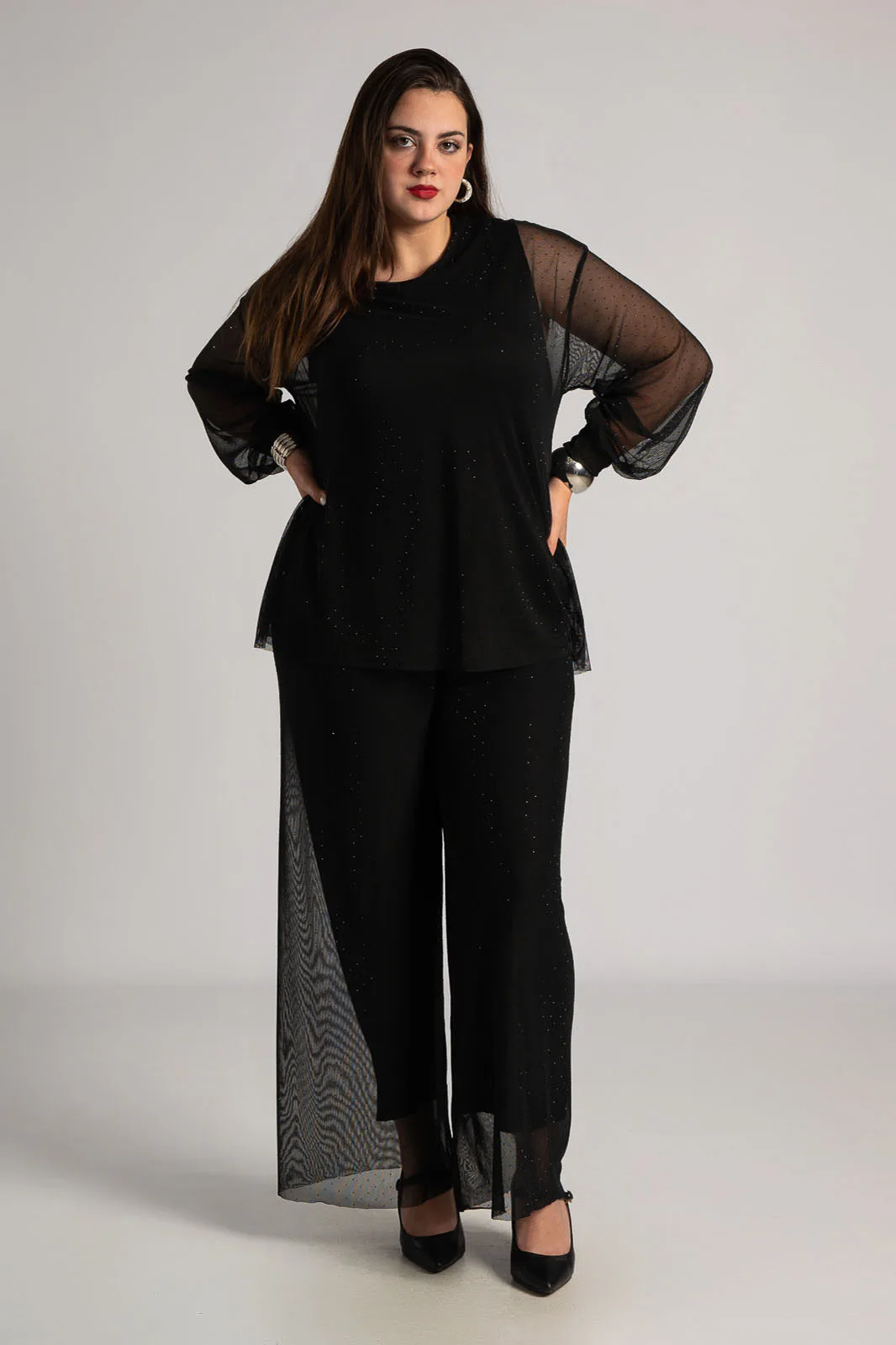 Παντελόνι με λάστιχο στην μέση. Σε όλη την επιφάνεια διαθέτει τούλινη διαφάνεια και εσωτερικά έχει επένδυση. Σε όλη την επιφάνεια έχει διακοσμητικά τρουξ. Οι μετρήσεις του πίνακα είναι αντιπροσωπευτικές για κάθε προϊόν. 95% polyester, 5% elastan (επένδυση 95% viscose, 5% elastan).