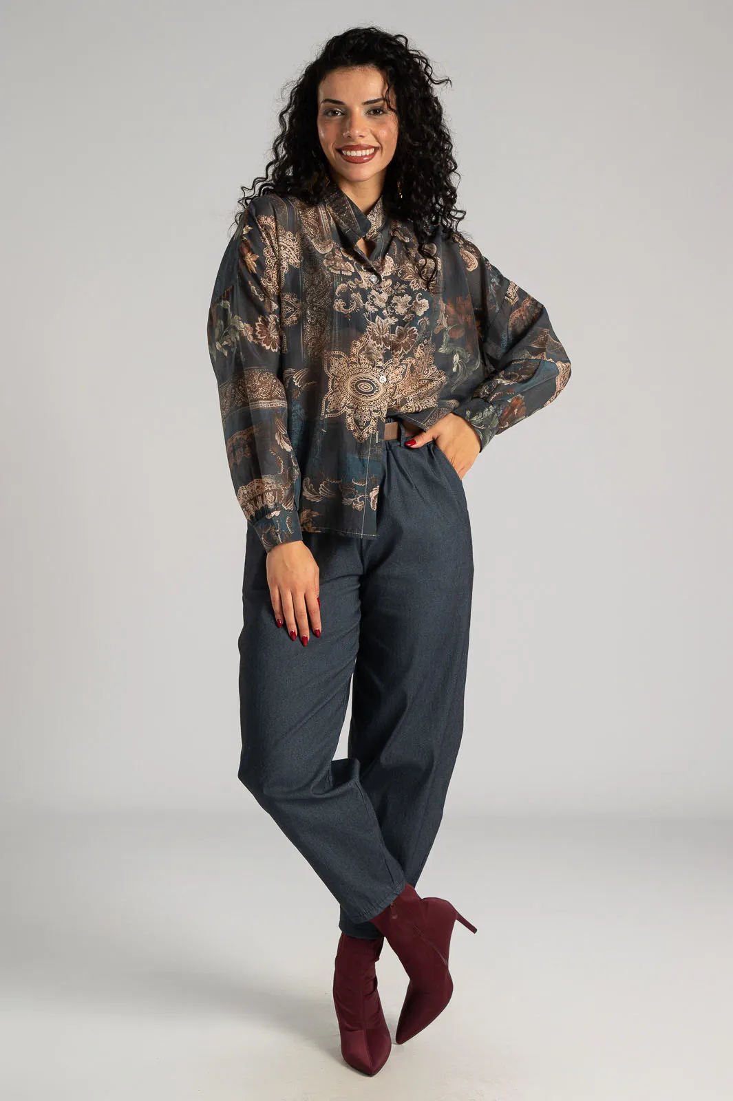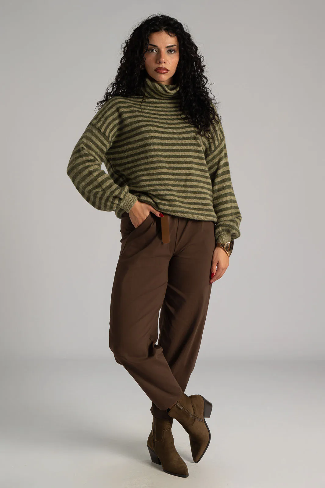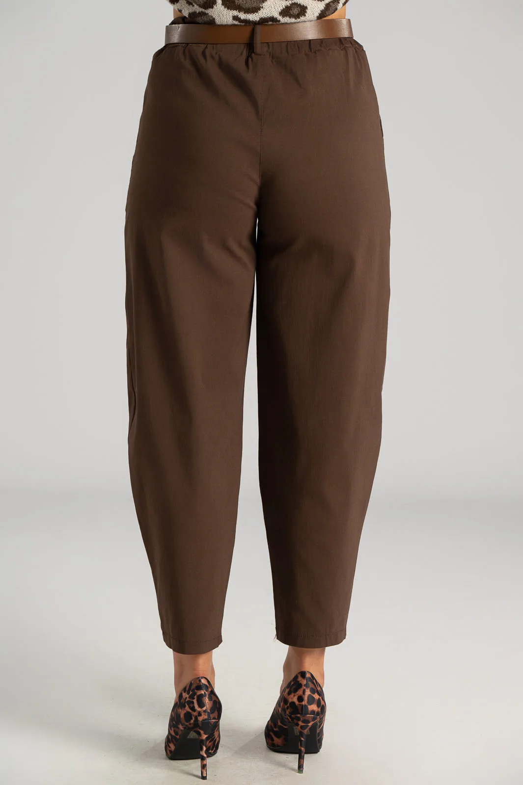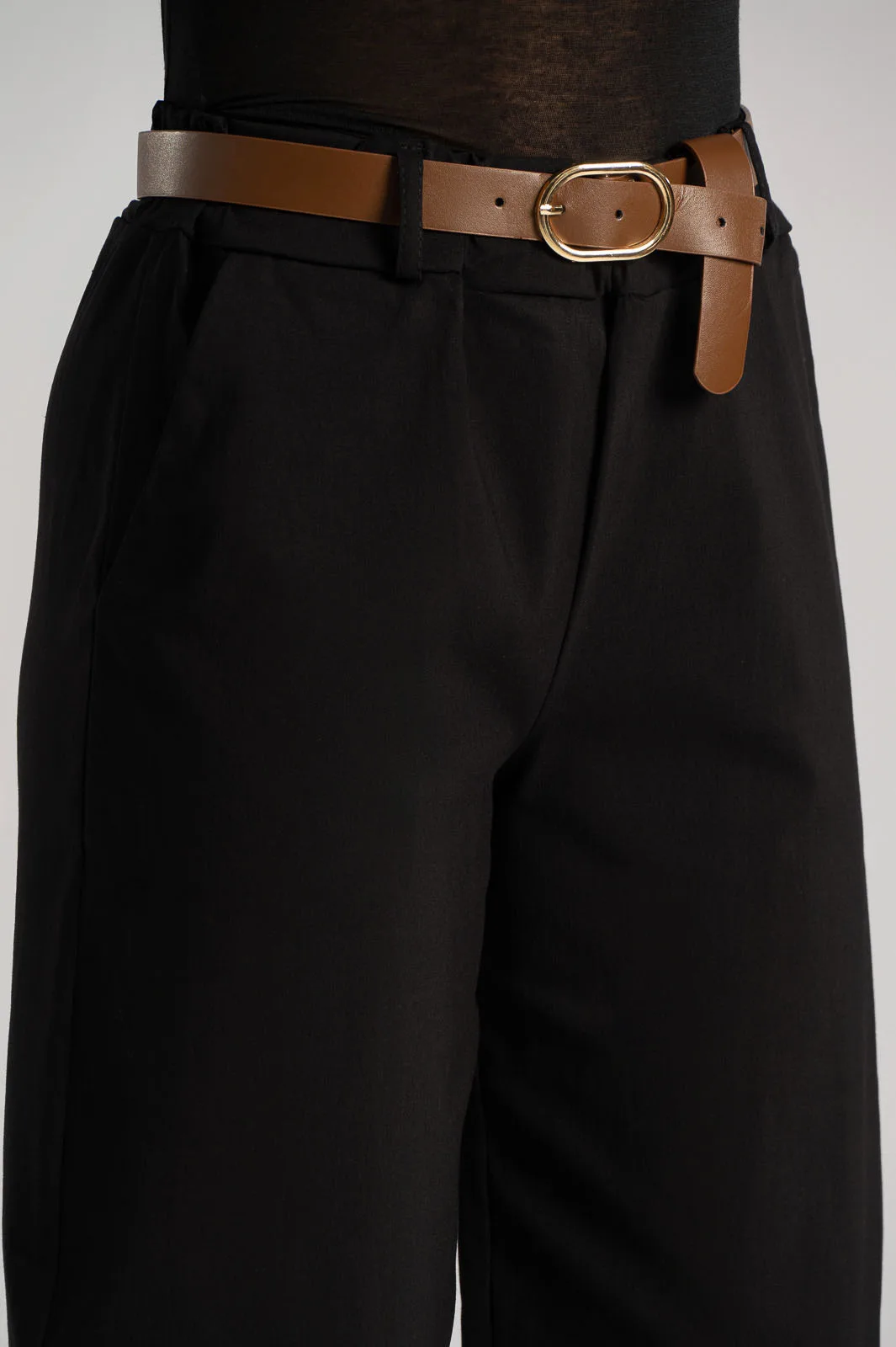 Baggy ankle pants. They have pockets on the sides and elastic around the waist for a better fit. Comes with its own brown leatherette belt. The measurements in the table are representative of each product. 75% viscose, 22% nylon, 3% elastane.