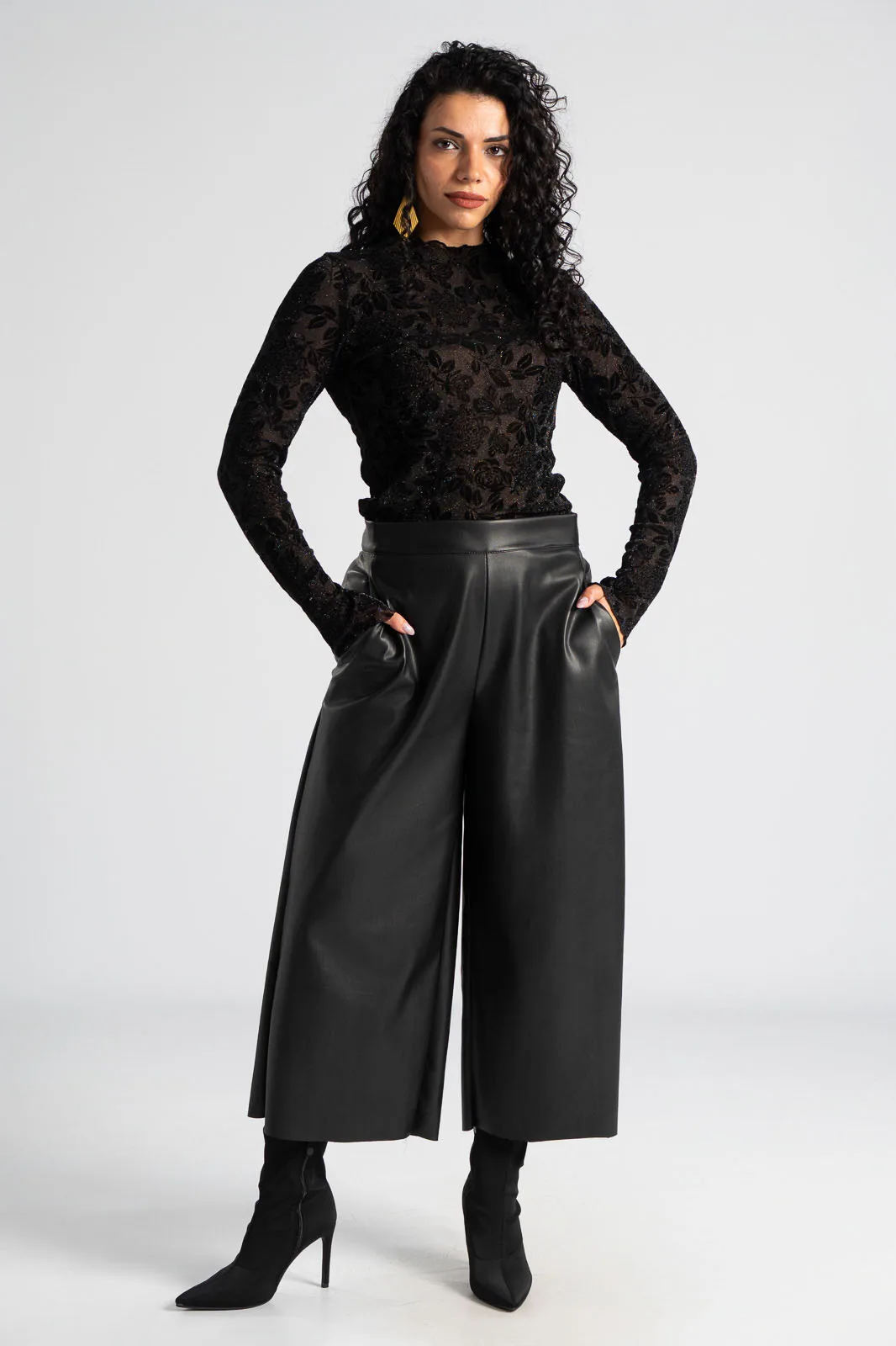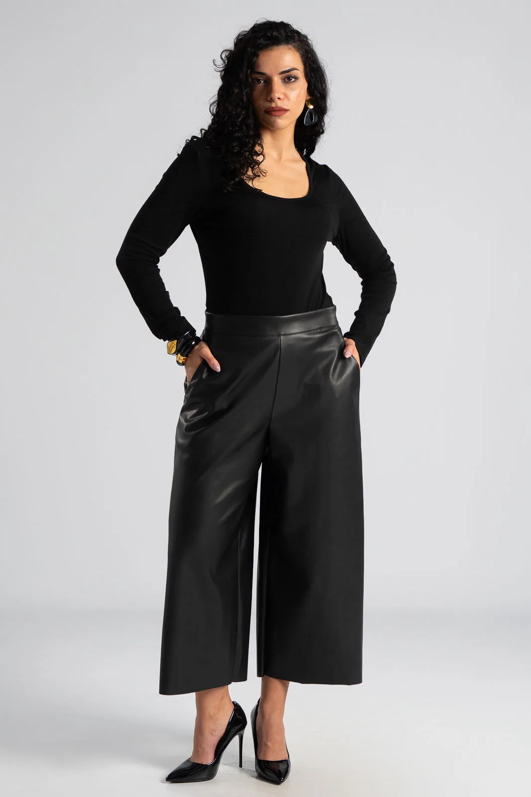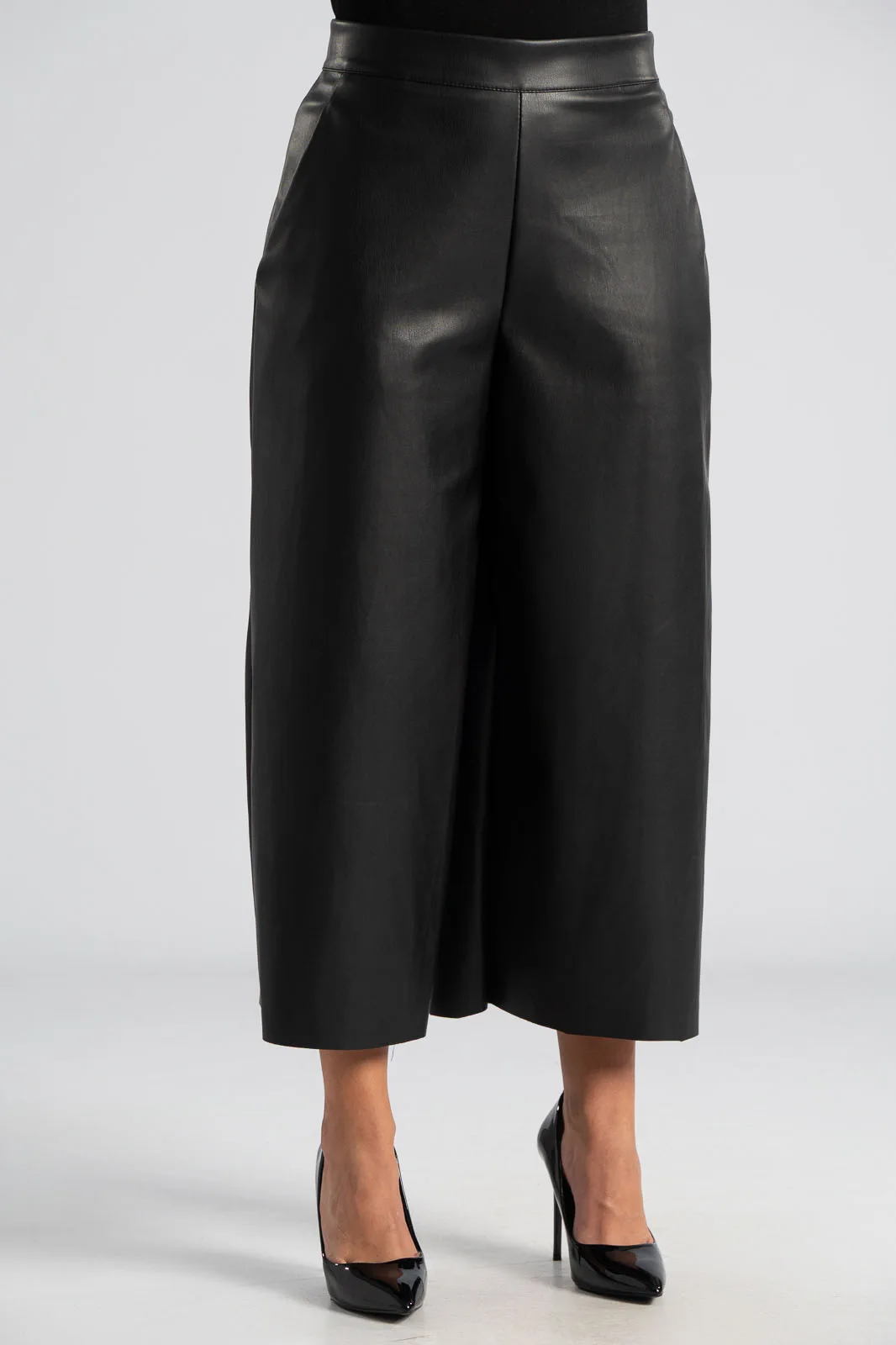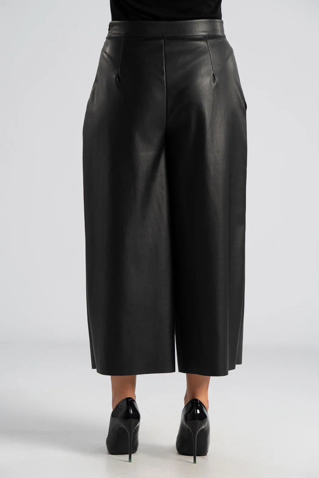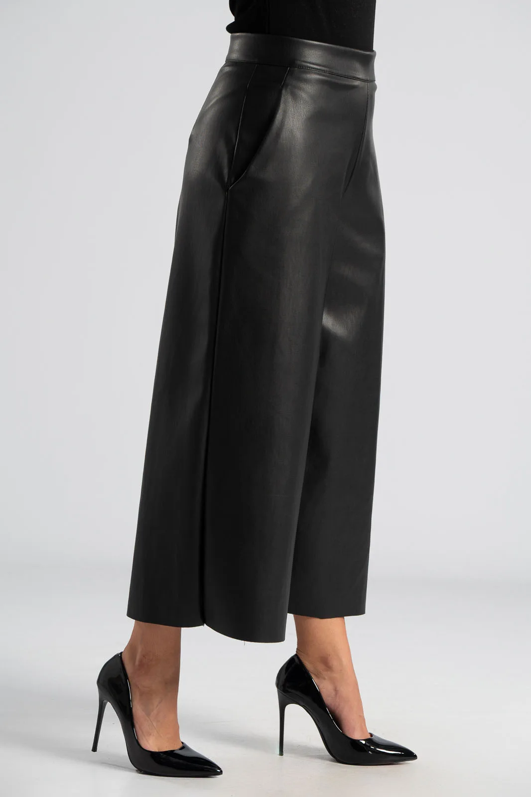 Trousers made of high-quality leatherette. Fastens with a zipper on the side. Straight cut. Lightweight suede lining. Pockets on the sides. The measurements in the table are representative of each product. 50% polyester, 50% poliutherane.