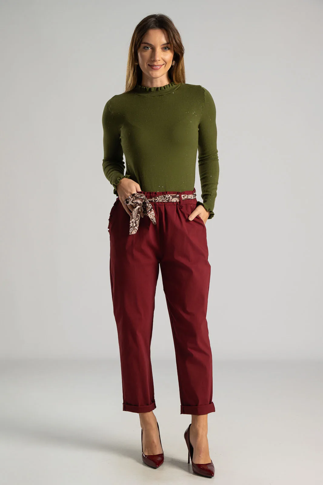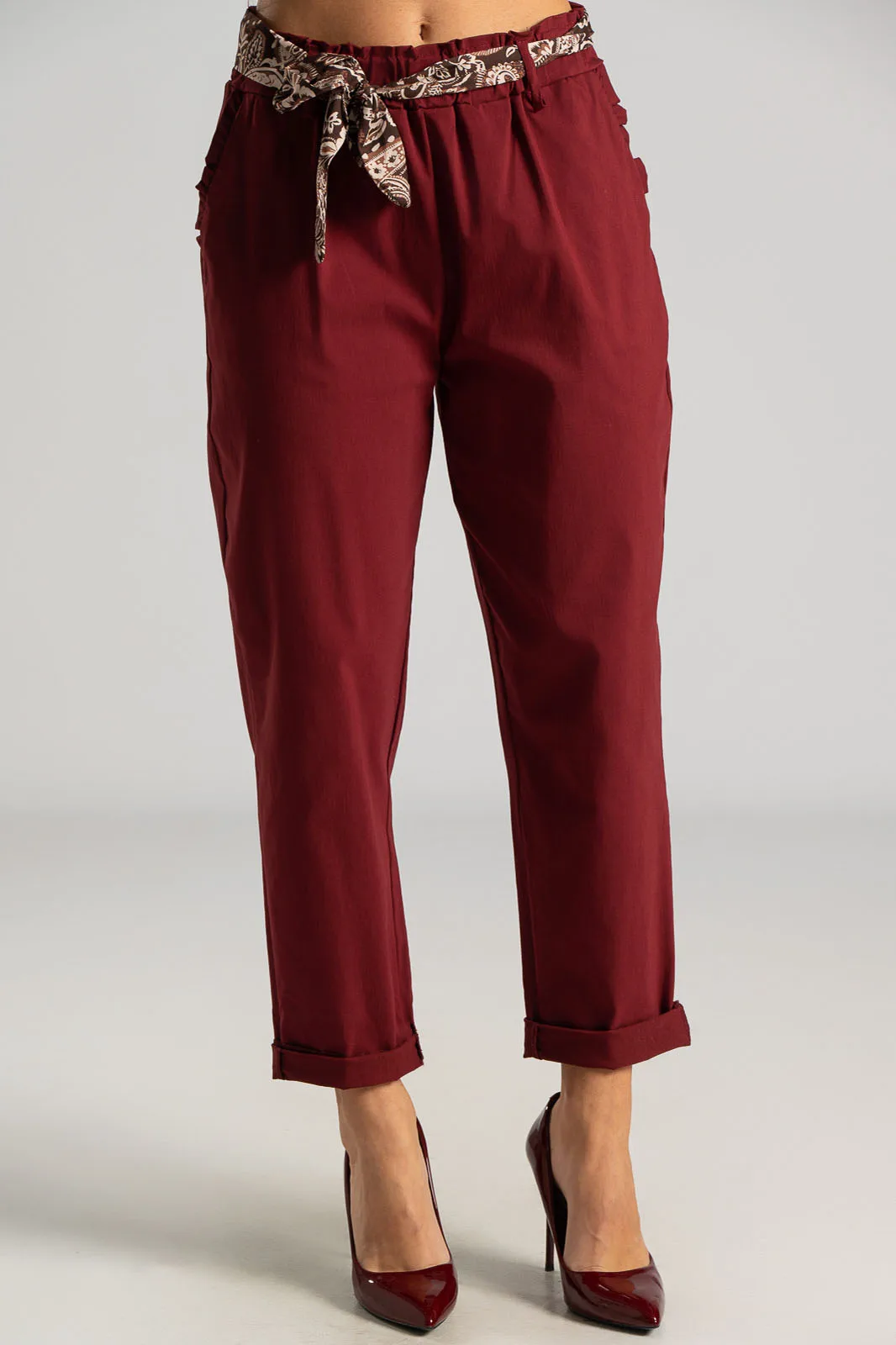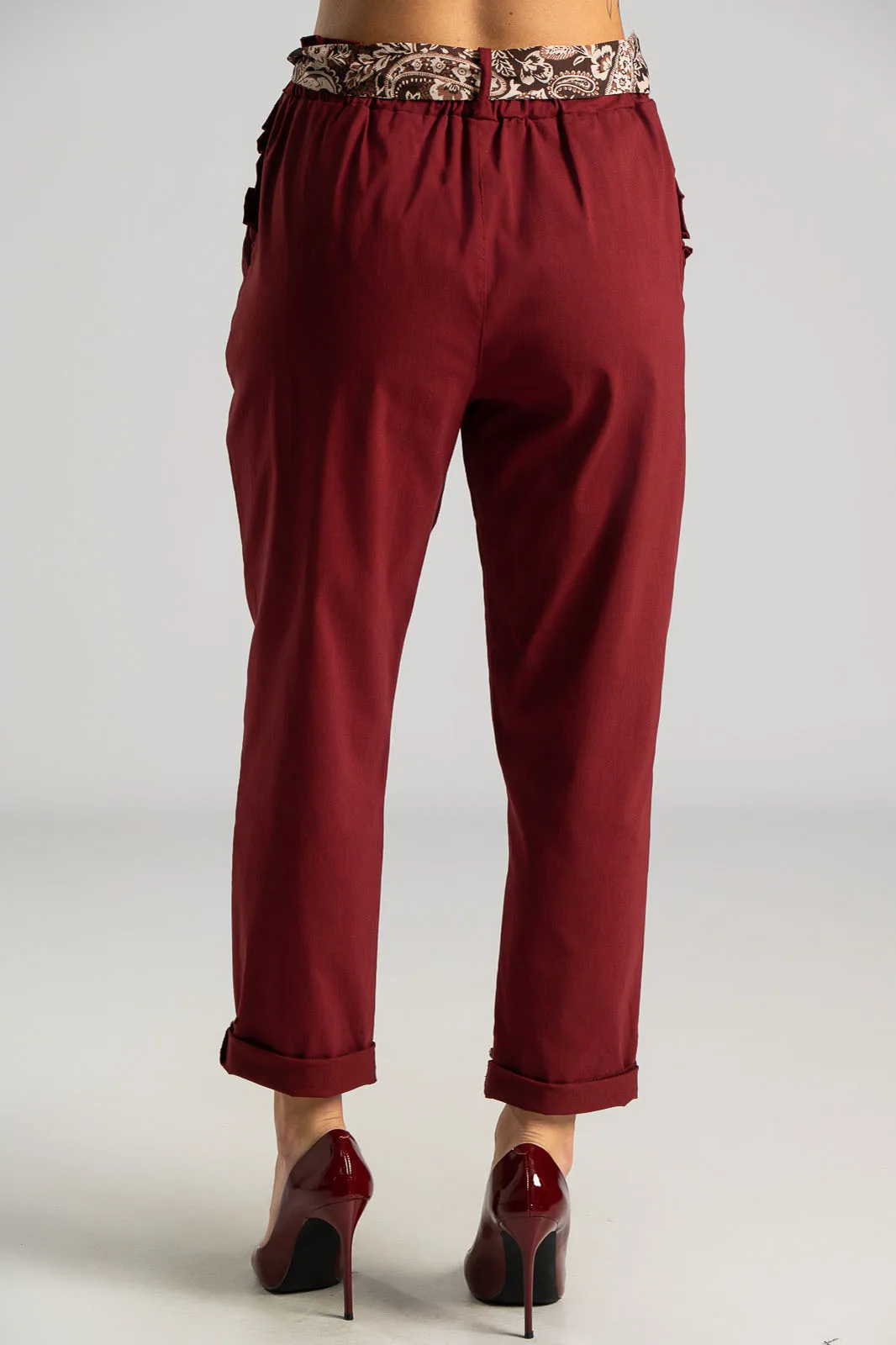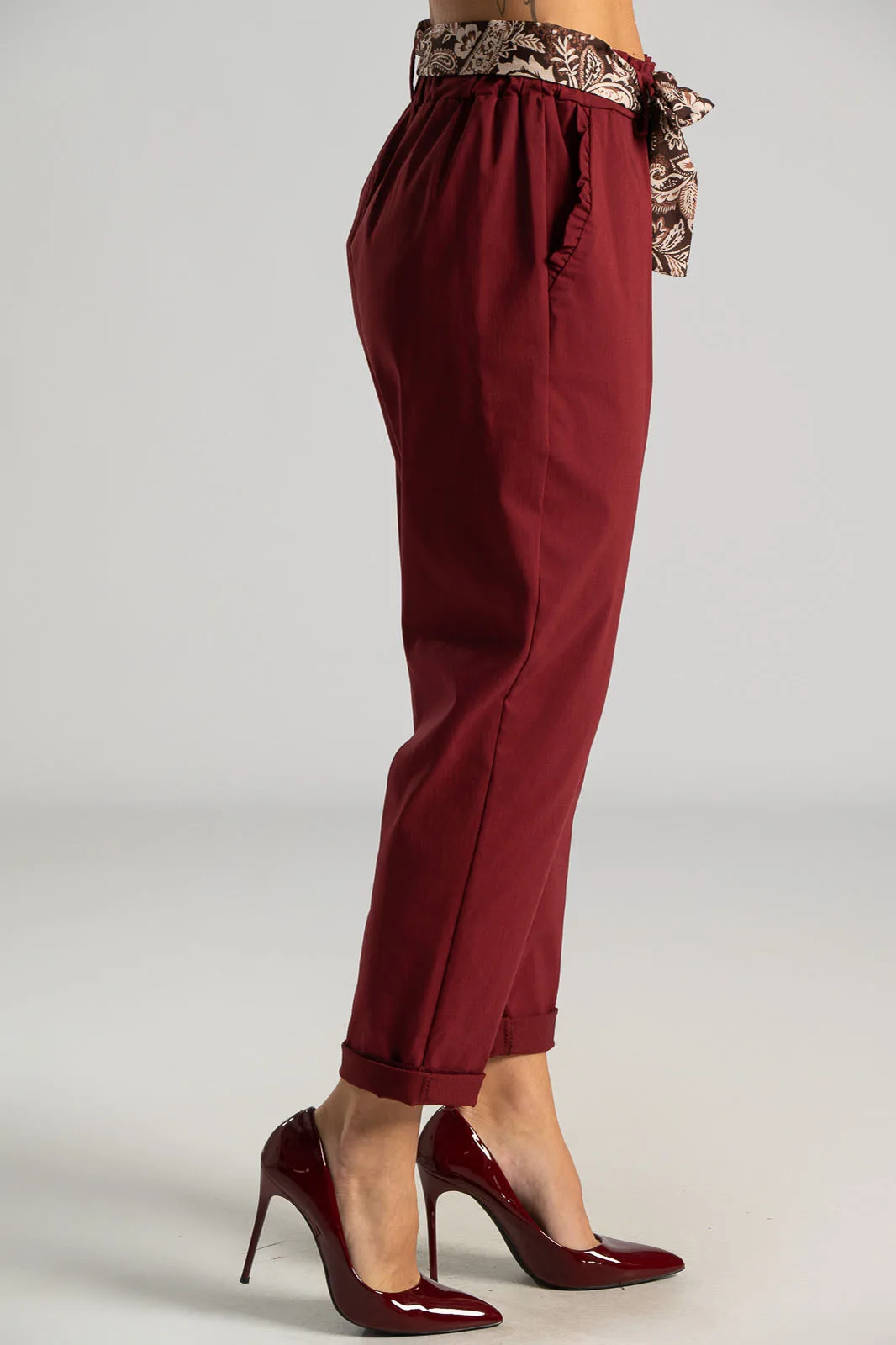 Παντελόνι γραφείου ελαστικό. Στη μέση έχει λάστιχο τύπου paperbag και φουλάρι. Έχει πλαϊνές τσέπες διακοσμημένες με βολάν. Ακολουθεί τη γραμμή του σώματος. Οι μετρήσεις του πίνακα είναι αντιπροσωπευτικές για κάθε κωδικό. 75% viscose, 22% nylon, 3% elastan.