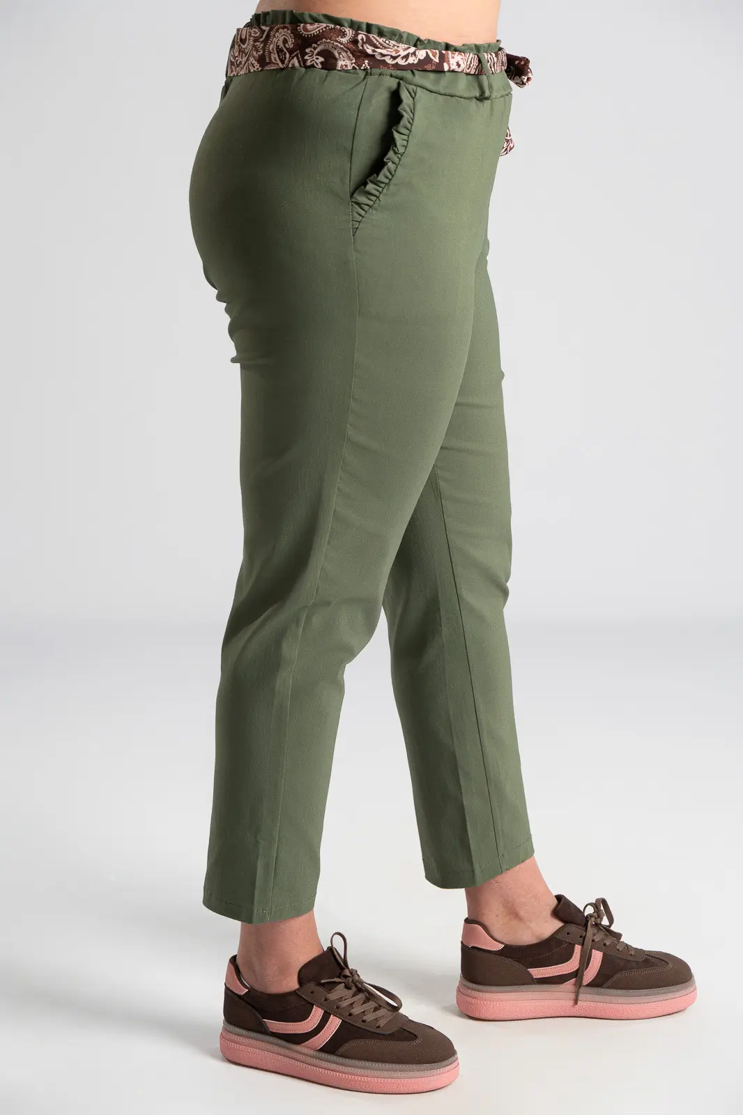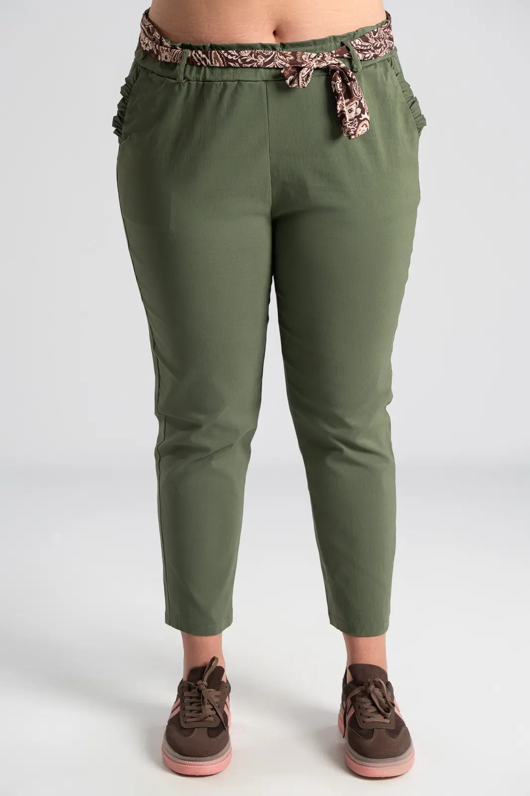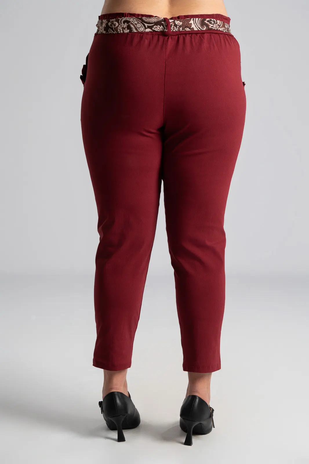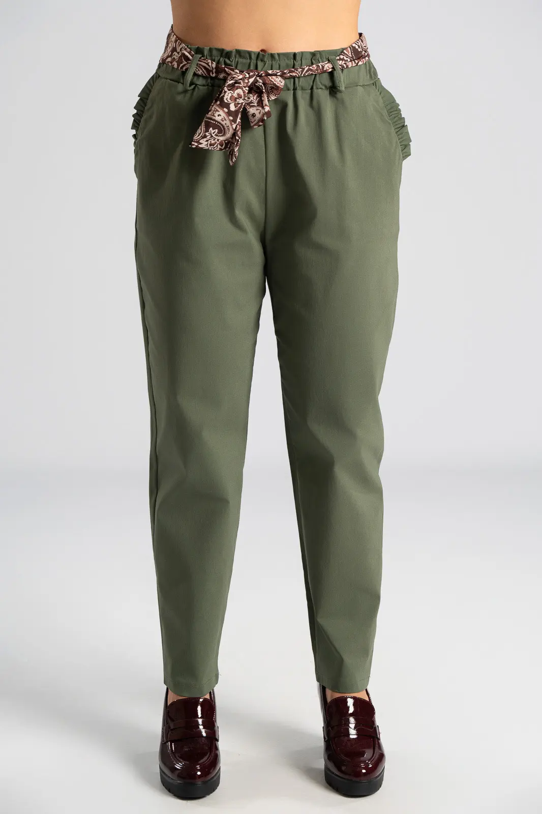 Elastic office trousers. They have a paperbag-style elastic waistband and a scarf. It has side pockets decorated with ruffles. It follows the line of the body. The measurements in the table are representative for each code. 75% viscose, 22% nylon, 3% elastane.