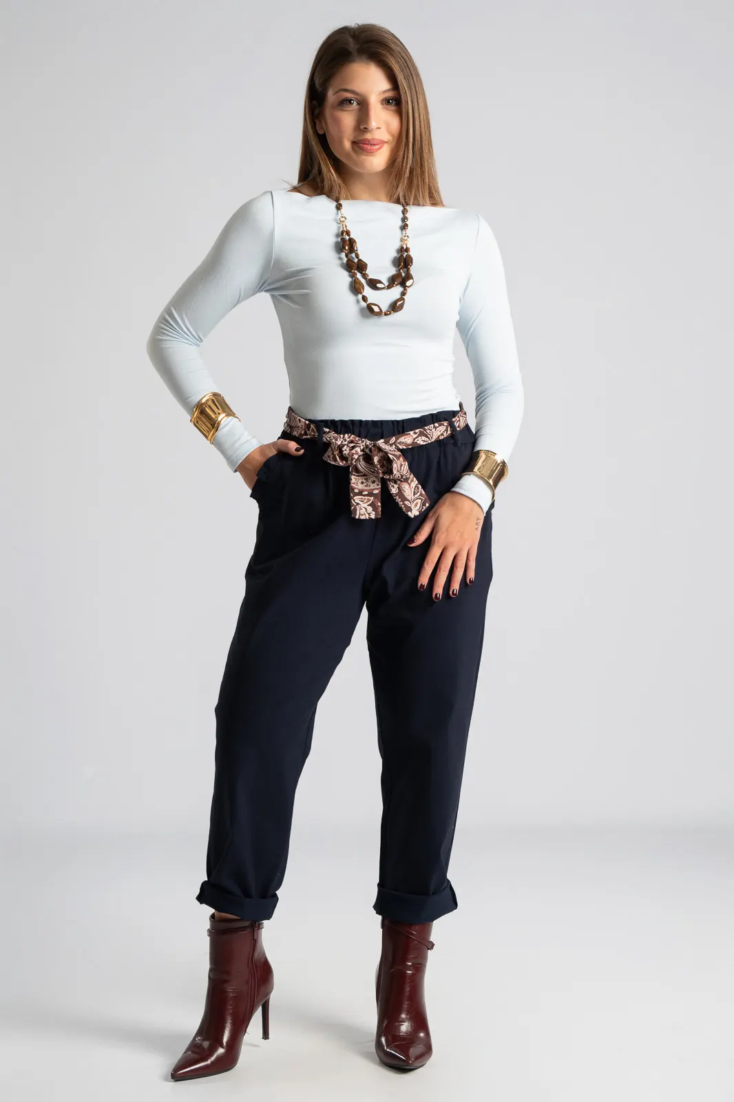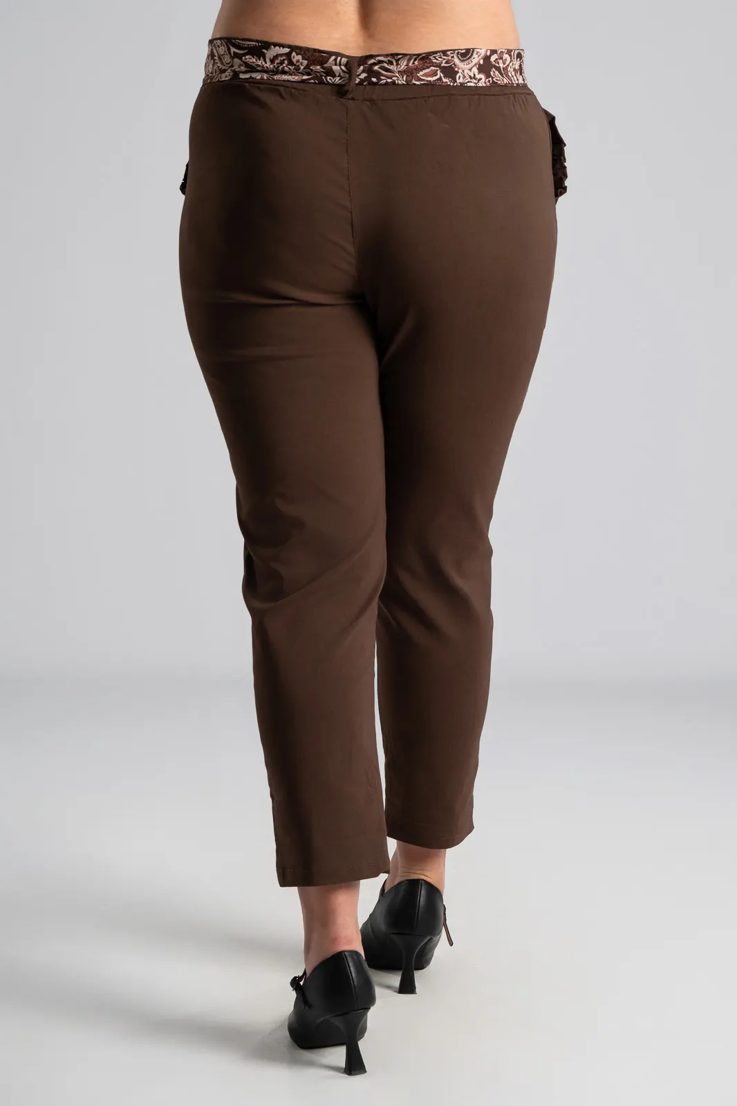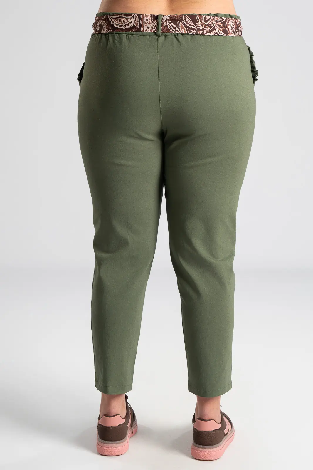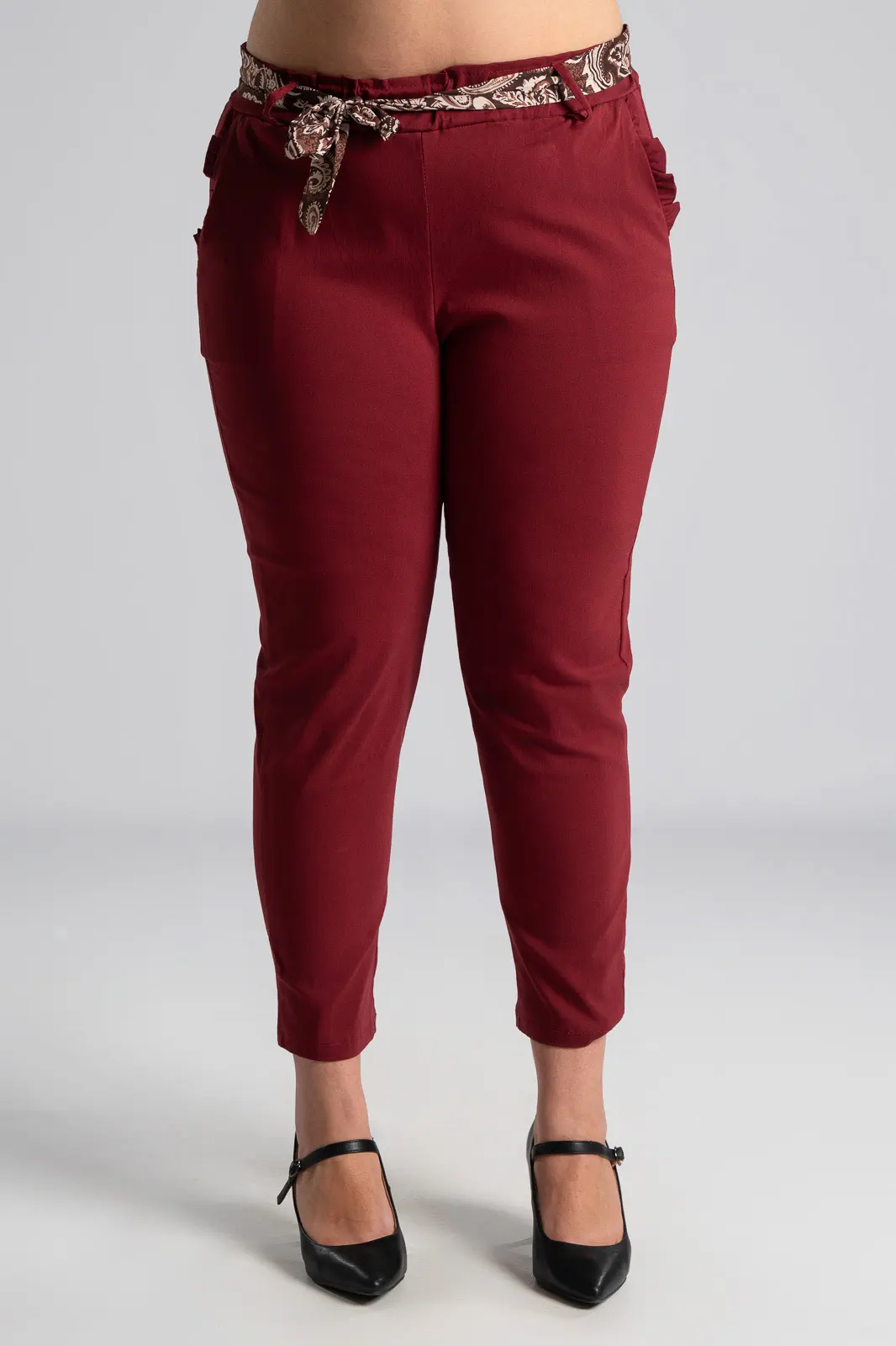 Elastic office trousers. They have a paperbag-style elastic waistband and a scarf. It has side pockets decorated with ruffles. It follows the line of the body. The measurements in the table are representative for each code. 75% viscose, 22% nylon, 3% elastane.