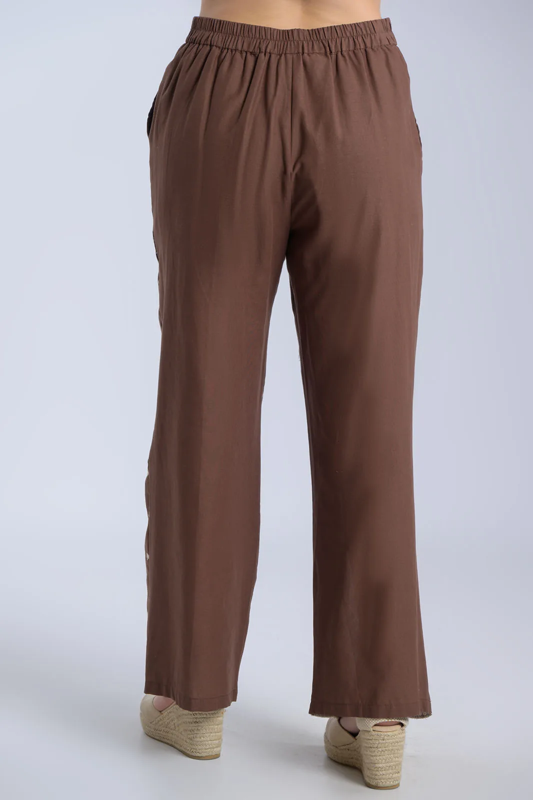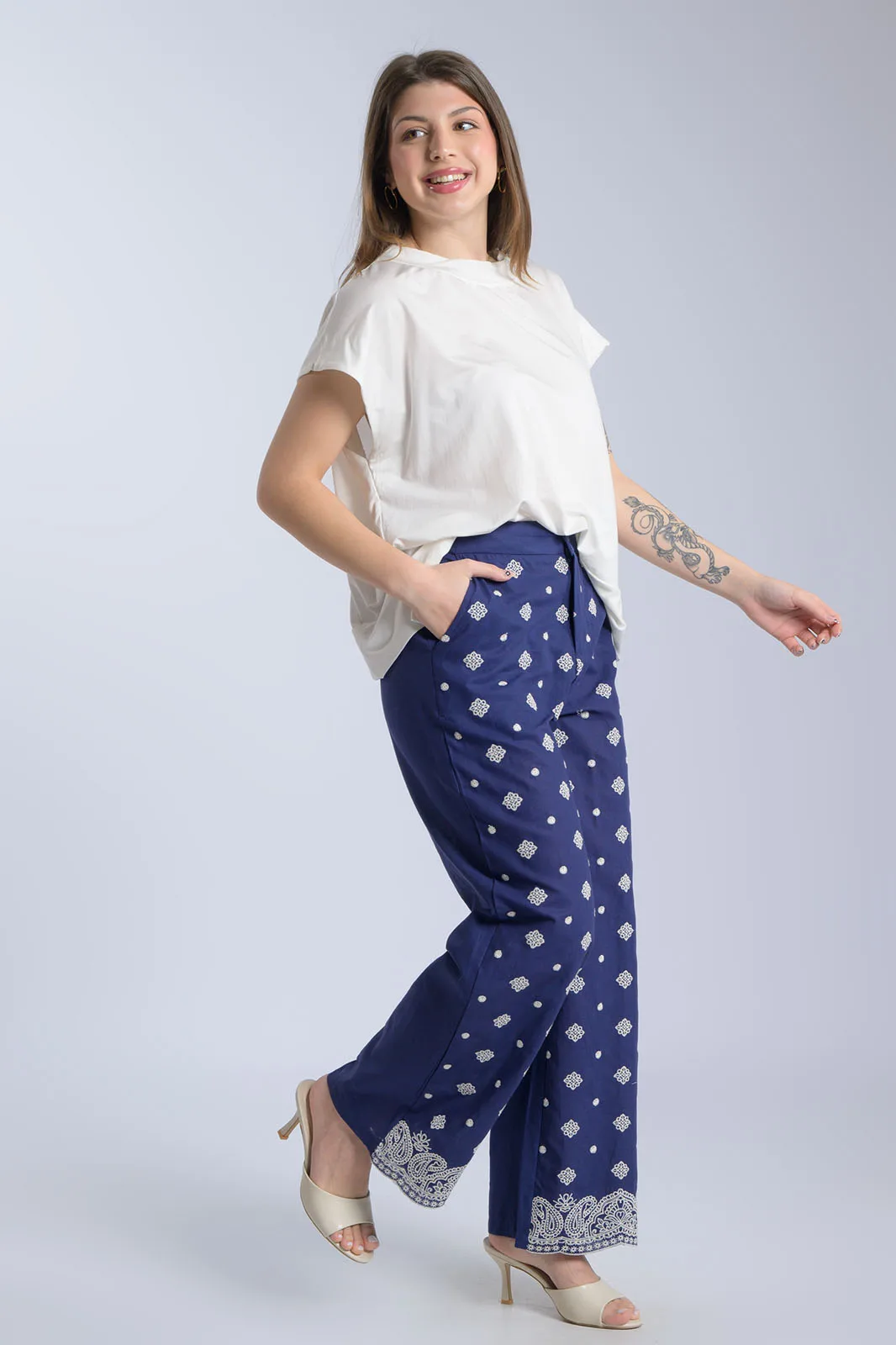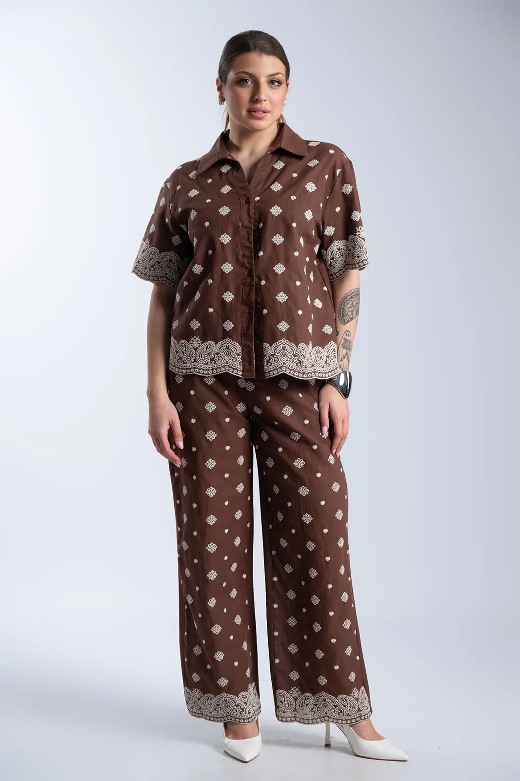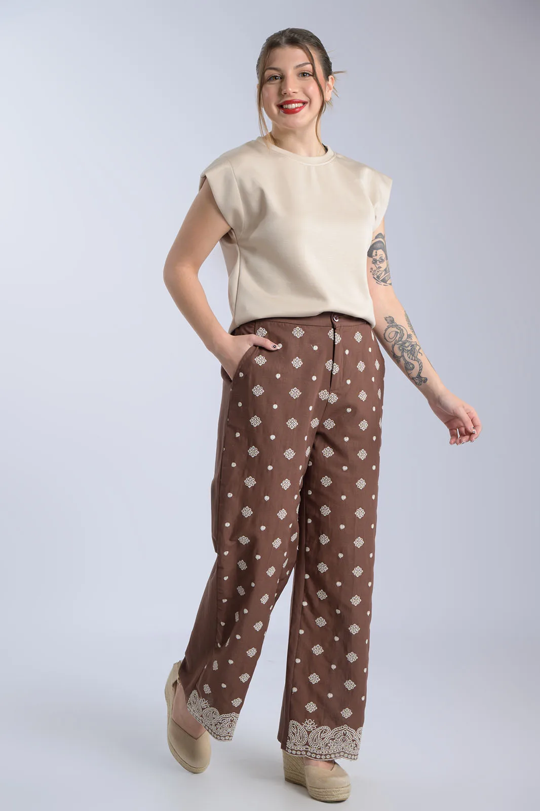 Άνετο και κομψό παντελόνι κάπρι σε ανάλαφρη γραμμή, ιδανικό για καθημερινές καλοκαιρινές εμφανίσεις. Διαθέτει ελαστική μέση στο πίσω μέρος, ενώ το διακριτικό all-over μοτίβο με κεντημένες λεπτομέρειες χαρίζει ιδιαίτερο χαρακτήρα. Κλείνει με κουμπί και φερμουάρ και έχει πλαινές τσέπες για πρακτικότητα.