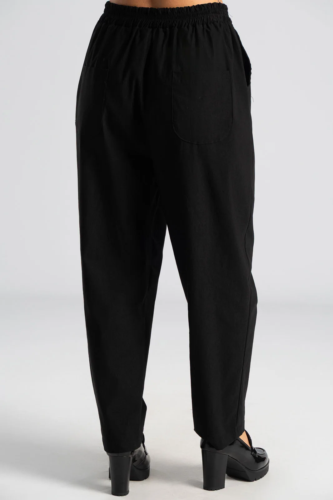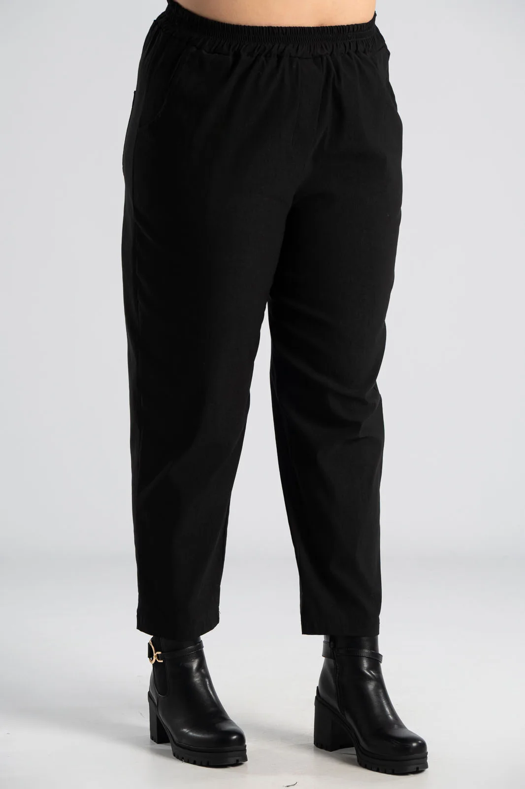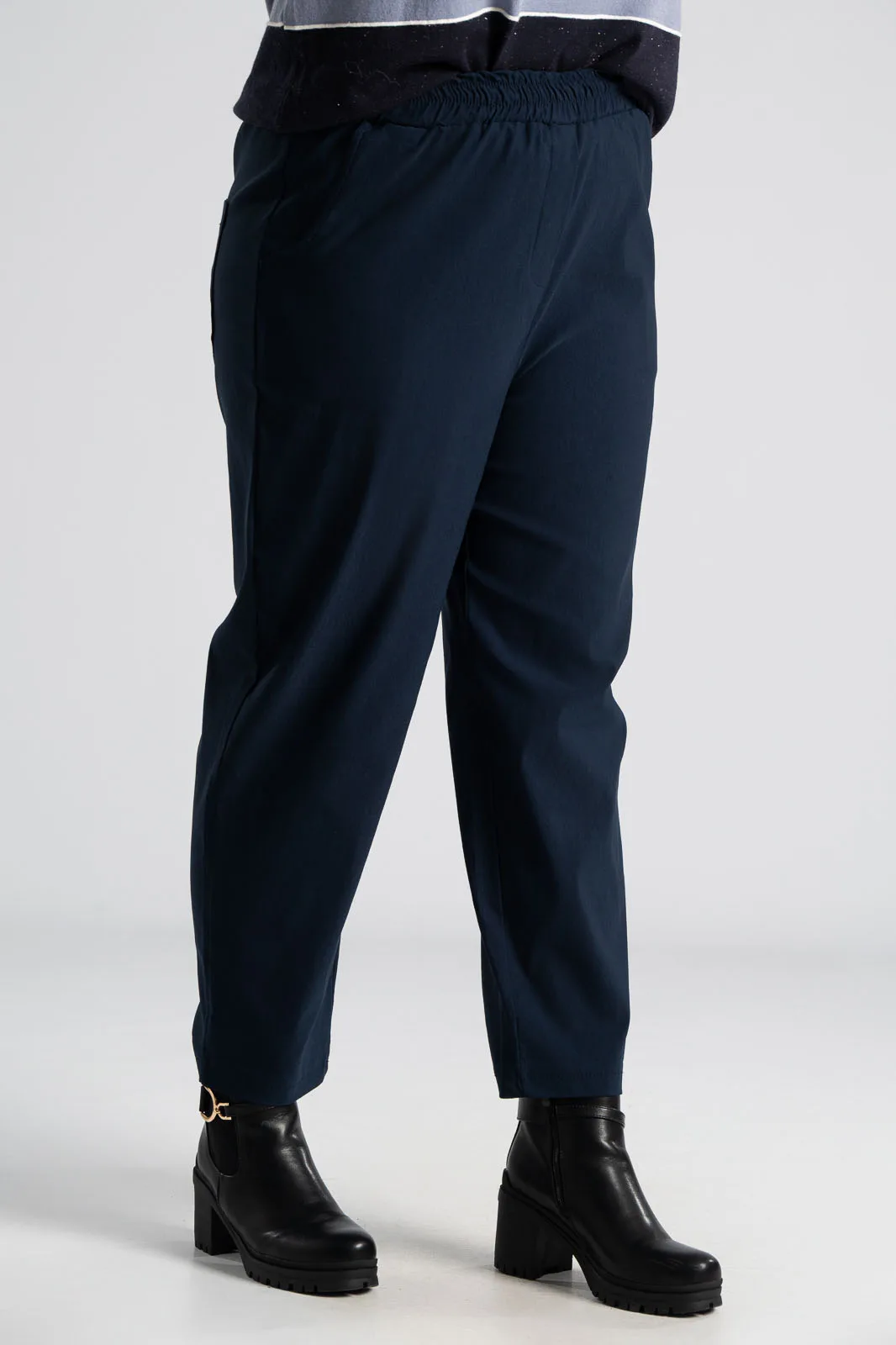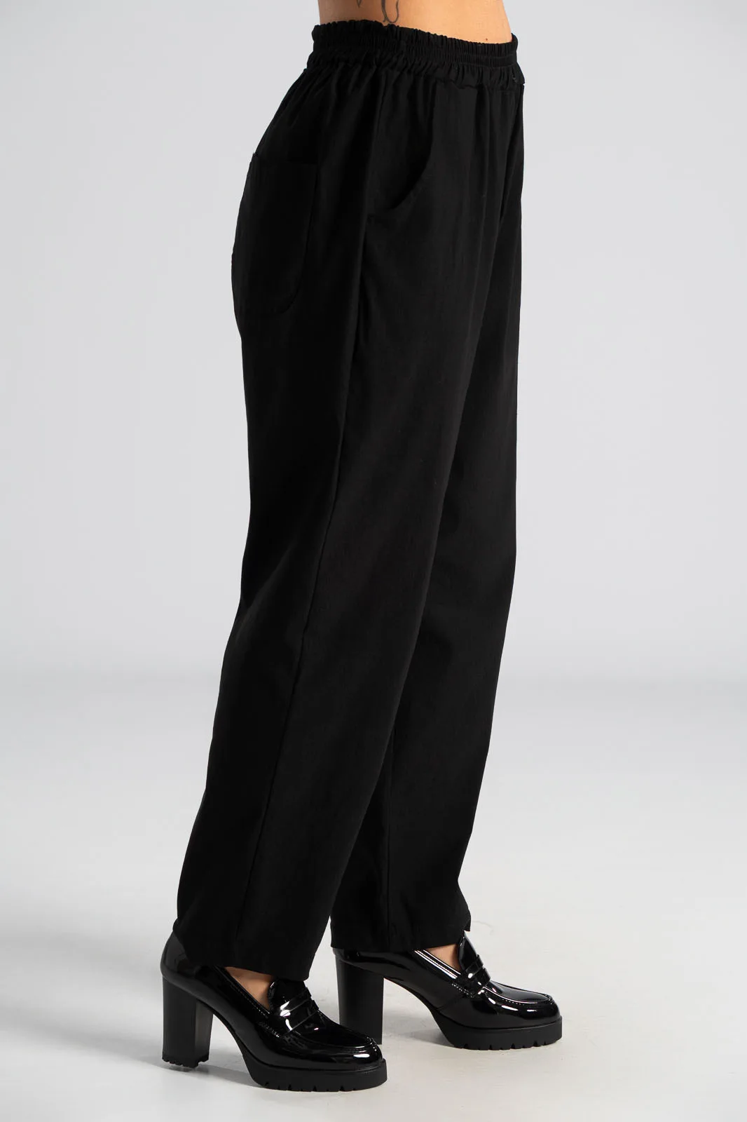Παντελόνι με λάστιχο στη μέση περιμετρικά. Έχει πλαϊνές τσέπες και δύο στο πίσω μέρος. Είναι σε ίσια γραμμή και στενεύει ελαφρώς στο τελείωμα. Έχει εξαιρετική ποιότητα. Οι μετρήσεις του πίνακα είναι αντιπροσωπευτικές για κάθε κωδικό. 79% viscose, 19% nylon, 2% elastan.