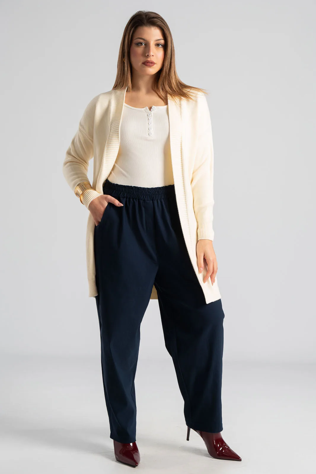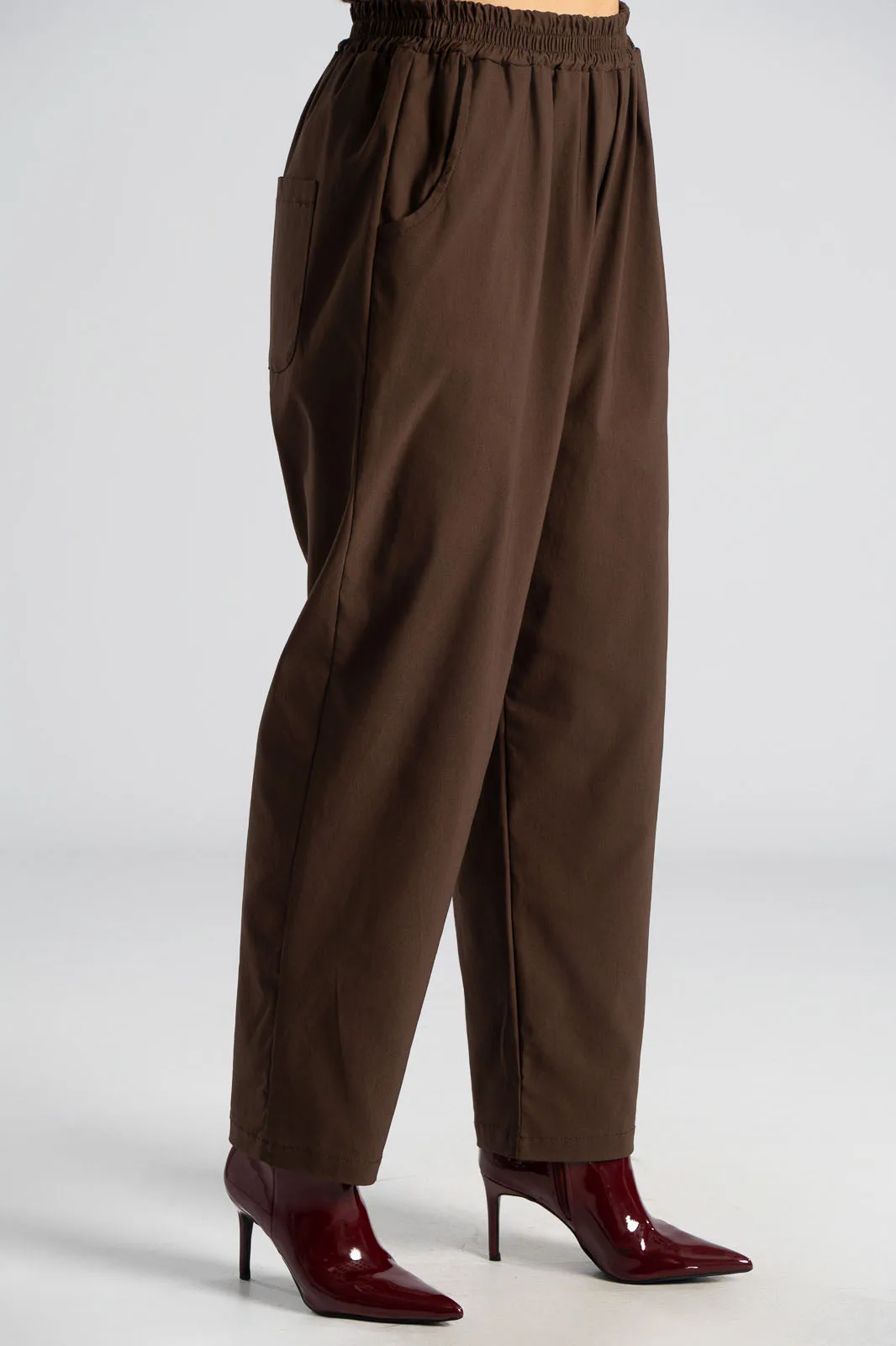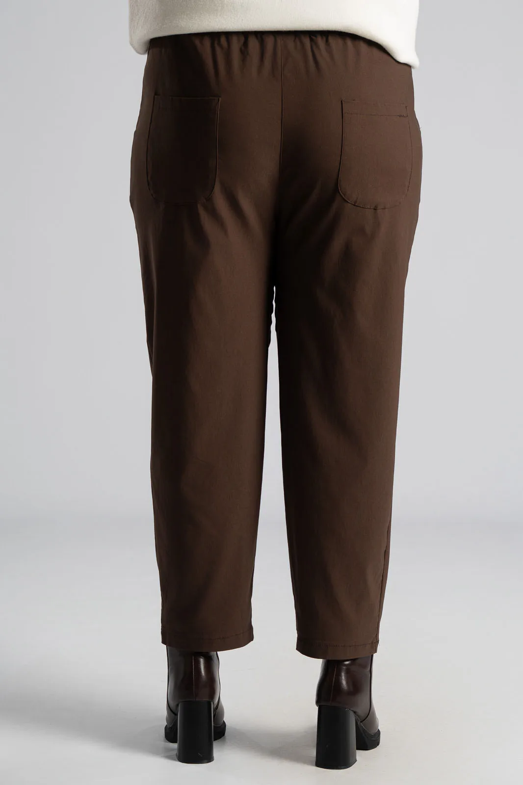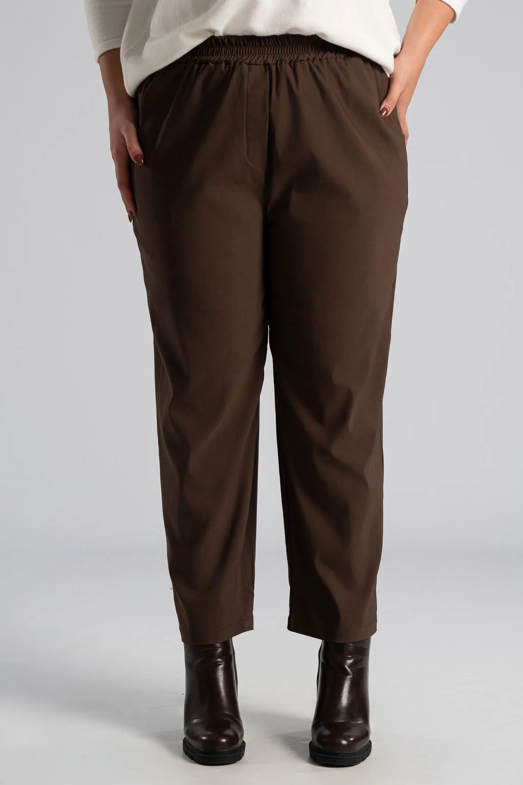 Παντελόνι με λάστιχο στη μέση περιμετρικά. Έχει πλαϊνές τσέπες και δύο στο πίσω μέρος. Είναι σε ίσια γραμμή και στενεύει ελαφρώς στο τελείωμα. Έχει εξαιρετική ποιότητα. Οι μετρήσεις του πίνακα είναι αντιπροσωπευτικές για κάθε κωδικό. 79% viscose, 19% nylon, 2% elastan.
