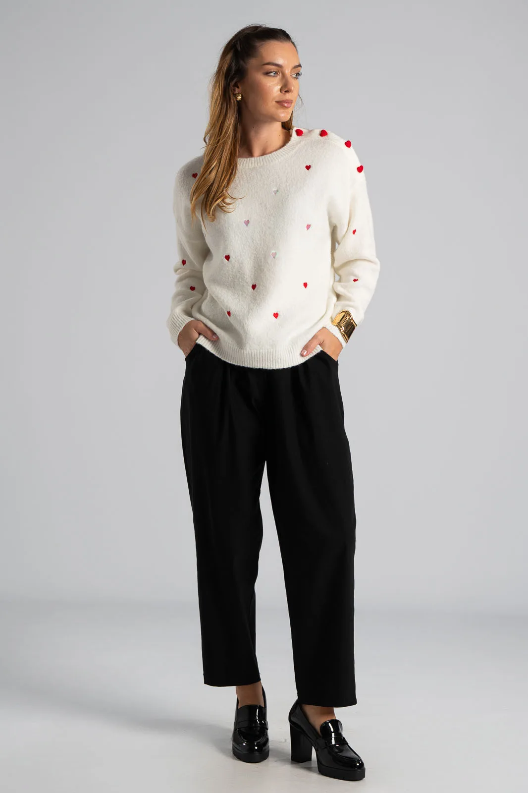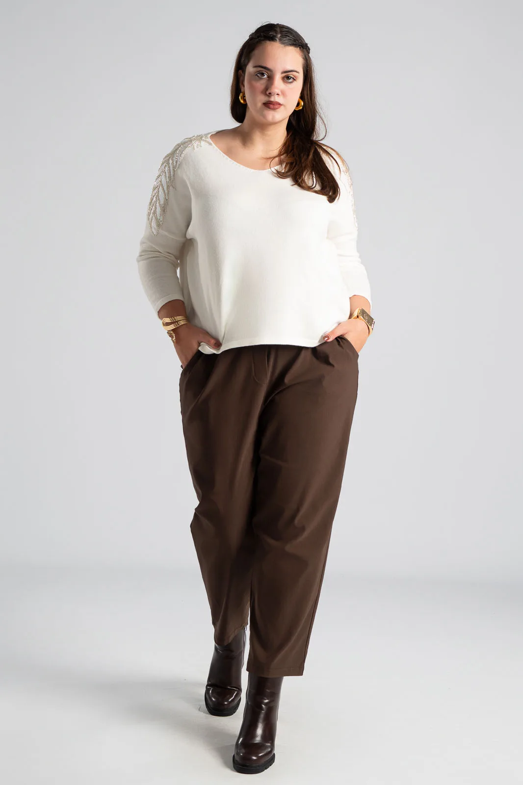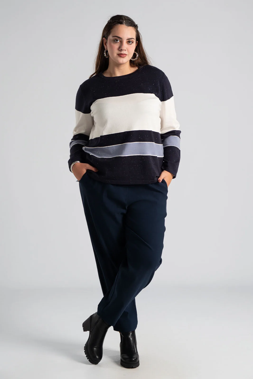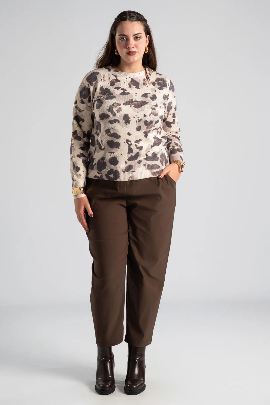 Παντελόνι με λάστιχο στη μέση περιμετρικά. Έχει πλαϊνές τσέπες και δύο στο πίσω μέρος. Είναι σε ίσια γραμμή και στενεύει ελαφρώς στο τελείωμα. Έχει εξαιρετική ποιότητα. Οι μετρήσεις του πίνακα είναι αντιπροσωπευτικές για κάθε κωδικό. 79% viscose, 19% nylon, 2% elastan.