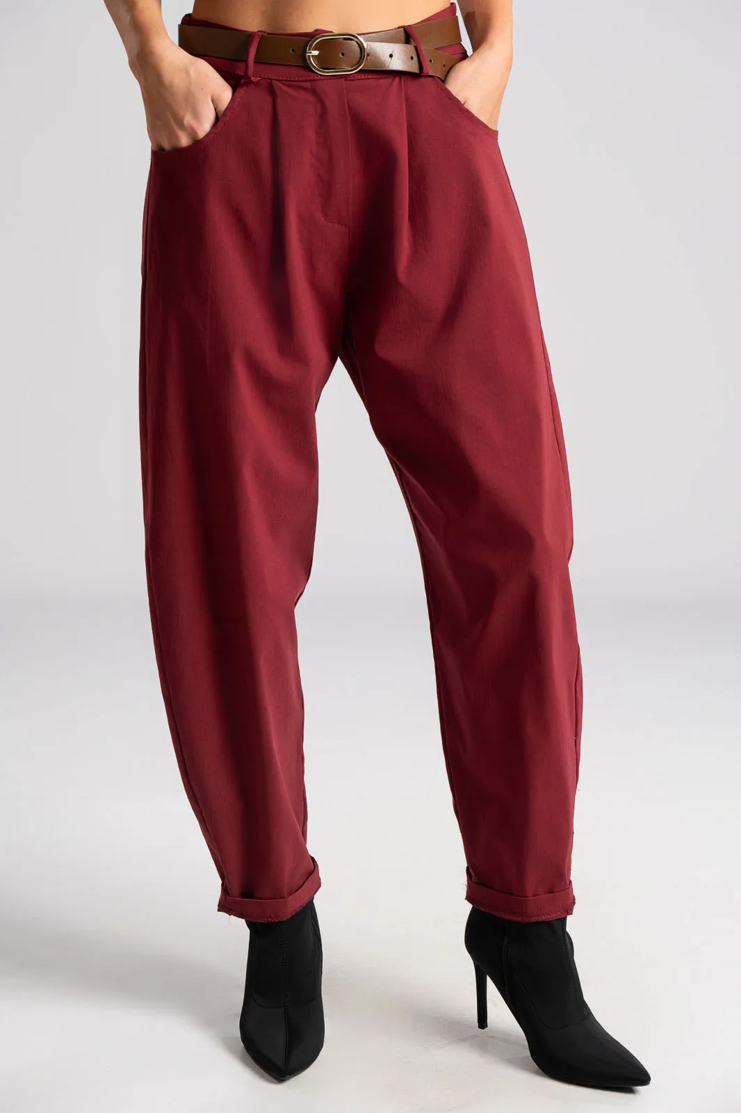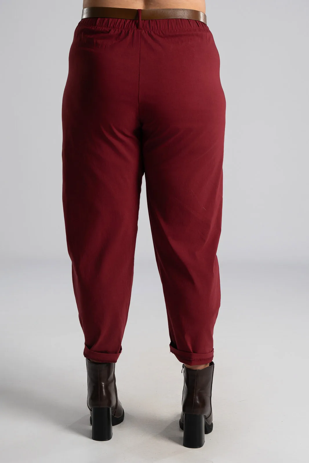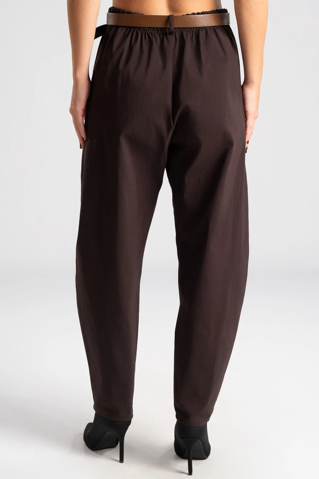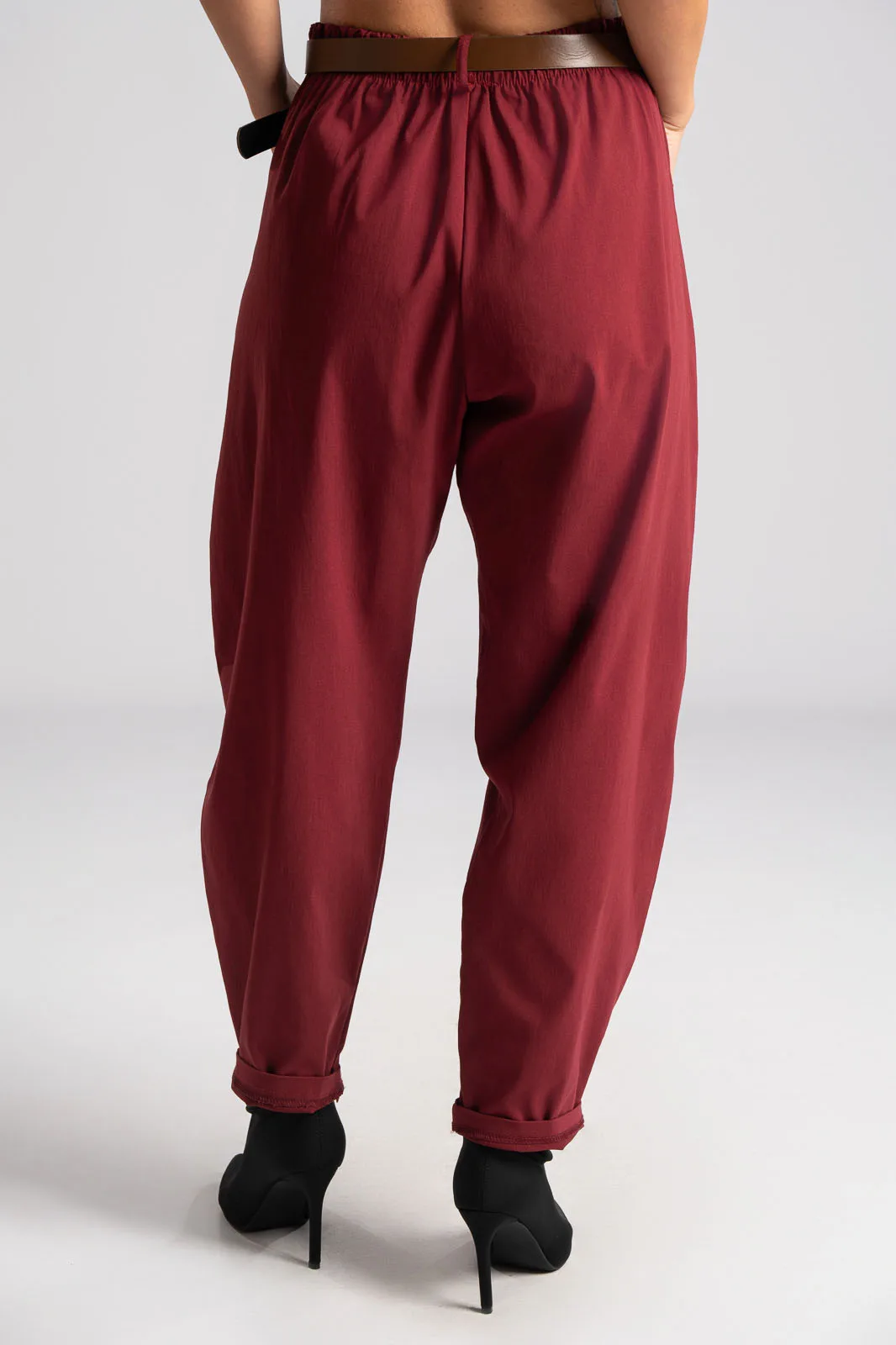 Slouchy pants with elastic at the back for a better fit. They have side pockets and a waist/">high waist. They come with their own leatherette belt. Pleats at the front. The measurements in the table are representative of each product. 75% viscose, 22% nylon, 3% elastane.
