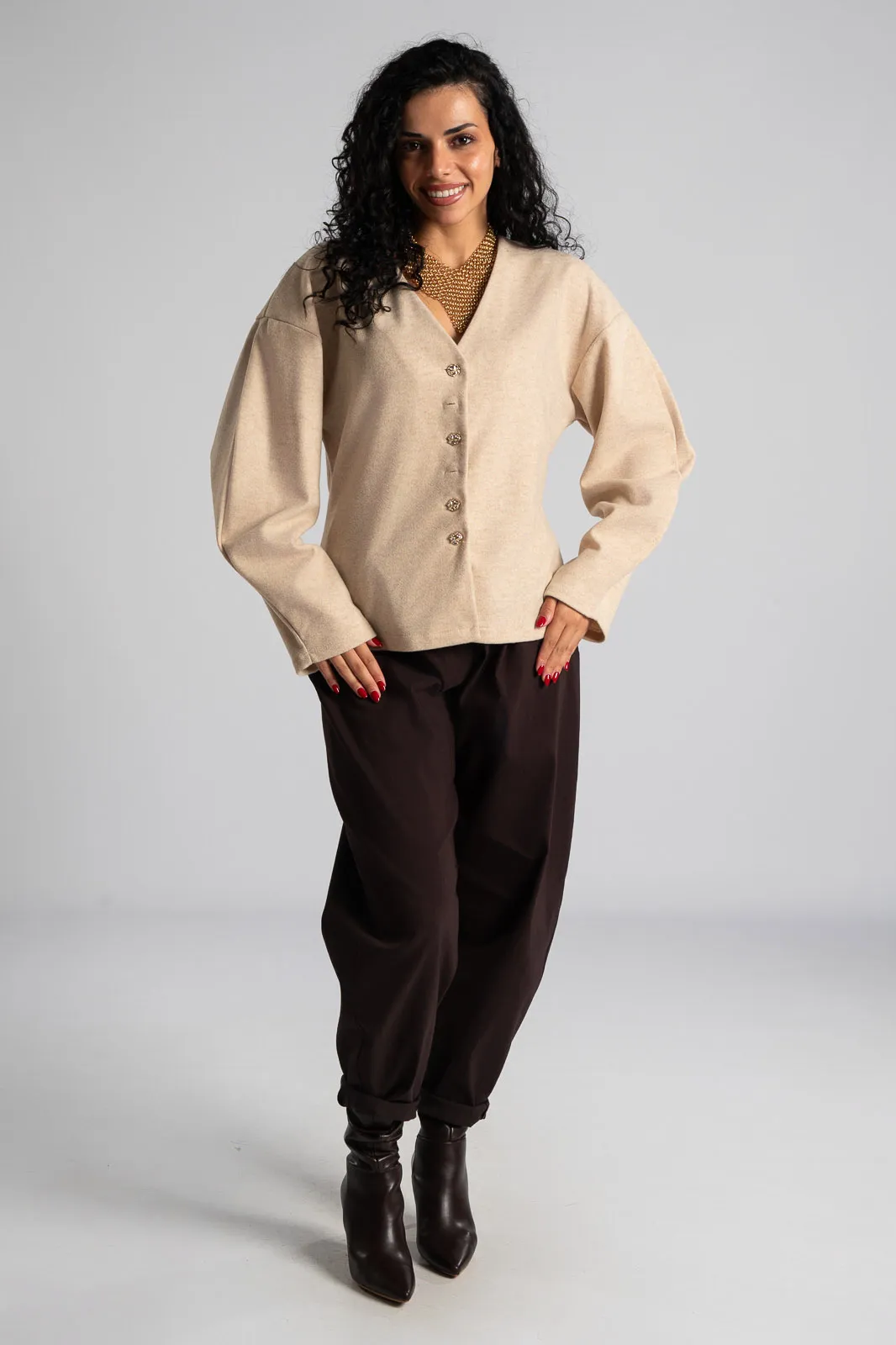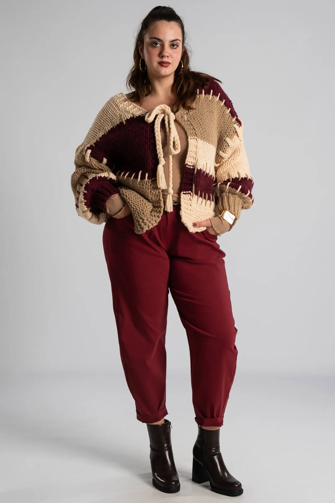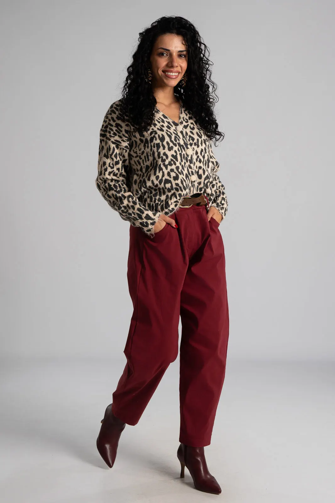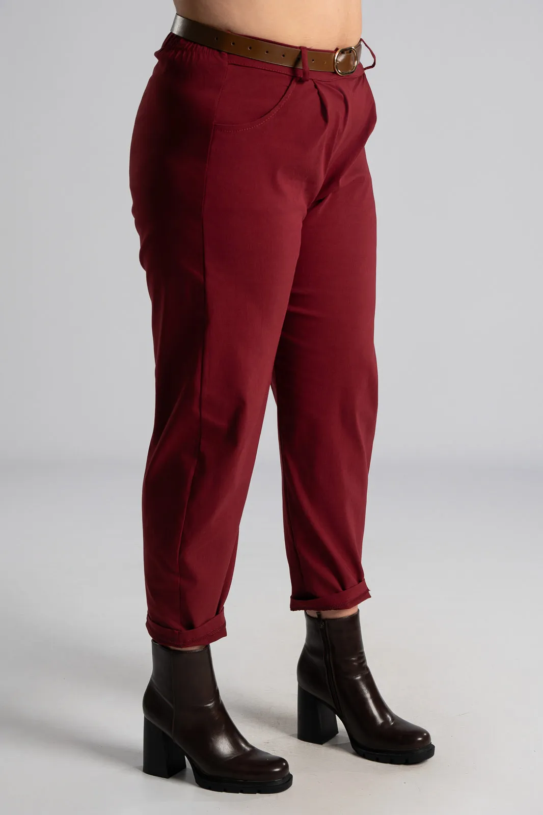 Slouchy pants with elastic at the back for a better fit. They have side pockets and a waist/">high waist. They come with their own leatherette belt. Pleats at the front. The measurements in the table are representative of each product. 75% viscose, 22% nylon, 3% elastane.