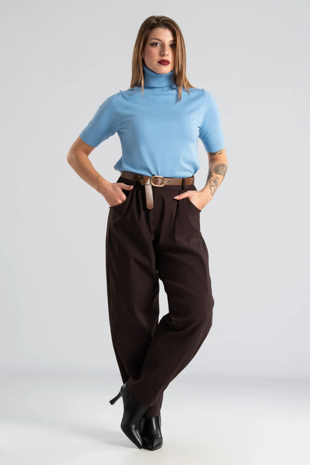 Παντελόνι τύπου slouchy με λάστιχο στο πίσω μέρος για καλύτερη εφαρμογή. Έχει πλαϊνές τσέπες και είναι ψηλόμεσο. Διαθέτει δική του ζώνη δερματίνη. Στο μπροστινό μέρος έχει πιέτες. Οι μετρήσεις του πίνακα είναι αντιπροσωπευτικές για κάθε προϊόν. 75% viscose, 22% nylon, 3% elastan.