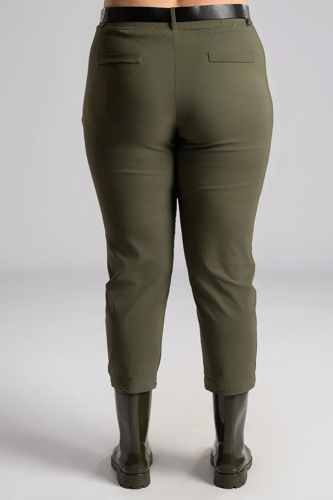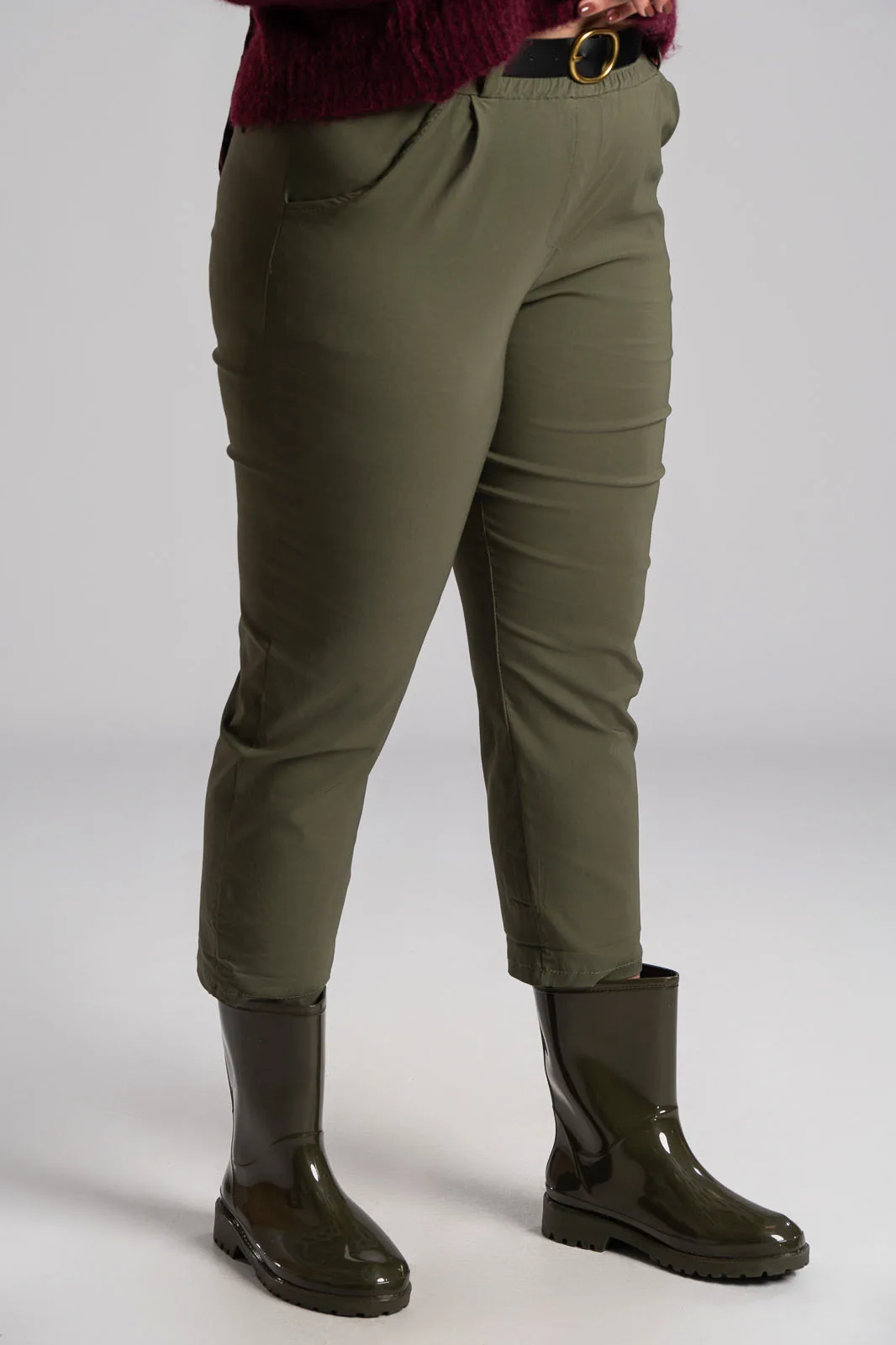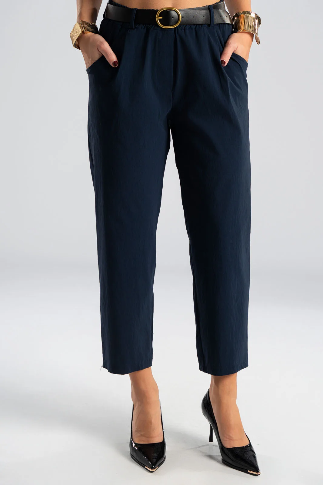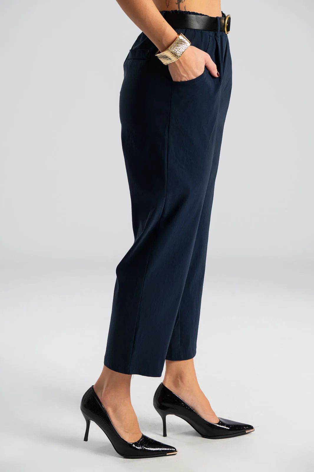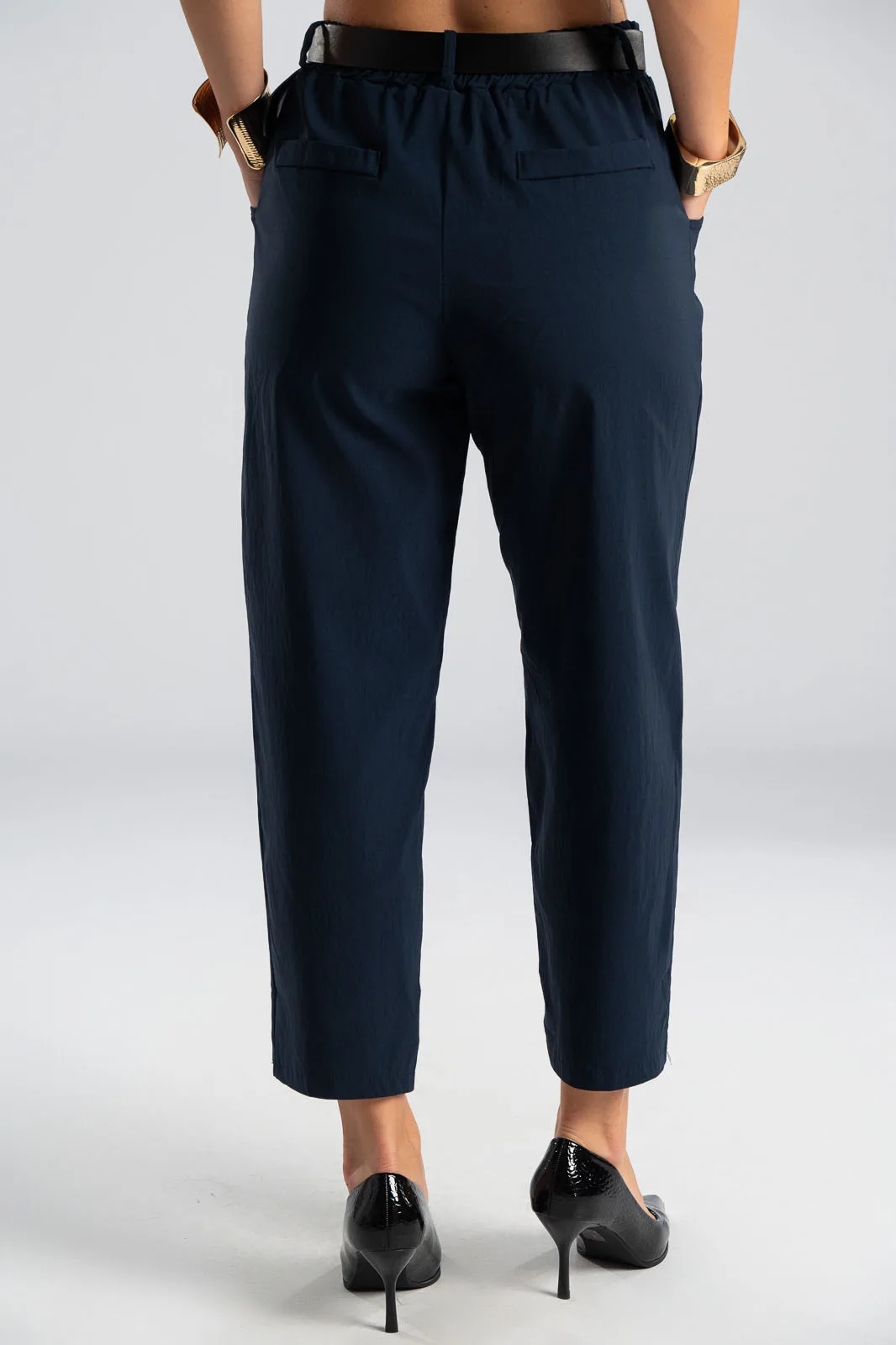 Παντελόνι με λάστιχο στην μέση. Διαθέτει ζώνη για καλύτερη εφαρμογή. Έχει πλαινές τσέπες. Έχει απαλή υφή. Στο πίσω μέρος έχει τσέπες με ρέλι. Οι μετρήσεις του πίνακα είναι αντιπροσωπευτικές για κάθε κωδικό. 65% viscose, 32% polyamide, 3% elastan.
