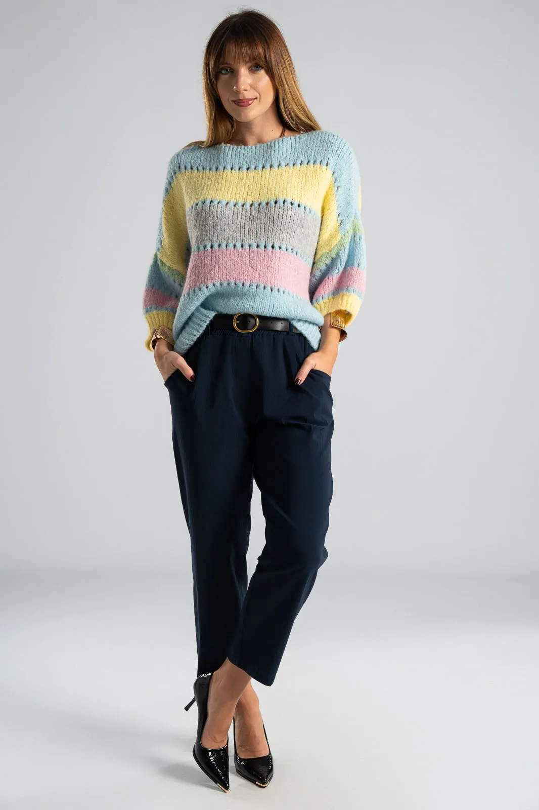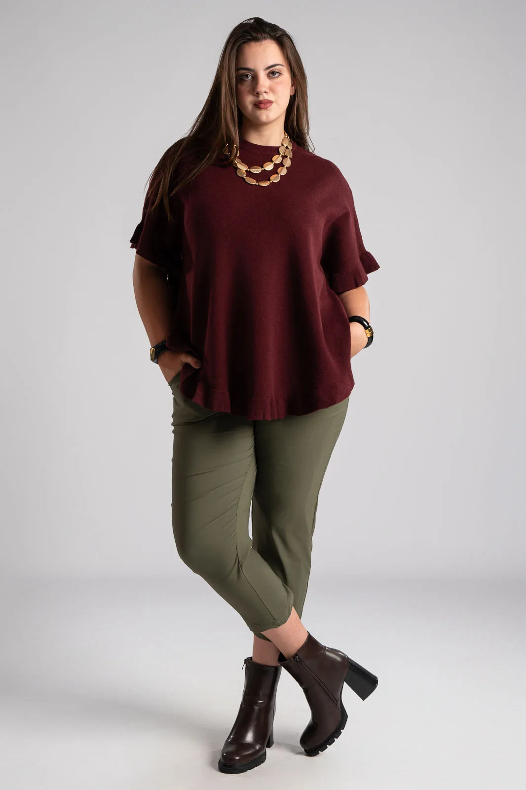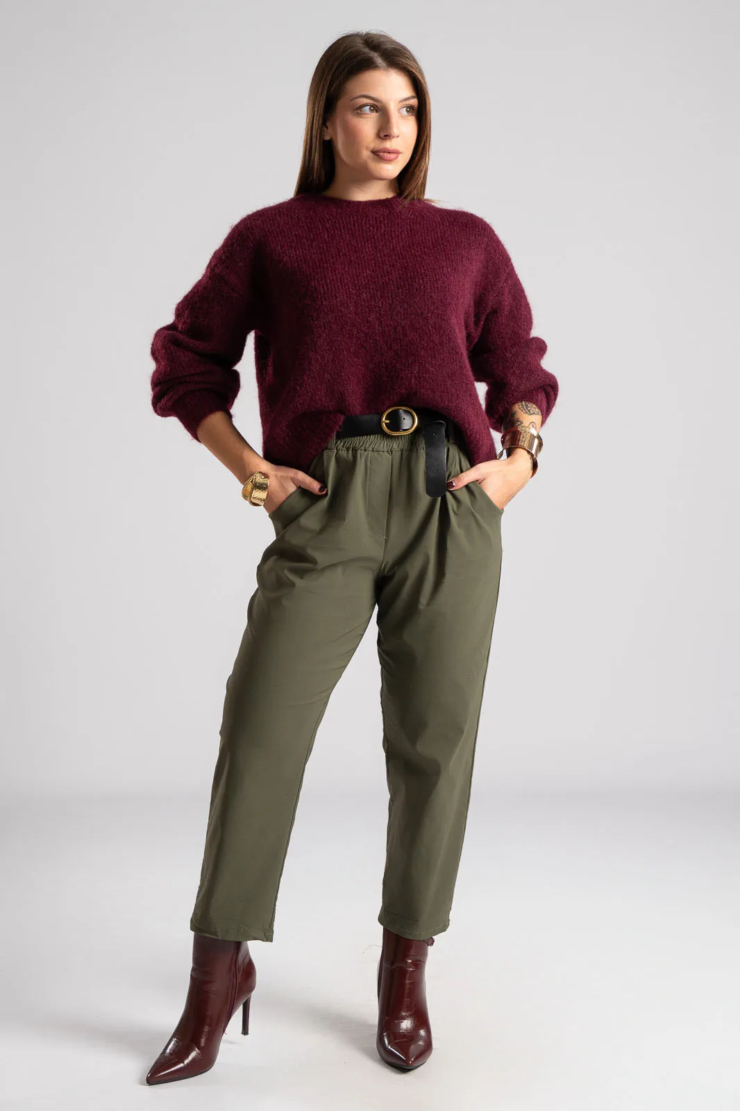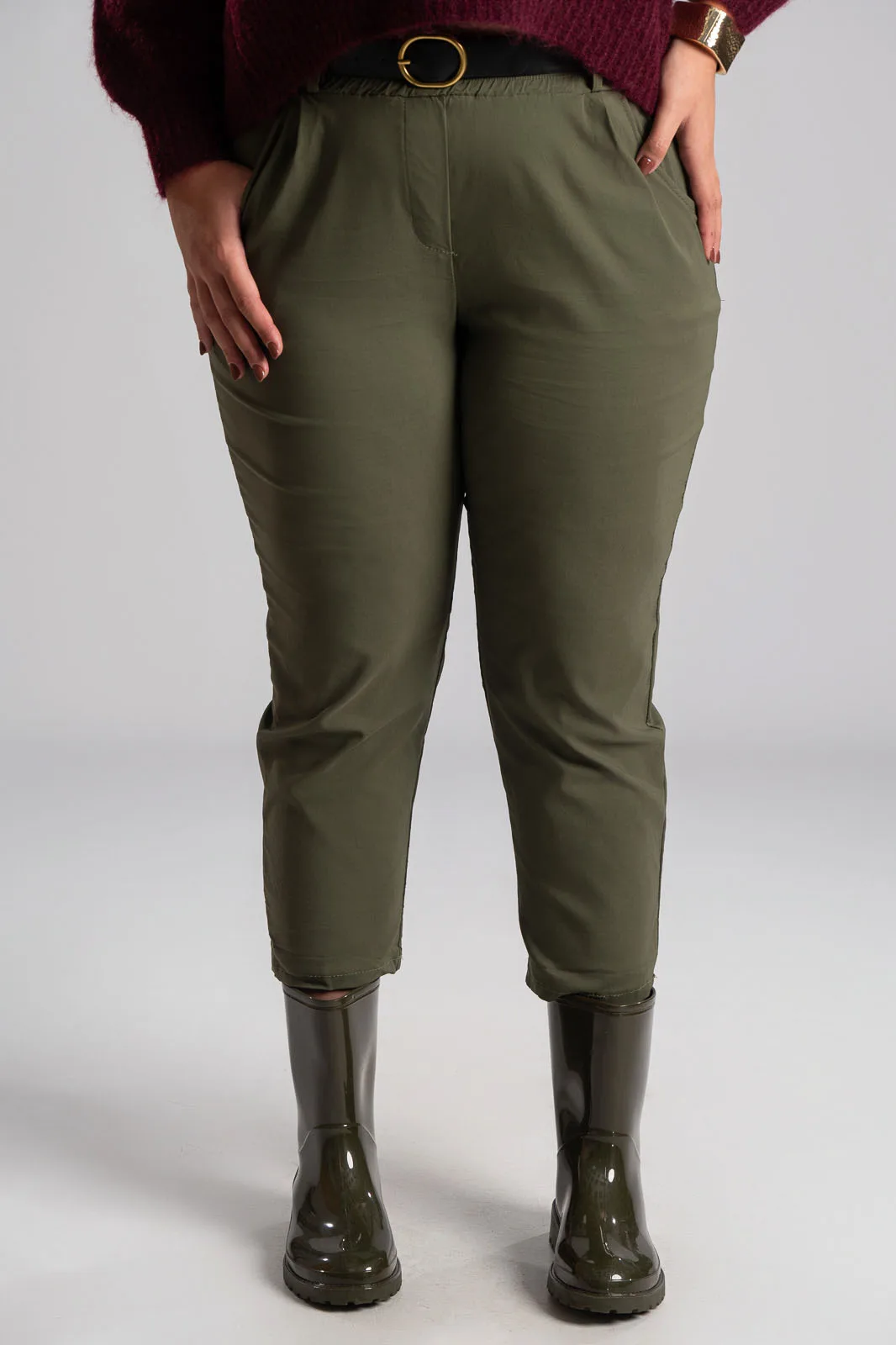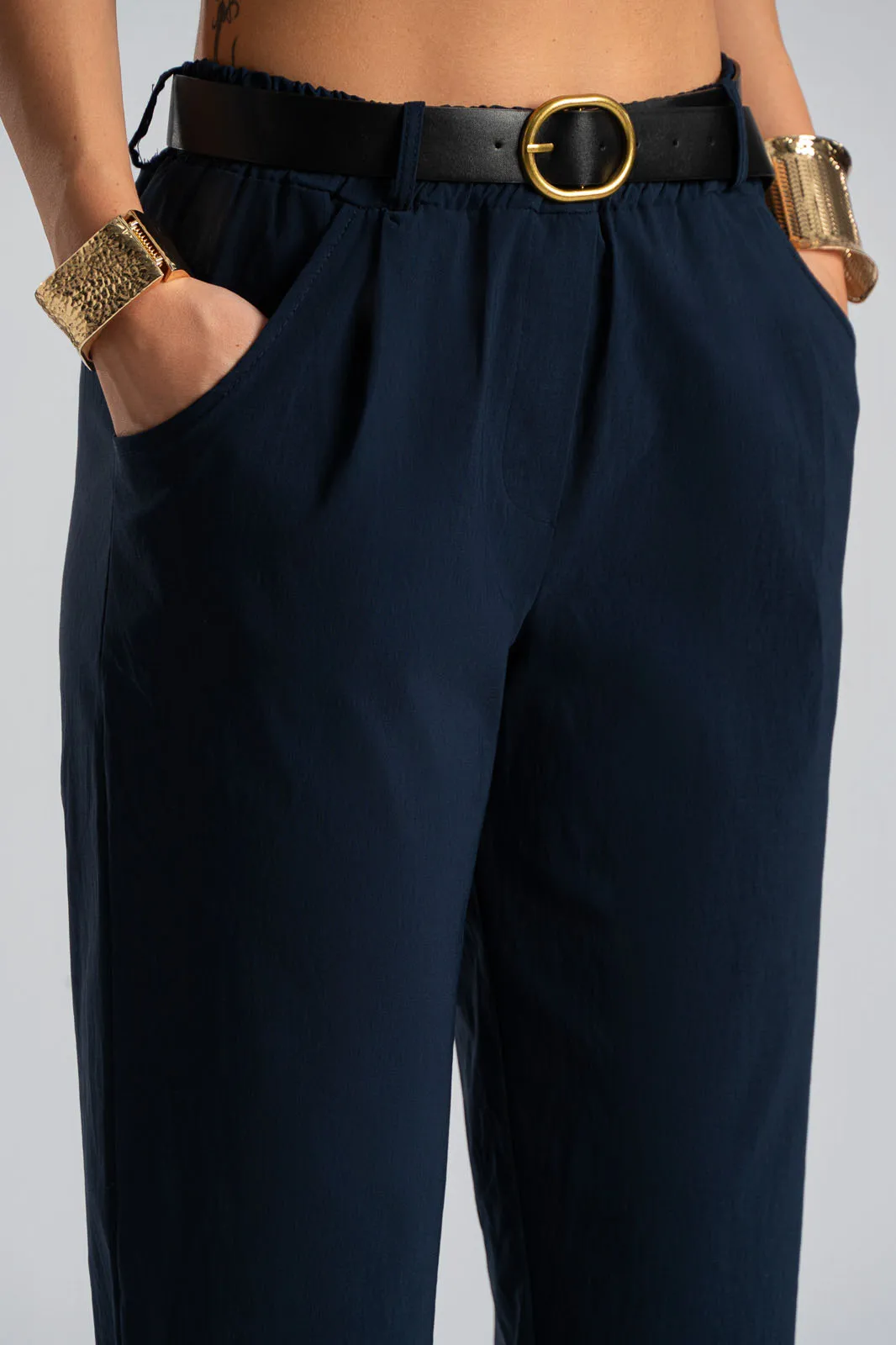 Παντελόνι με λάστιχο στην μέση. Διαθέτει ζώνη για καλύτερη εφαρμογή. Έχει πλαινές τσέπες. Έχει απαλή υφή. Στο πίσω μέρος έχει τσέπες με ρέλι. Οι μετρήσεις του πίνακα είναι αντιπροσωπευτικές για κάθε κωδικό. 65% viscose, 32% polyamide, 3% elastan.