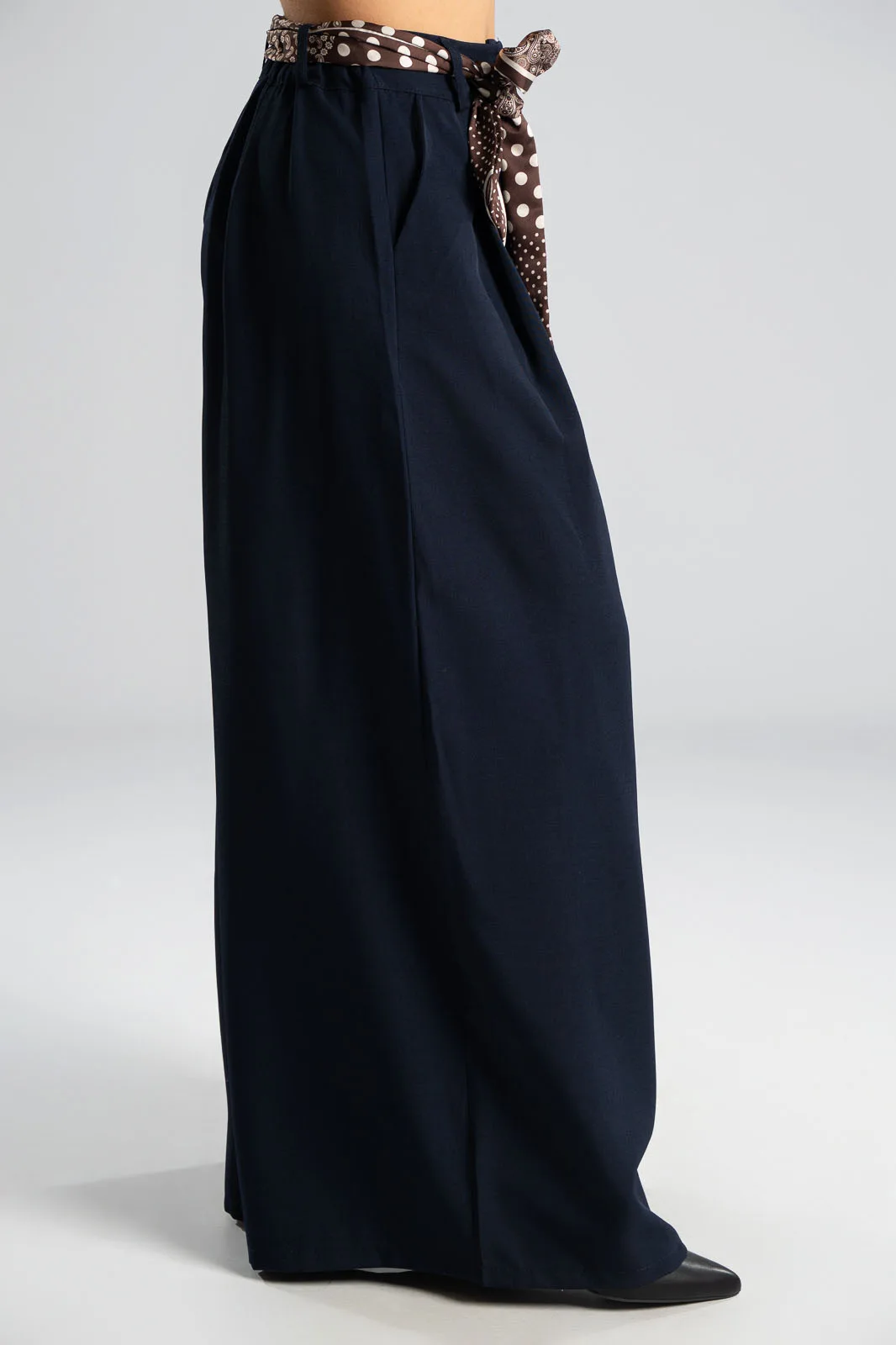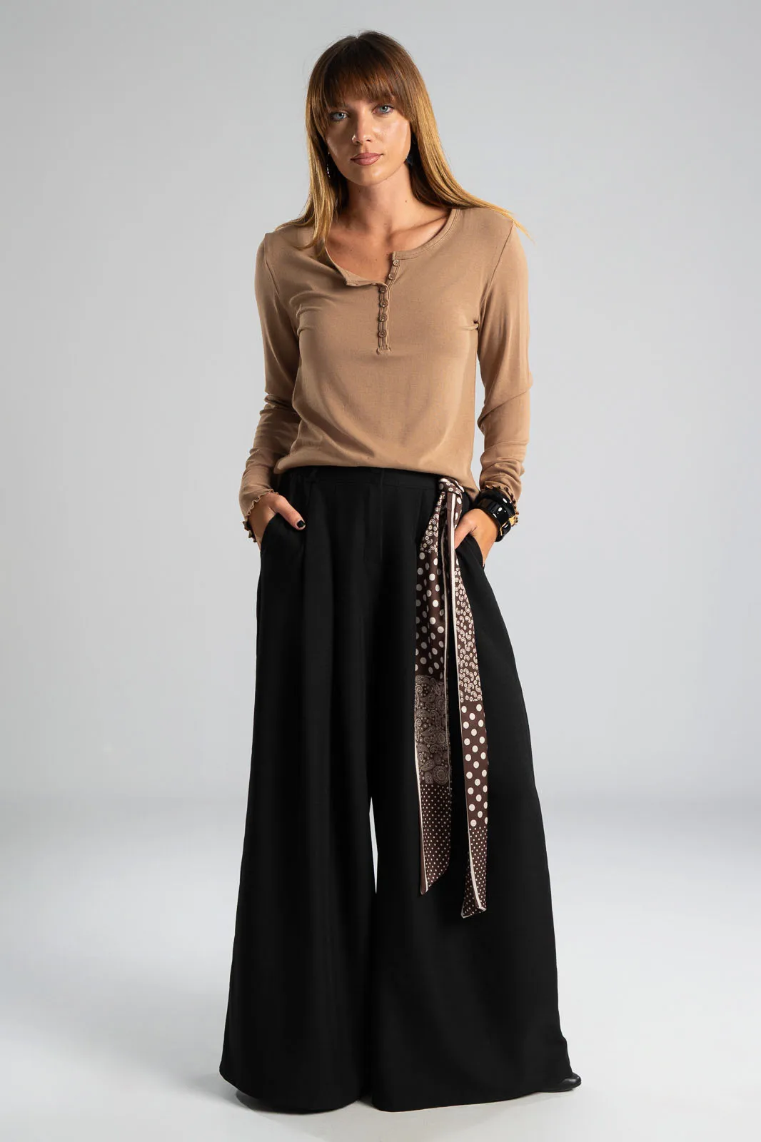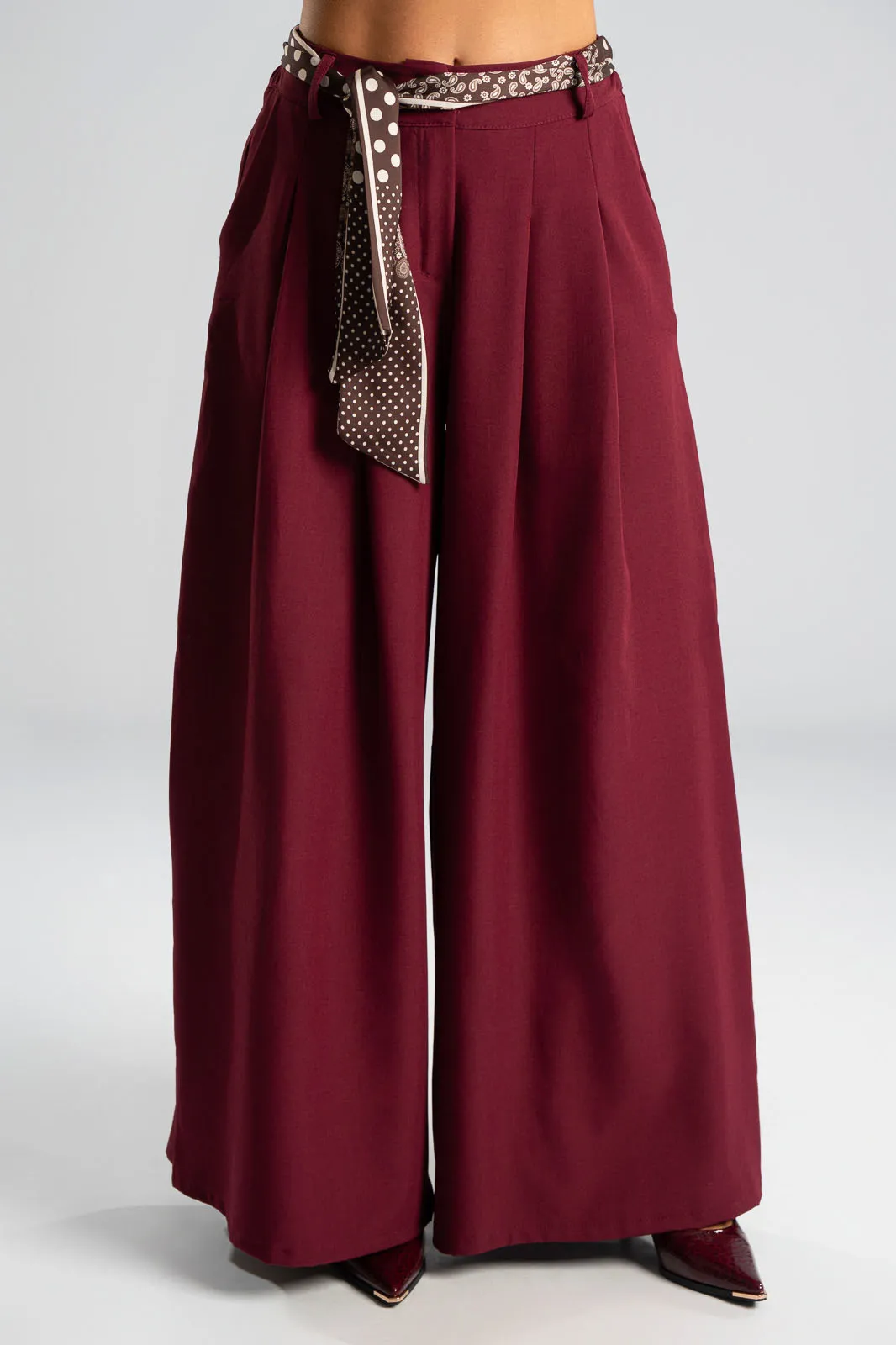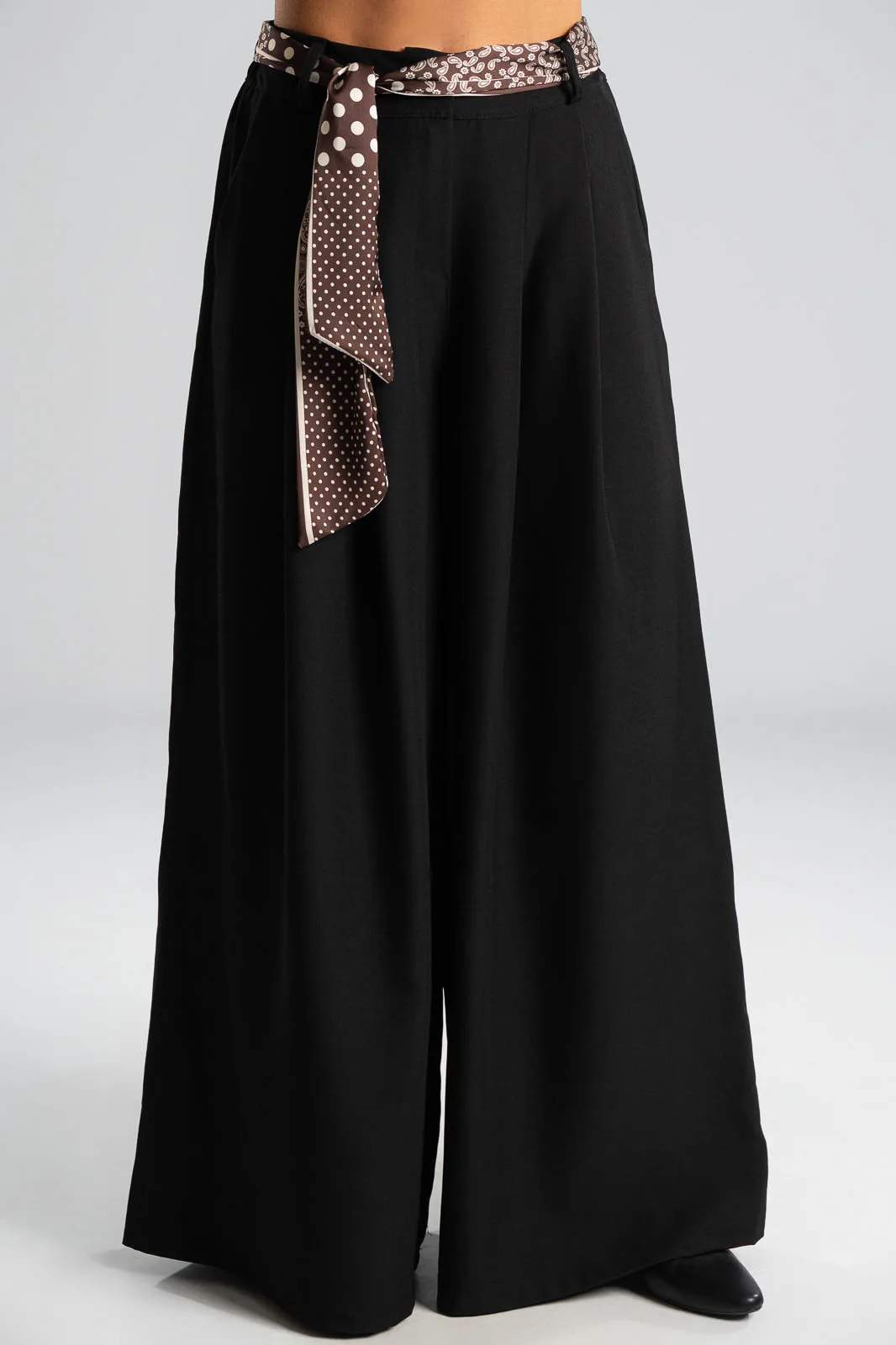 Pants that fasten with a button and zipper. Elastic at the back for a better fit. Straight cut with pleats around the hem. Side pockets. Comes with its own scarf, which can also be worn as a belt. The measurements in the table are representative of each product. 95% polyester, 5% elastane.