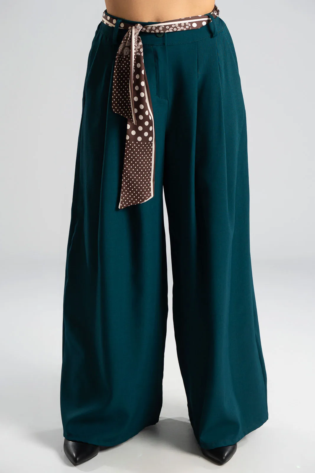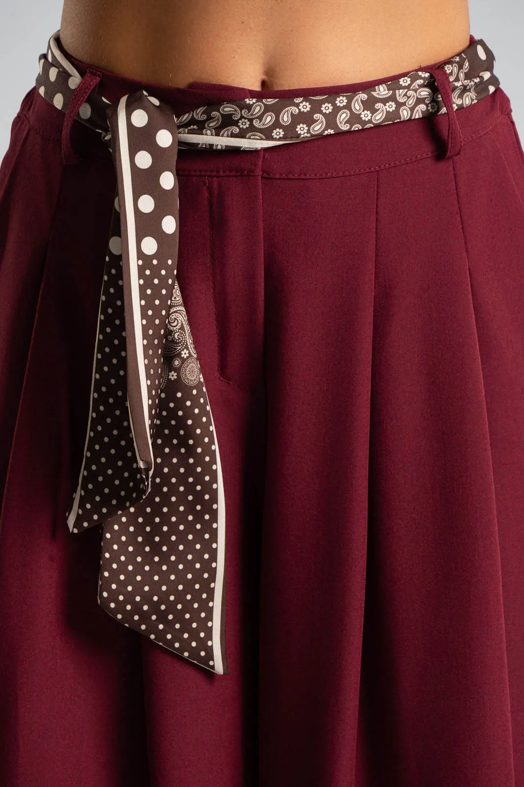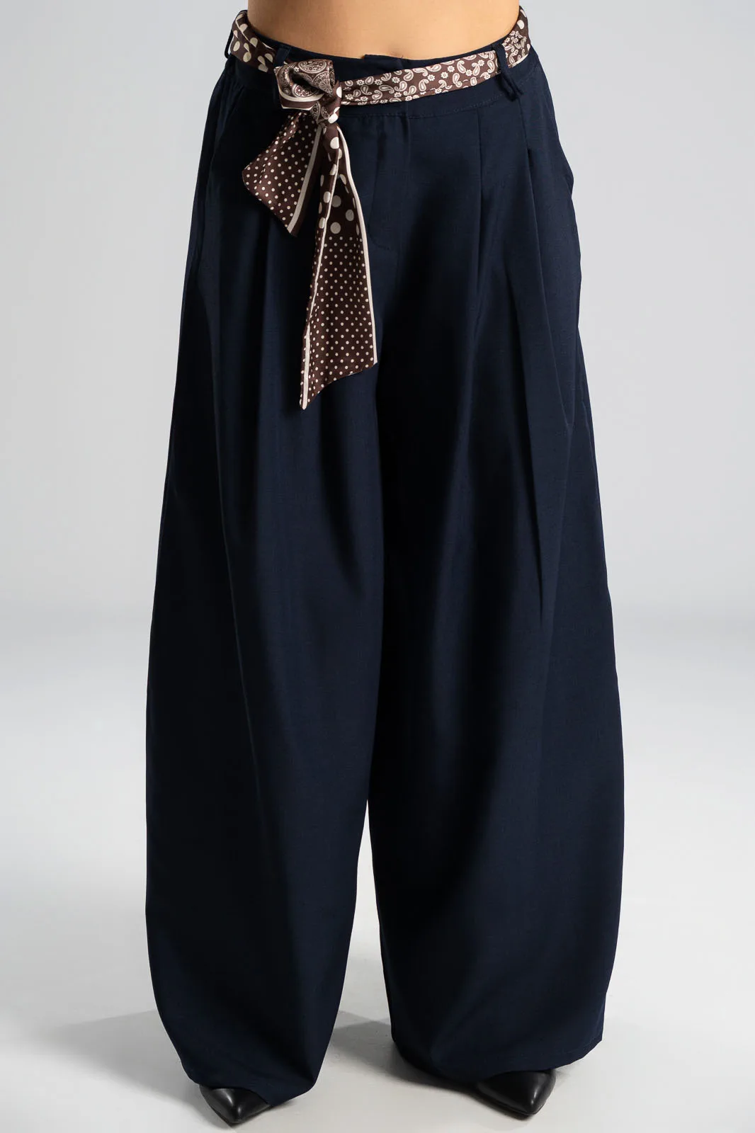 Pants that fasten with a button and zipper. Elastic at the back for a better fit. Straight cut with pleats around the hem. Side pockets. Comes with its own scarf, which can also be worn as a belt. The measurements in the table are representative of each product. 95% polyester, 5% elastane.