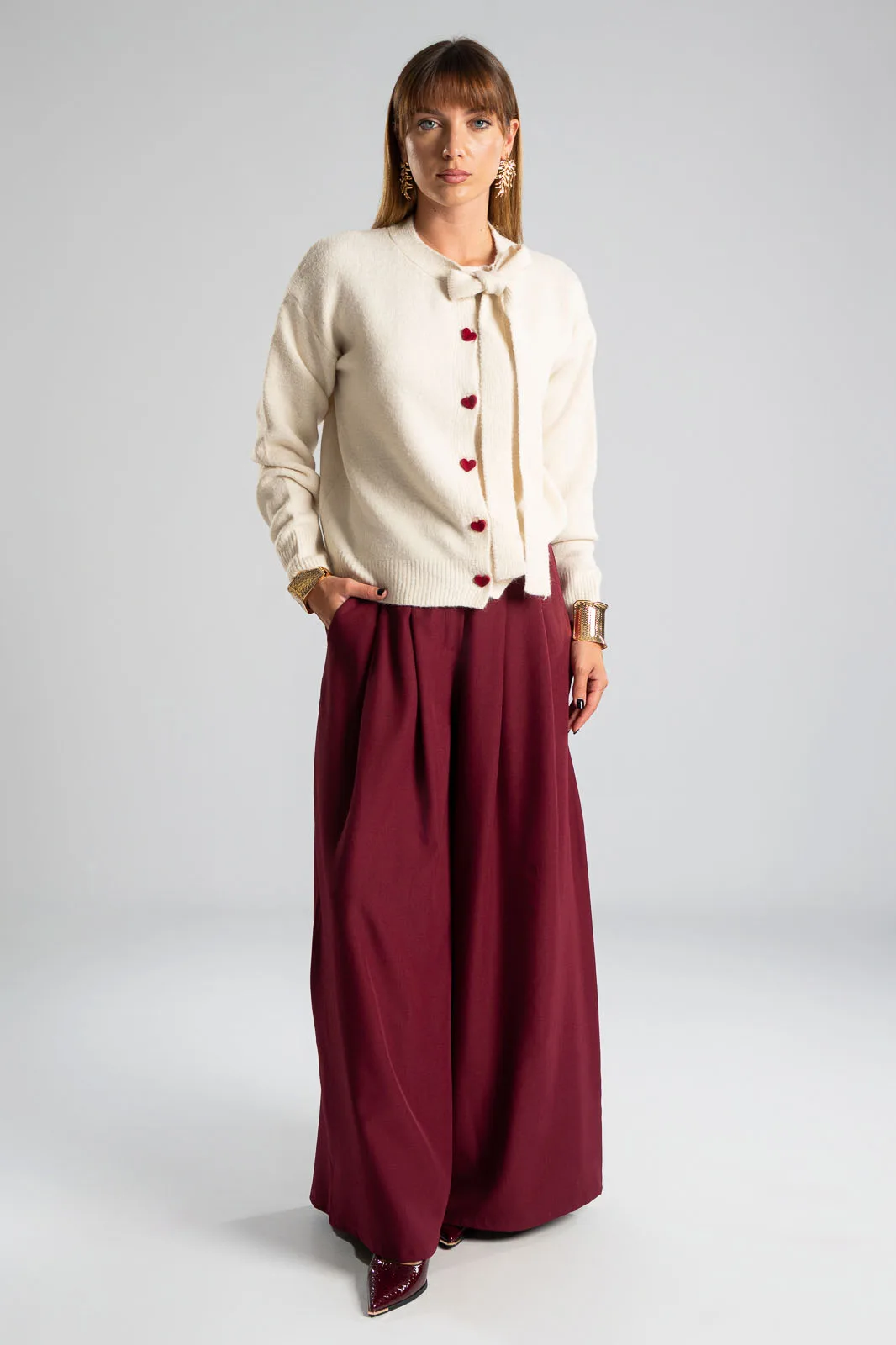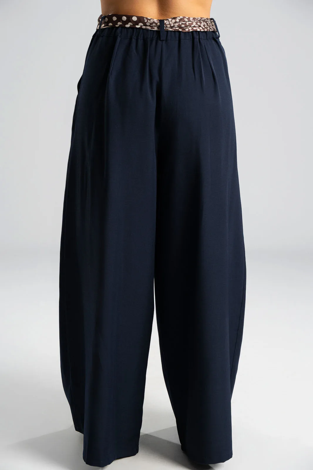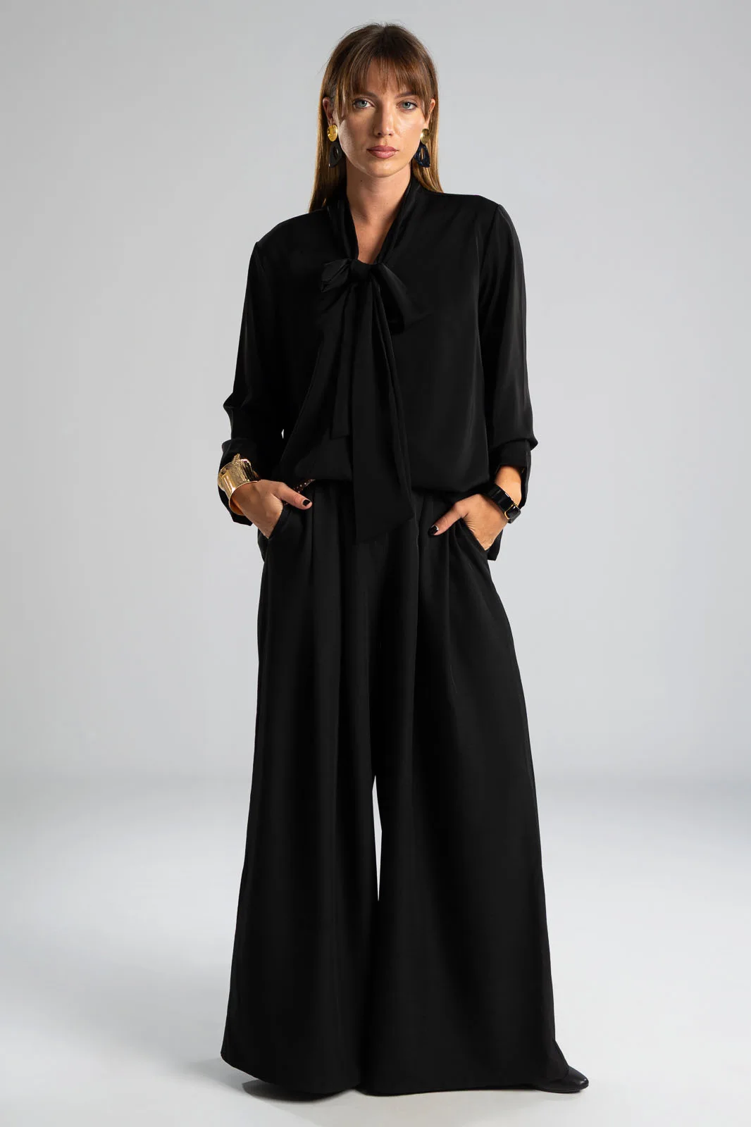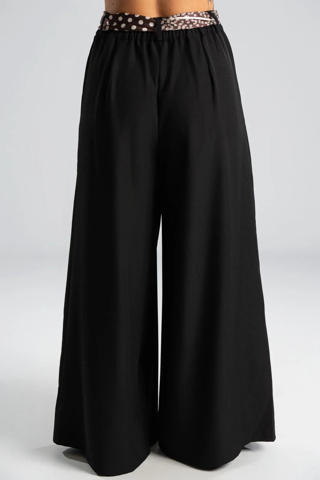 Pants that fasten with a button and zipper. Elastic at the back for a better fit. Straight cut with pleats around the hem. Side pockets. Comes with its own scarf, which can also be worn as a belt. The measurements in the table are representative of each product. 95% polyester, 5% elastane.