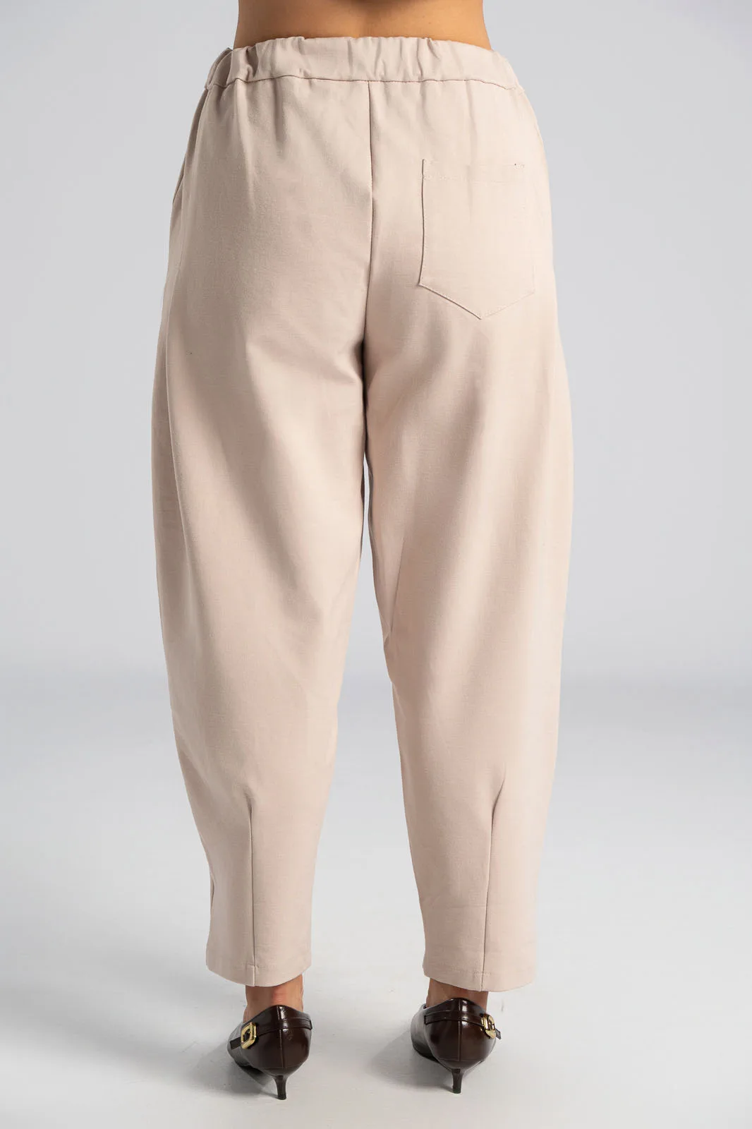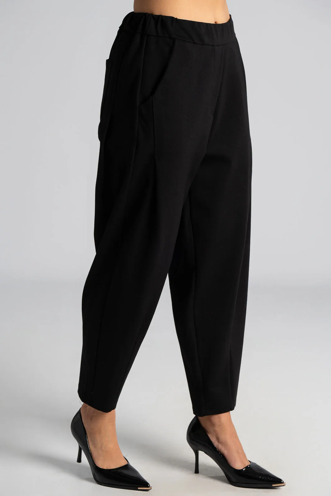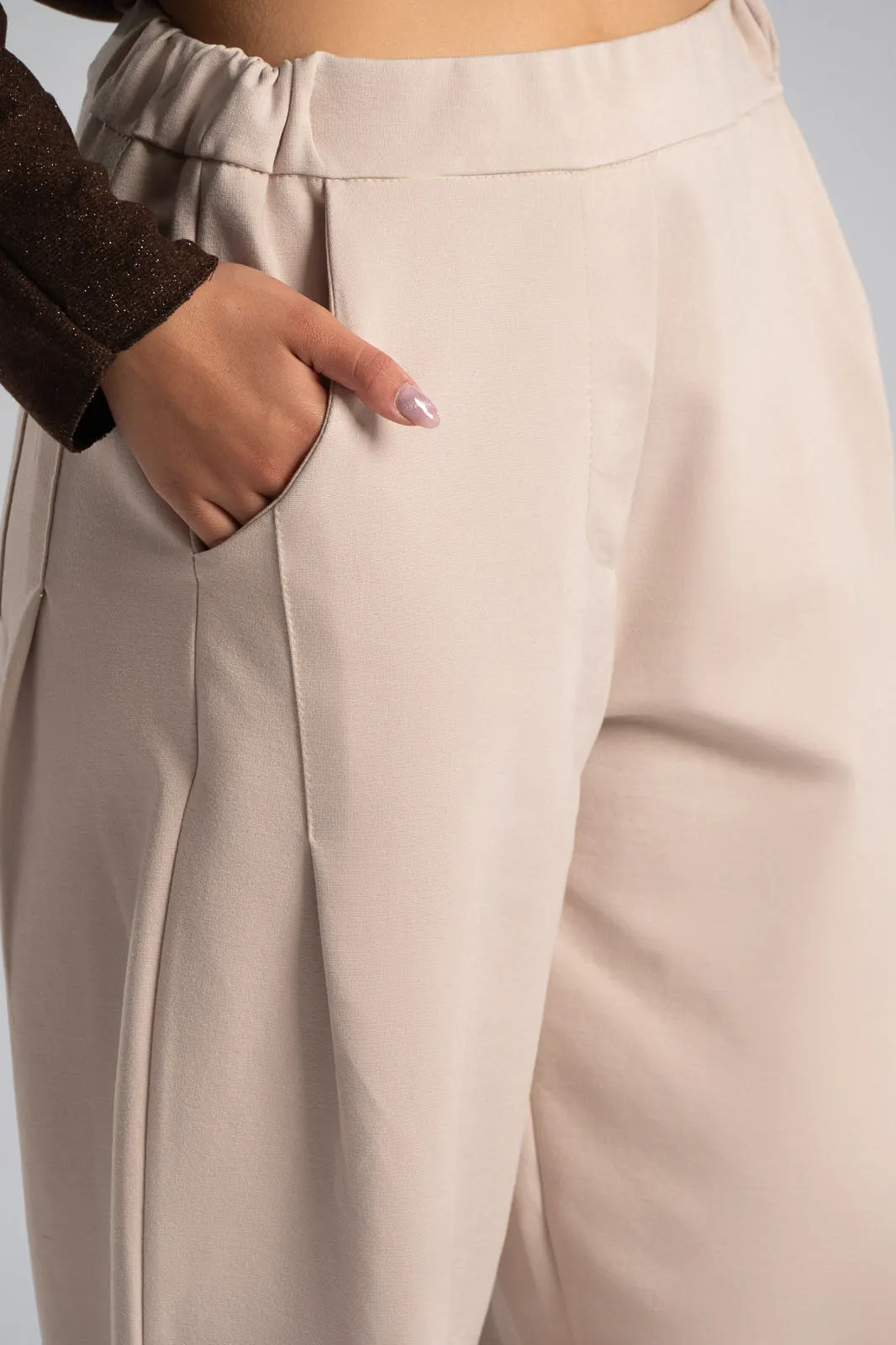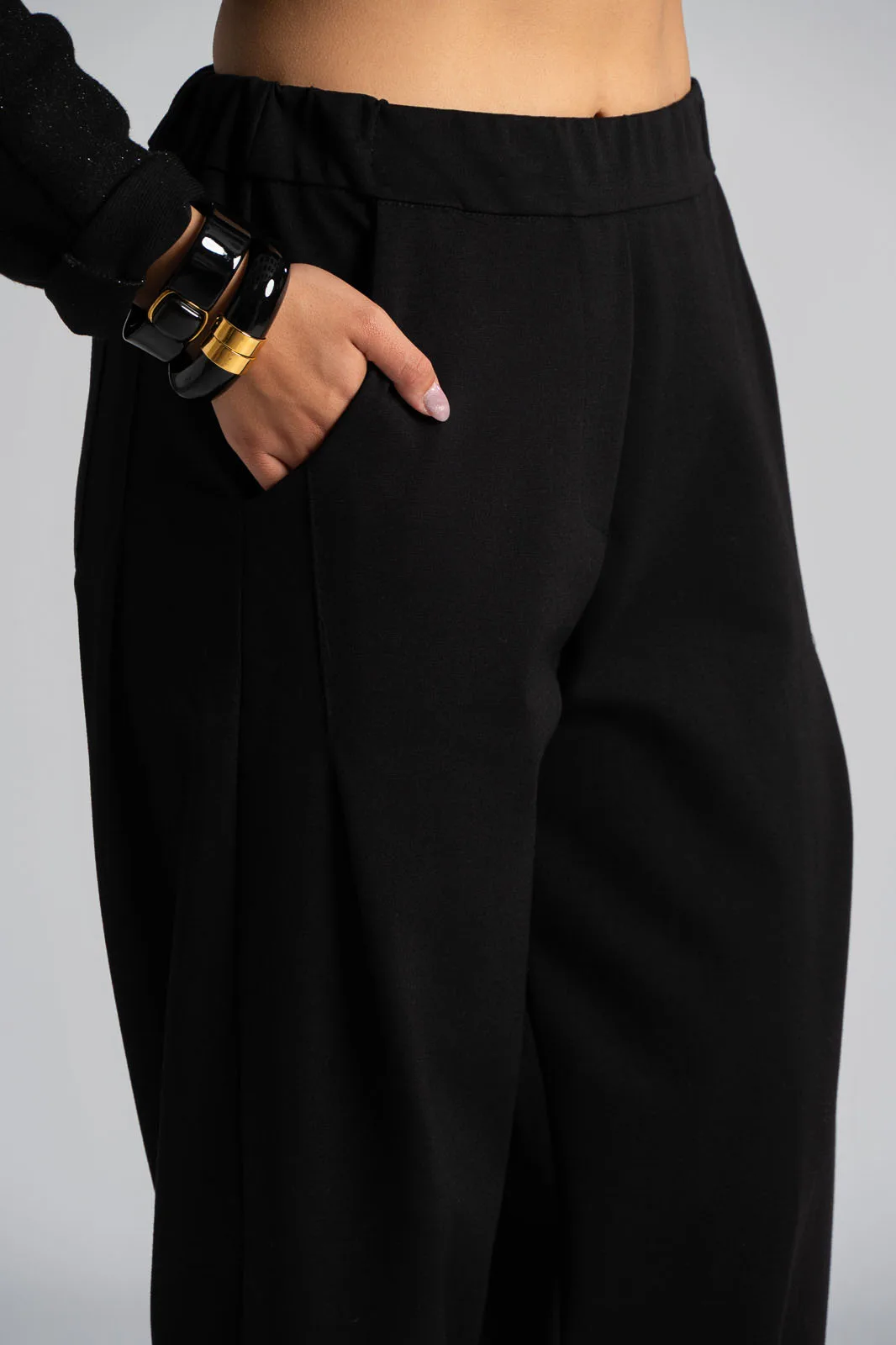Παντελόνι από ποντοστόφα ελαστική. Έχει λάστιχο στο πίσω μέρος. Στα πλαινά έχει τσέπες και μια στο πίσω μέρος. Έχει πλαινές τσέπες. Διαθέτει πιέτες στο μπροστινό μέρος και καταλήγει σε πιέτες. Οι μετρήσεις του πίνακα είναι αντιπροσωπευτικές για κάθε προϊόν. 65% viscose, 30% polyamide, 5% elastan.