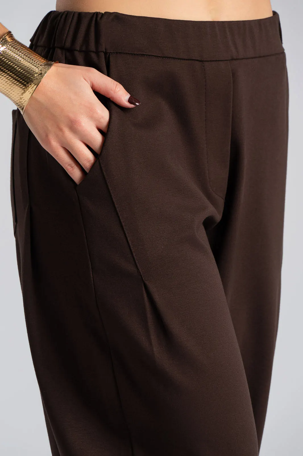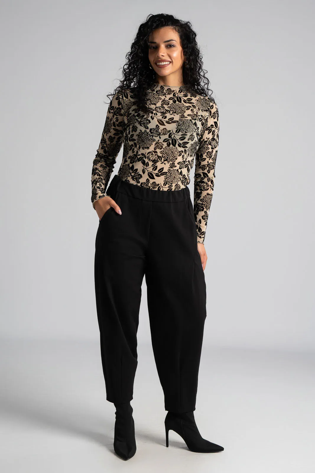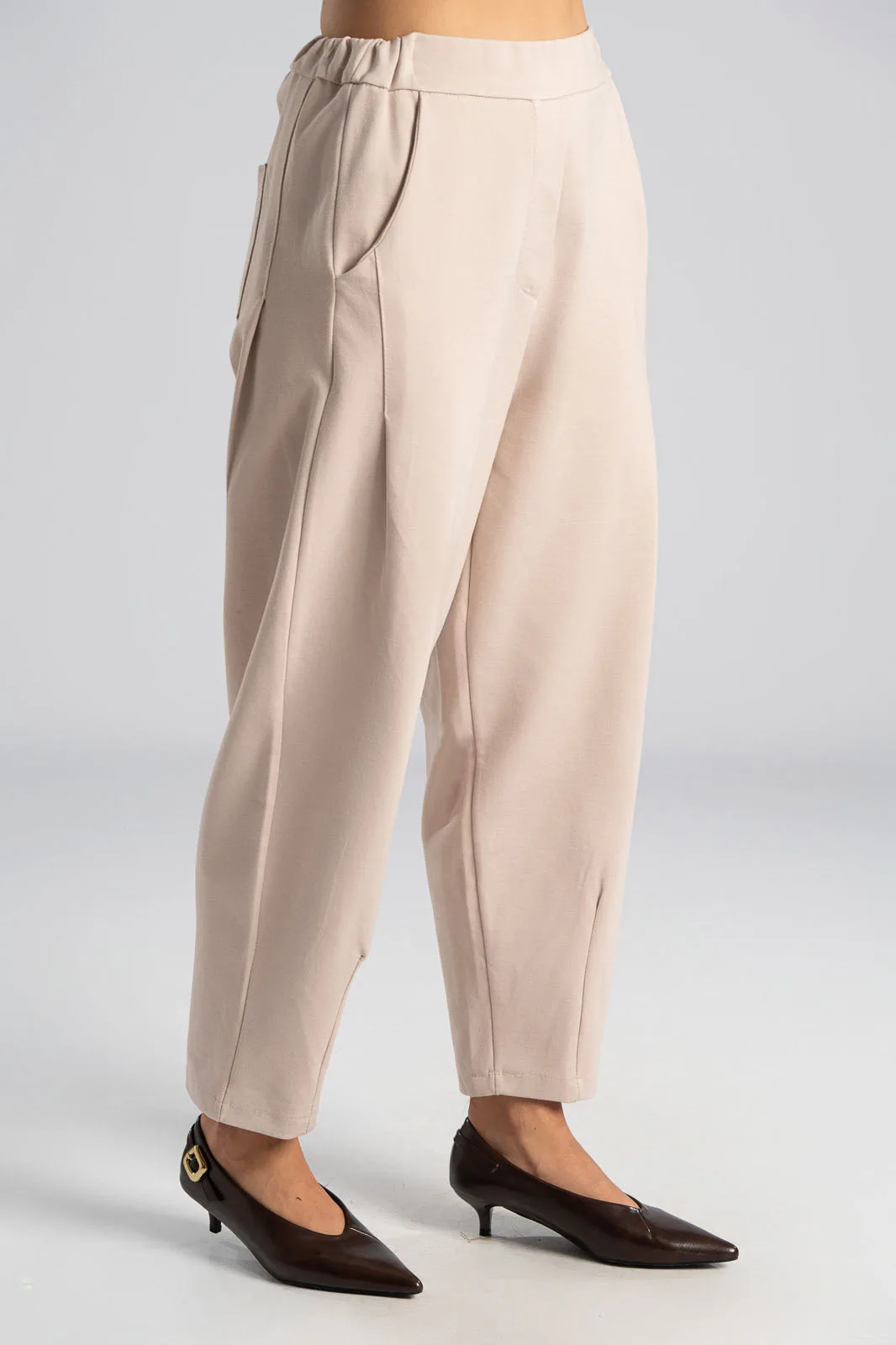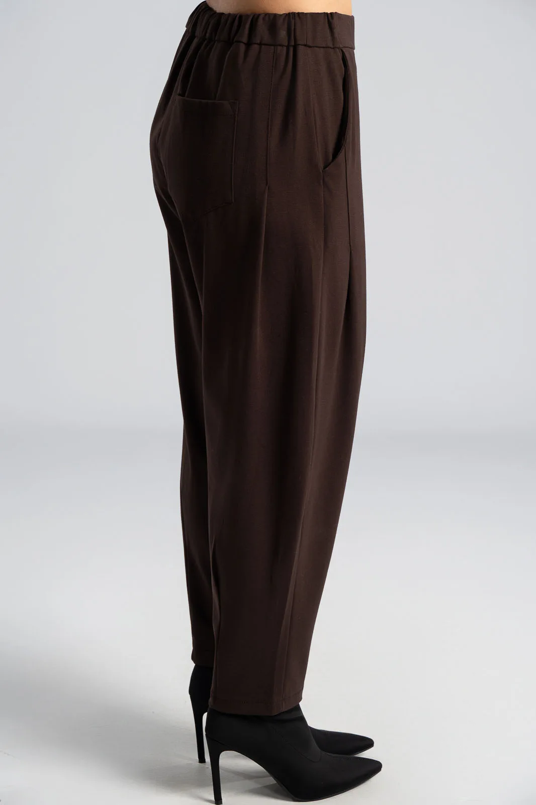 Παντελόνι από ποντοστόφα ελαστική. Έχει λάστιχο στο πίσω μέρος. Στα πλαινά έχει τσέπες και μια στο πίσω μέρος. Έχει πλαινές τσέπες. Διαθέτει πιέτες στο μπροστινό μέρος και καταλήγει σε πιέτες. Οι μετρήσεις του πίνακα είναι αντιπροσωπευτικές για κάθε προϊόν. 65% viscose, 30% polyamide, 5% elastan.