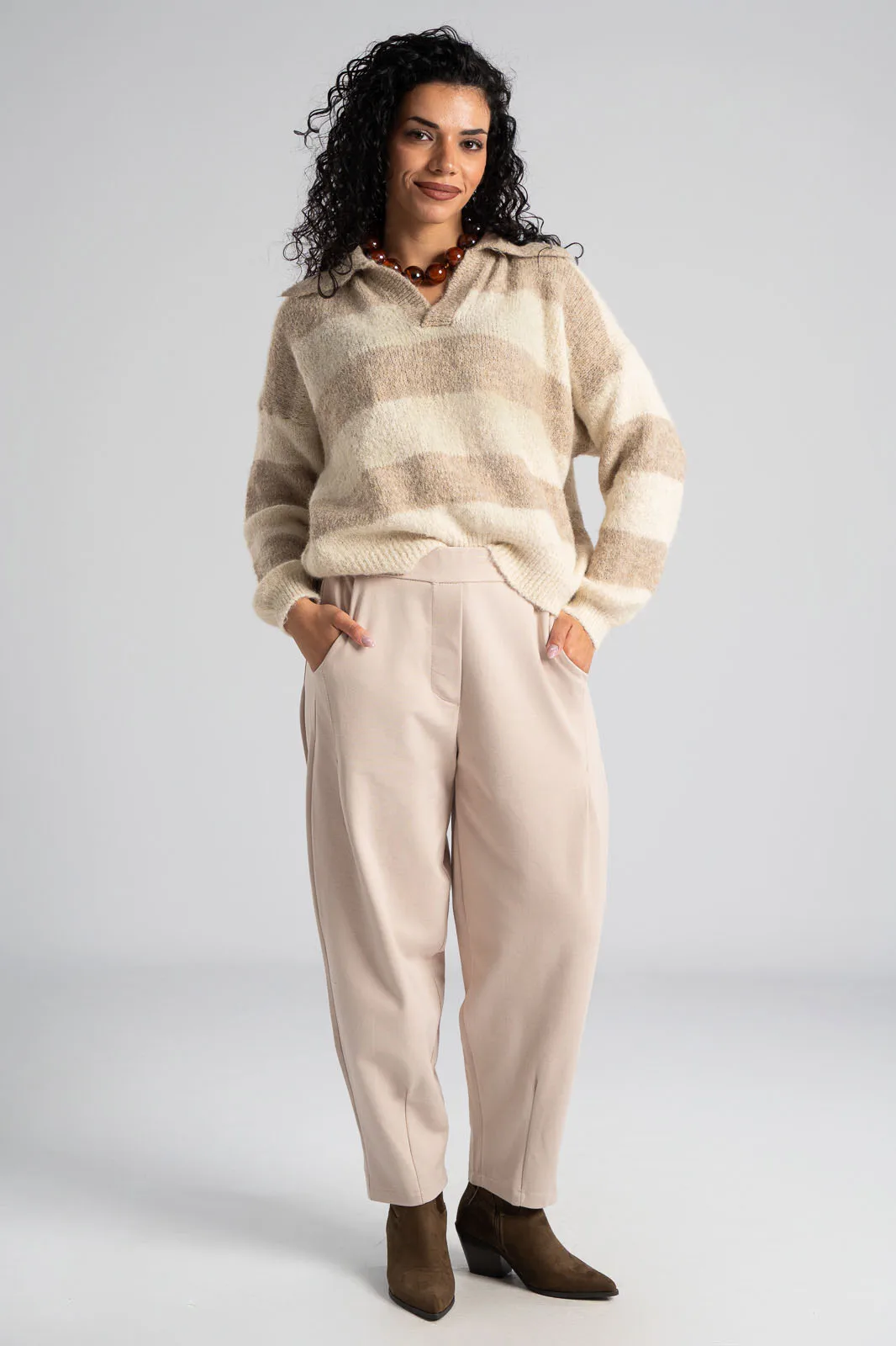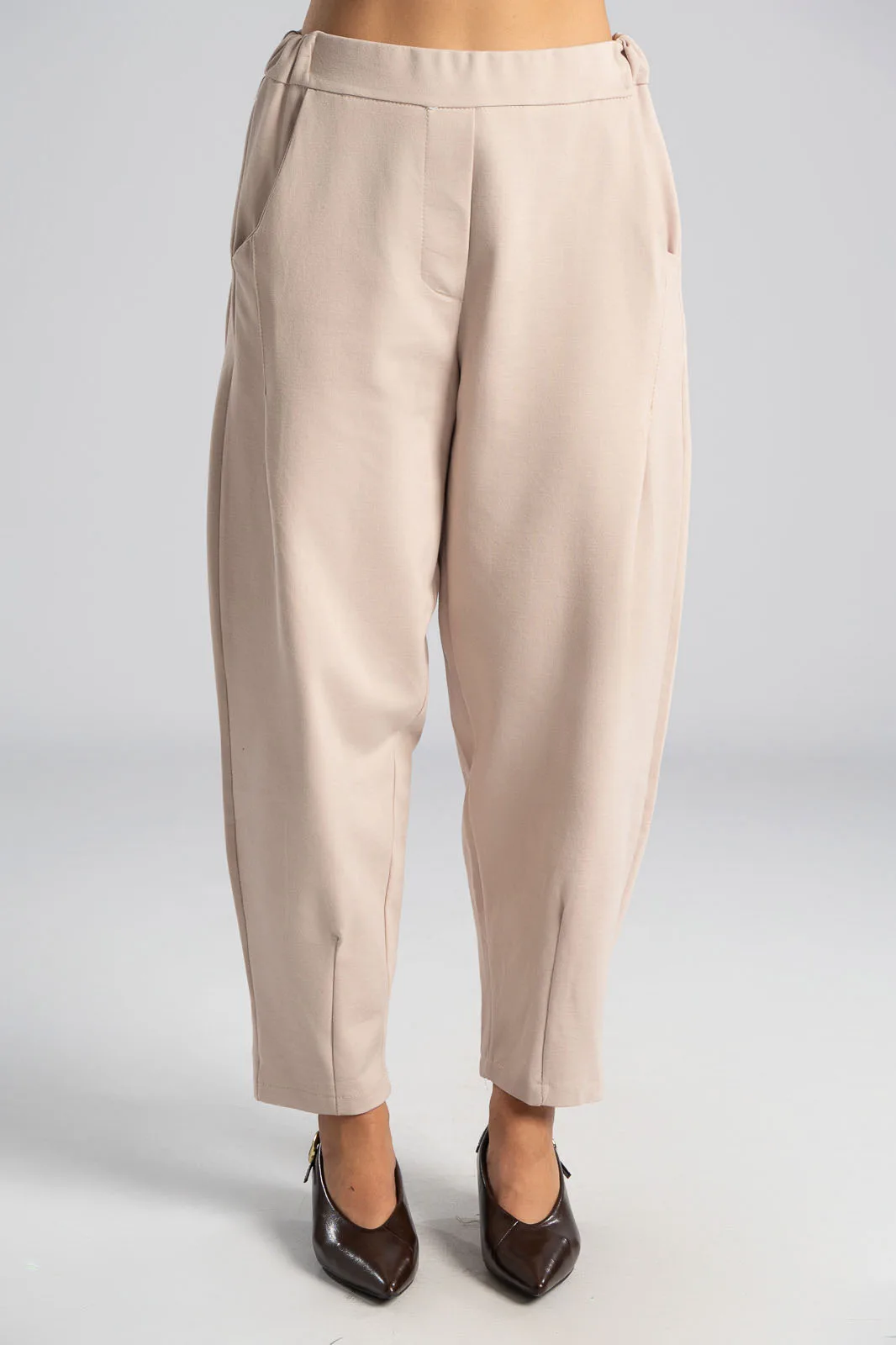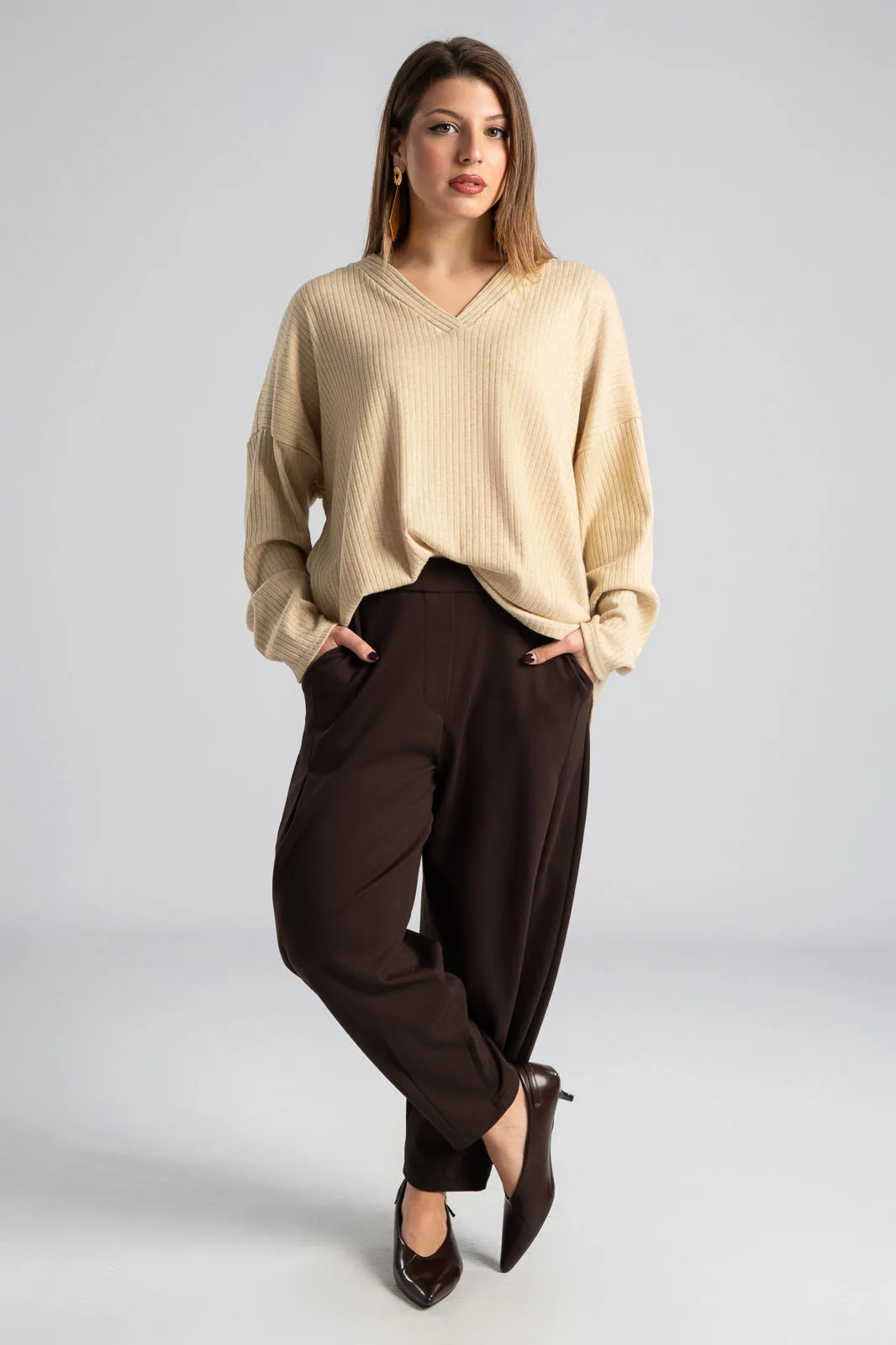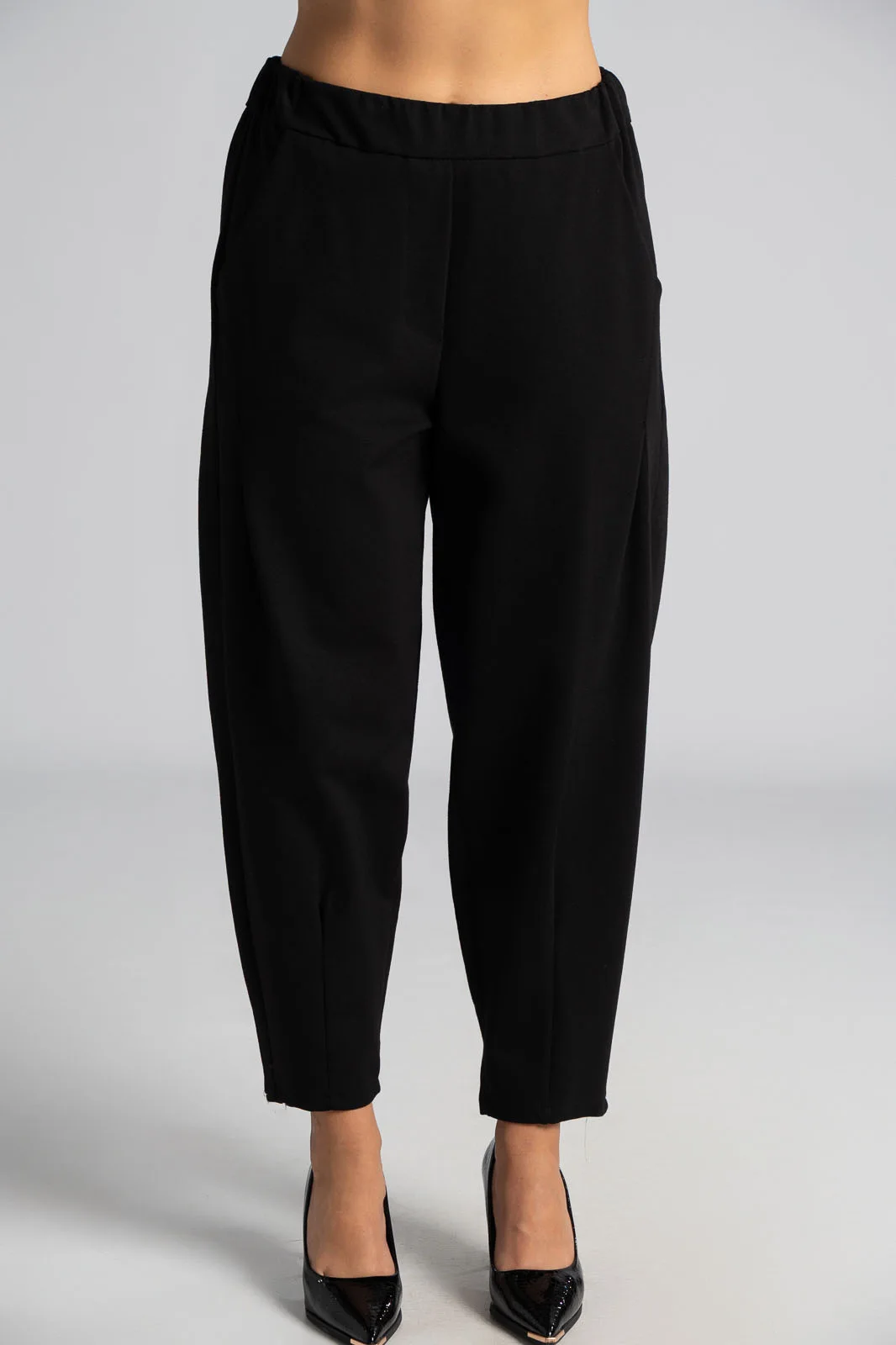 Παντελόνι από ποντοστόφα ελαστική. Έχει λάστιχο στο πίσω μέρος. Στα πλαινά έχει τσέπες και μια στο πίσω μέρος. Έχει πλαινές τσέπες. Διαθέτει πιέτες στο μπροστινό μέρος και καταλήγει σε πιέτες. Οι μετρήσεις του πίνακα είναι αντιπροσωπευτικές για κάθε προϊόν. 65% viscose, 30% polyamide, 5% elastan.