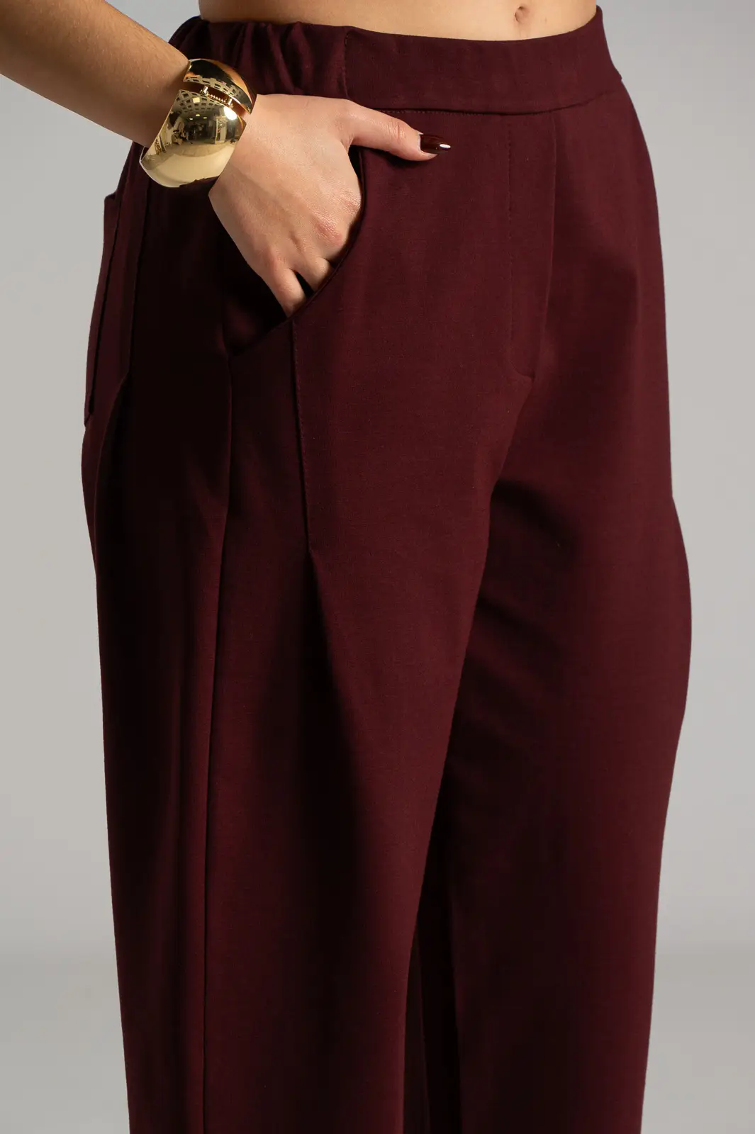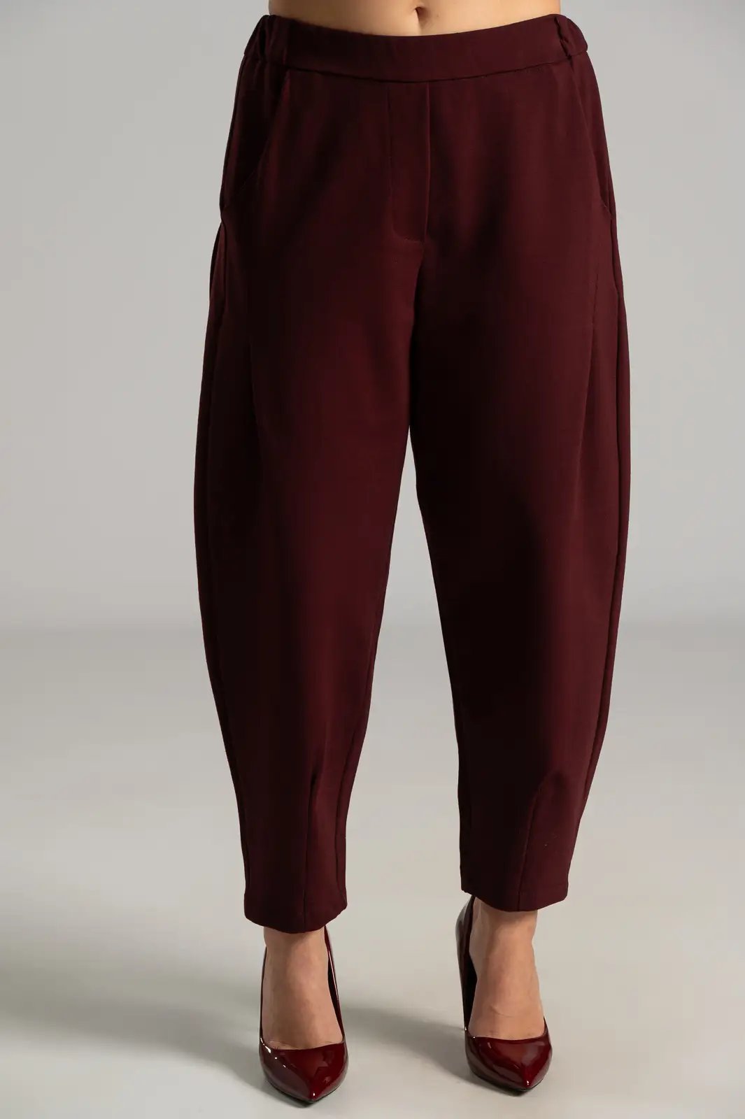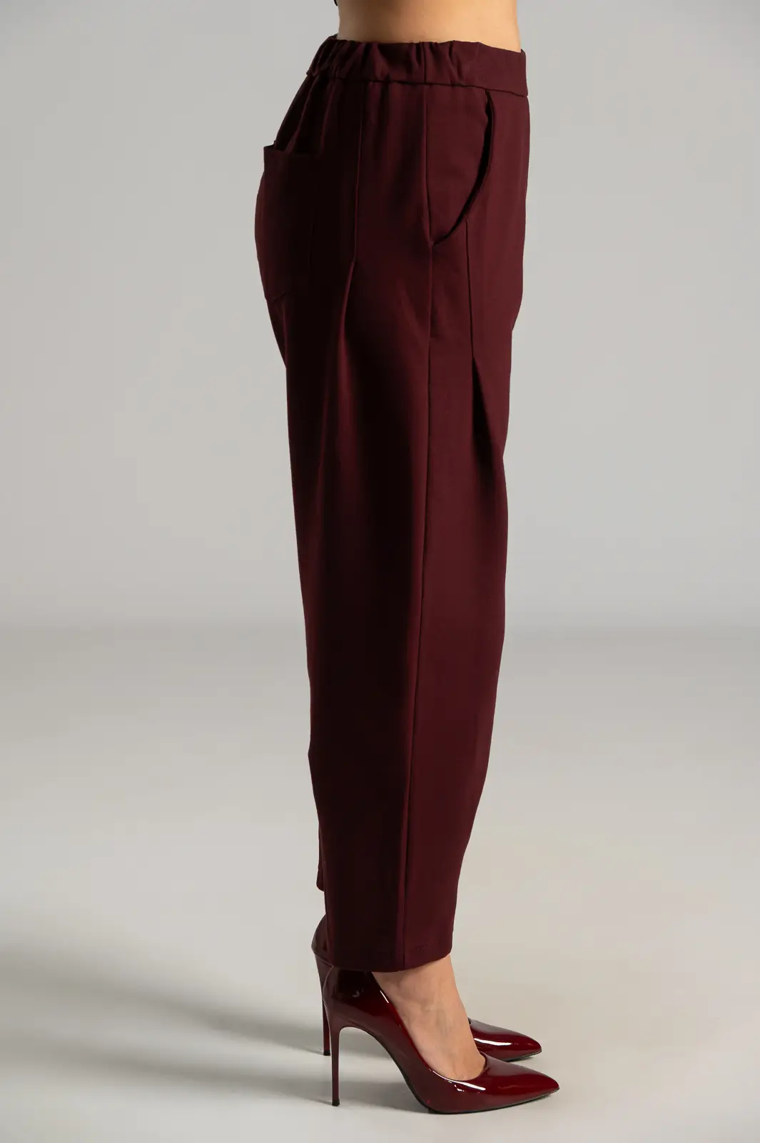Παντελόνι από ποντοστόφα ελαστική. Έχει λάστιχο στο πίσω μέρος. Στα πλαινά έχει τσέπες και μια στο πίσω μέρος. Έχει πλαινές τσέπες. Διαθέτει πιέτες στο μπροστινό μέρος και καταλήγει σε πιέτες. Οι μετρήσεις του πίνακα είναι αντιπροσωπευτικές για κάθε προϊόν. 65% viscose, 30% polyamide, 5% elastan.