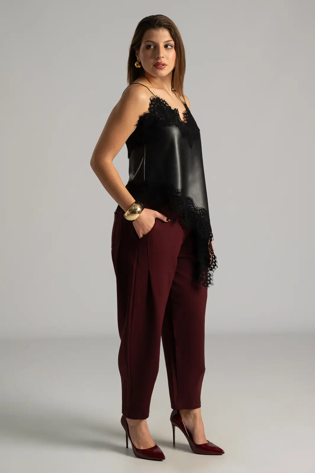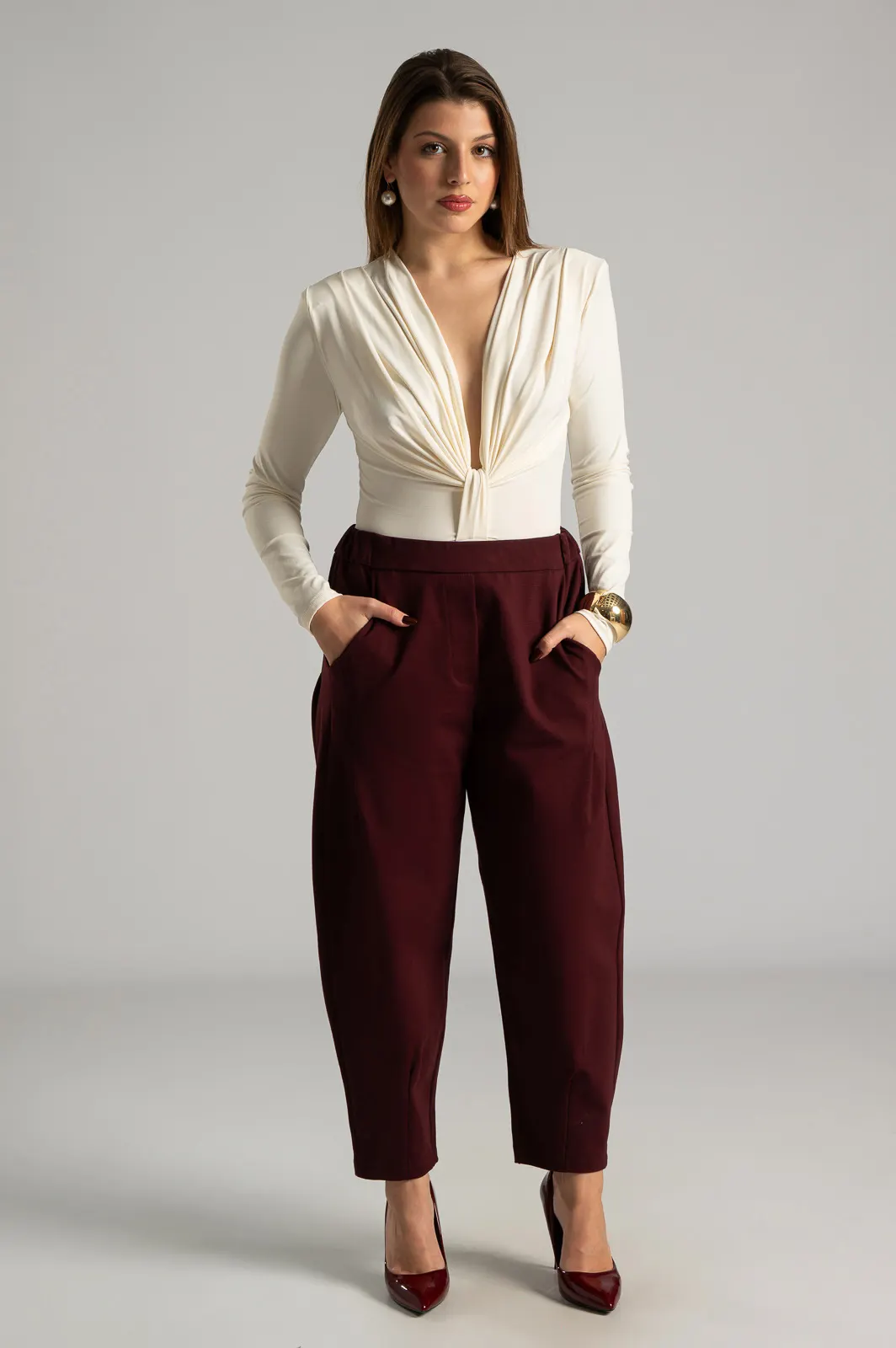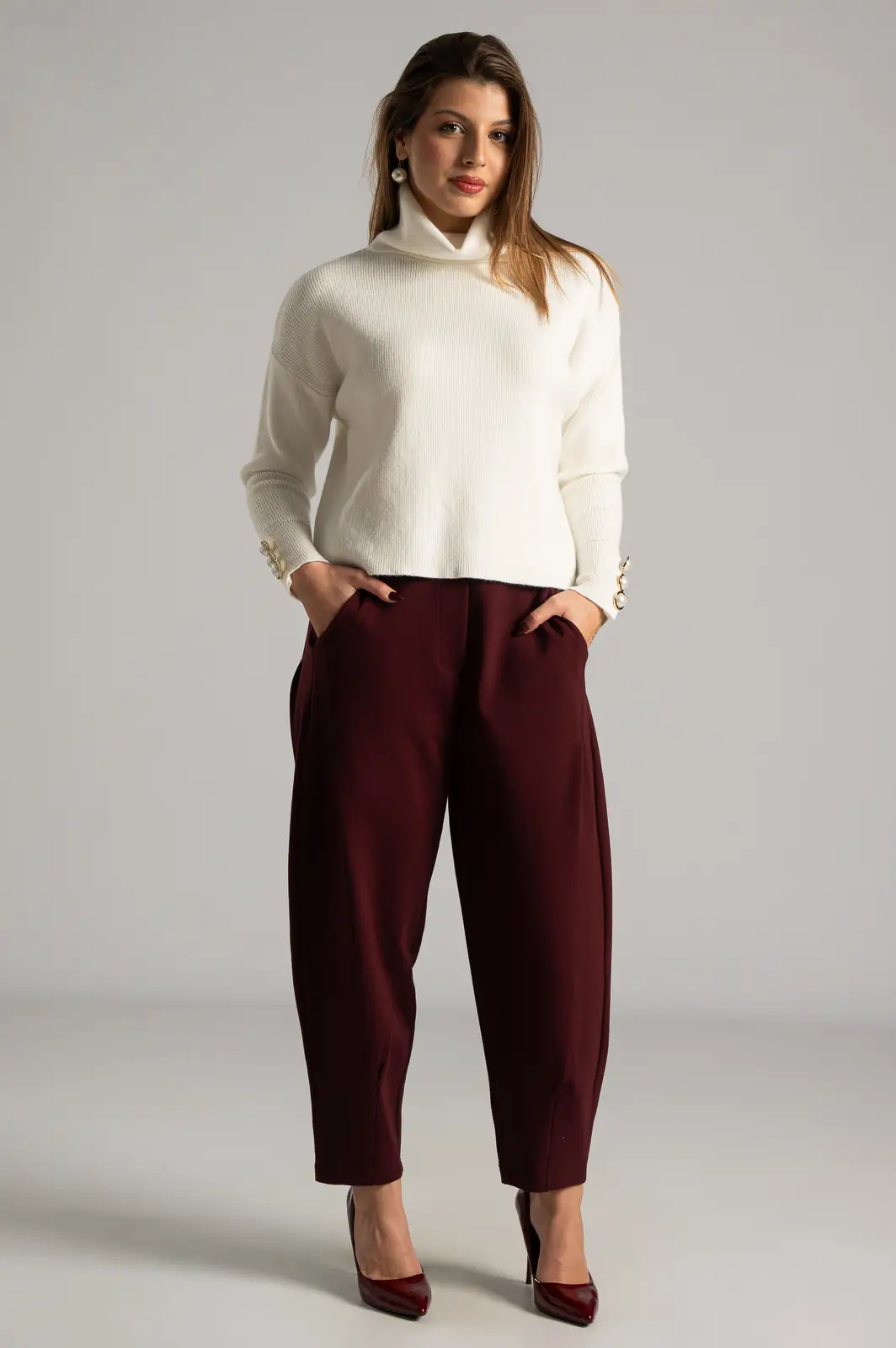 Παντελόνι από ποντοστόφα ελαστική. Έχει λάστιχο στο πίσω μέρος. Στα πλαινά έχει τσέπες και μια στο πίσω μέρος. Έχει πλαινές τσέπες. Διαθέτει πιέτες στο μπροστινό μέρος και καταλήγει σε πιέτες. Οι μετρήσεις του πίνακα είναι αντιπροσωπευτικές για κάθε προϊόν. 65% viscose, 30% polyamide, 5% elastan.