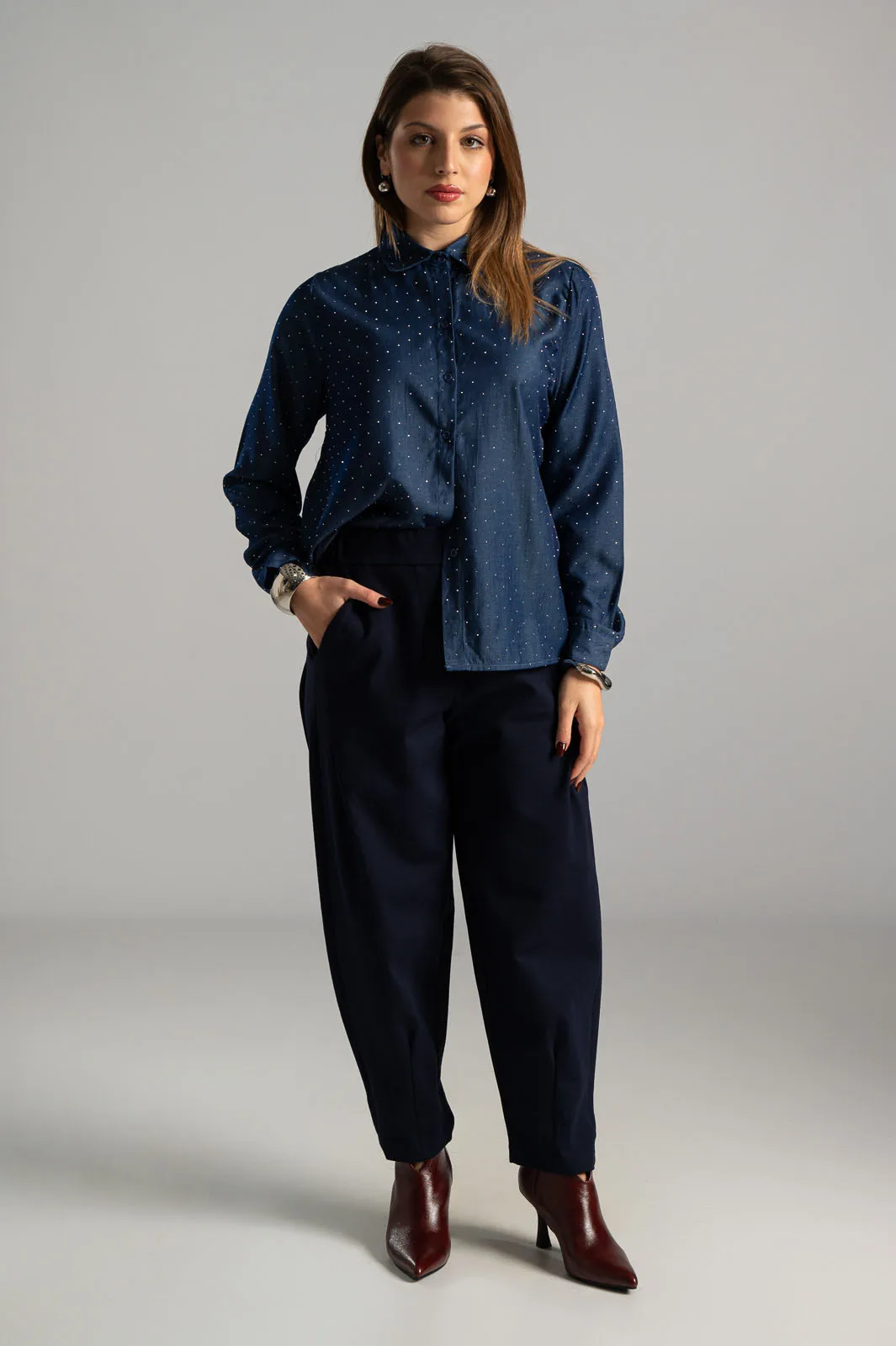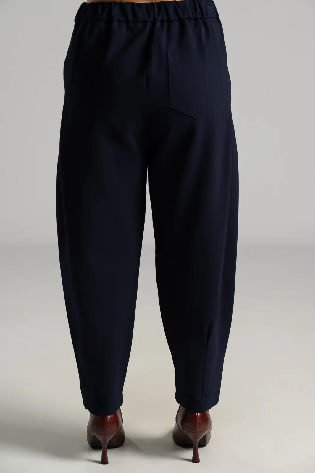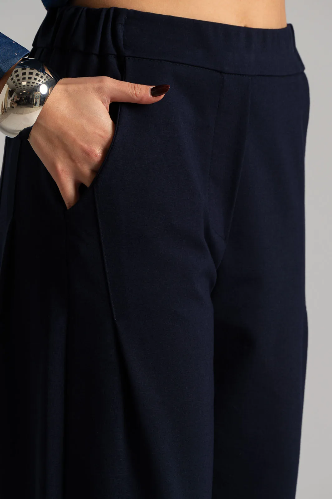 Παντελόνι από ποντοστόφα ελαστική. Έχει λάστιχο στο πίσω μέρος. Στα πλαινά έχει τσέπες και μια στο πίσω μέρος. Έχει πλαινές τσέπες. Διαθέτει πιέτες στο μπροστινό μέρος και καταλήγει σε πιέτες. Οι μετρήσεις του πίνακα είναι αντιπροσωπευτικές για κάθε προϊόν. 65% viscose, 30% polyamide, 5% elastan.