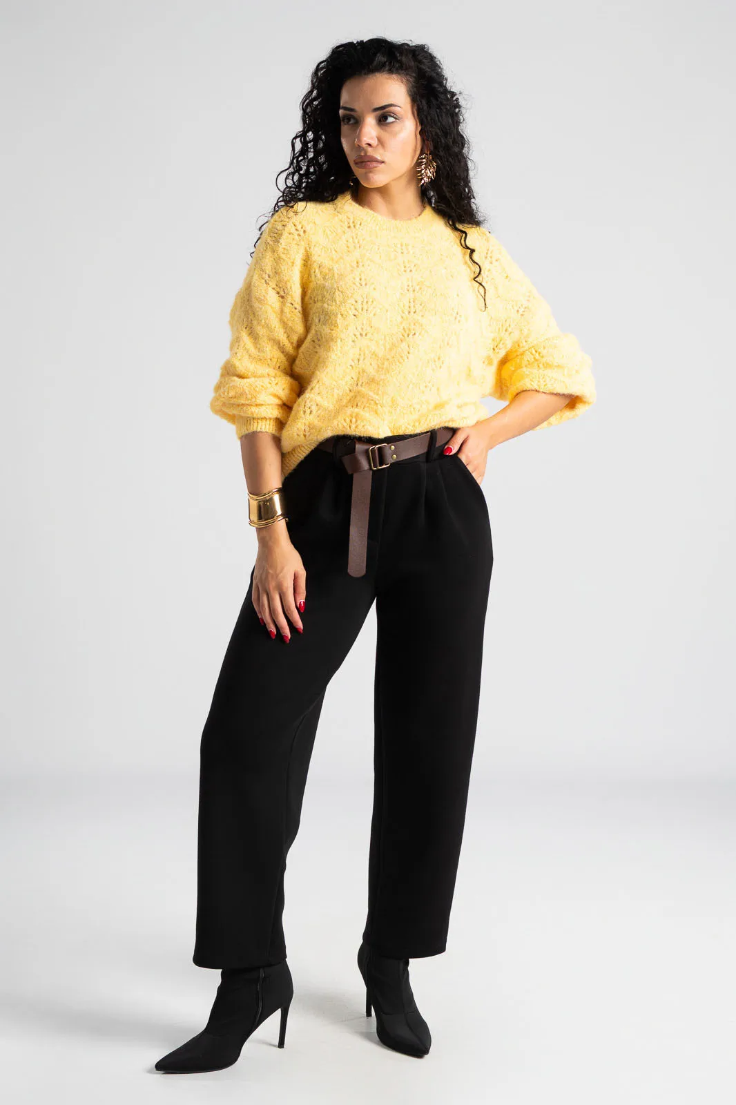 Παντελόνι με λάστιχο στο πίσω μέρος για καλύτερη εφαρμογή. Το ύφασμα είναι ποντοστόφα. Διαθέτει ζώνη για καλύτερη εφαρμογή. Έχει πλαινές τσέπες και δεν έχει φερμουάρ. Έχει απαλή υφή. Στο πίσω μέρος έχει τσέπες με ρέλι. Οι μετρήσεις του πίνακα είναι αντιπροσωπευτικές για κάθε κωδικό. 50% viscose, 45%  polyester, 5% elastan.