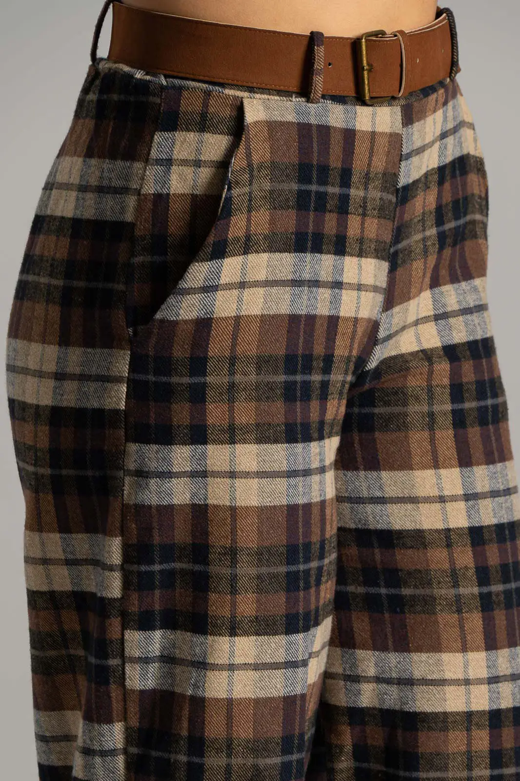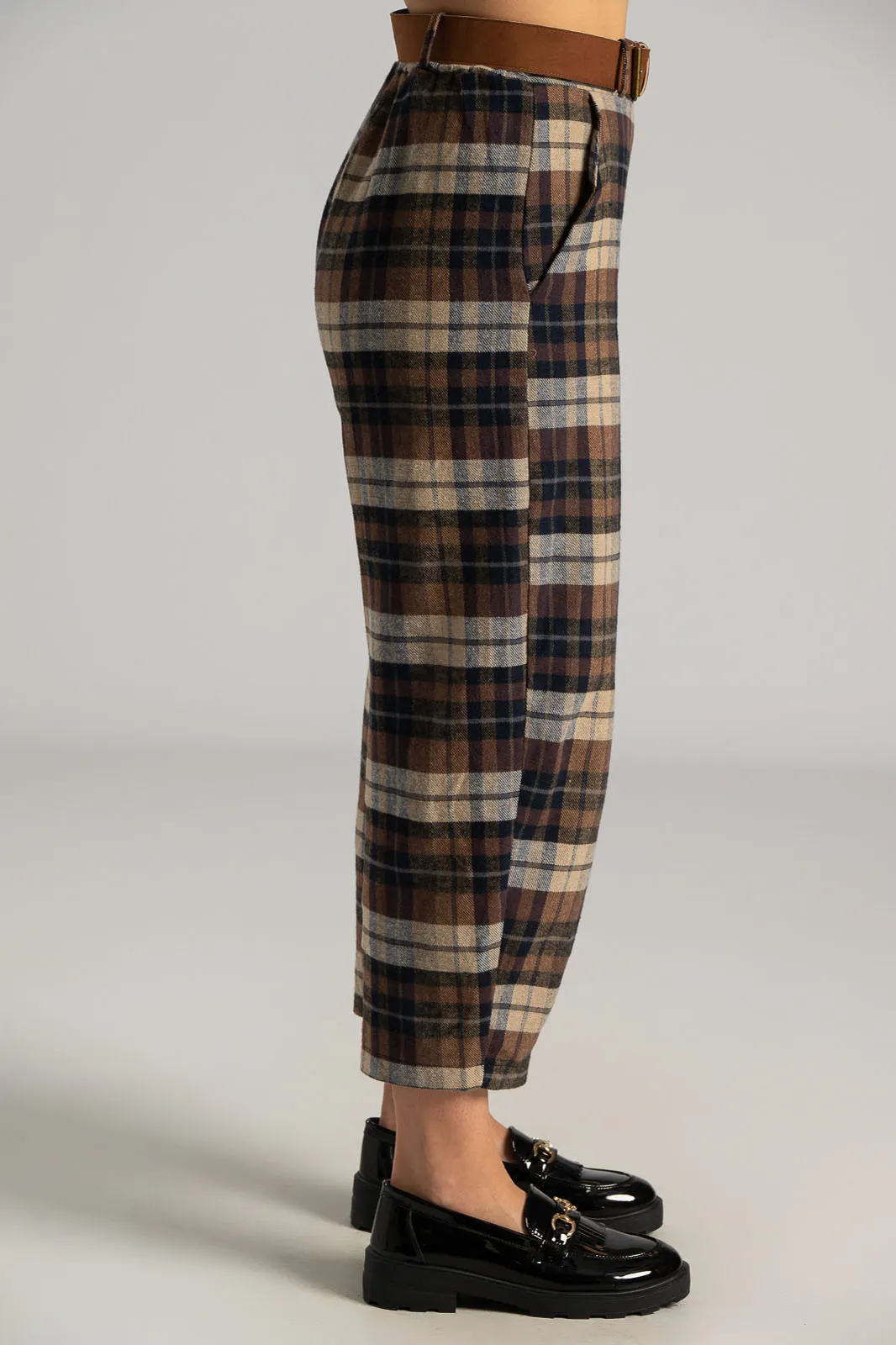 Checkered pants with a woolen texture. They have elastic at the back for a better fit and their own belt. Pockets on the sides. Tapered at the bottom and with a small pleat at the back. The measurements in the table are representative for each product. 65% polyester, 33% viscose, 2% elastane.
