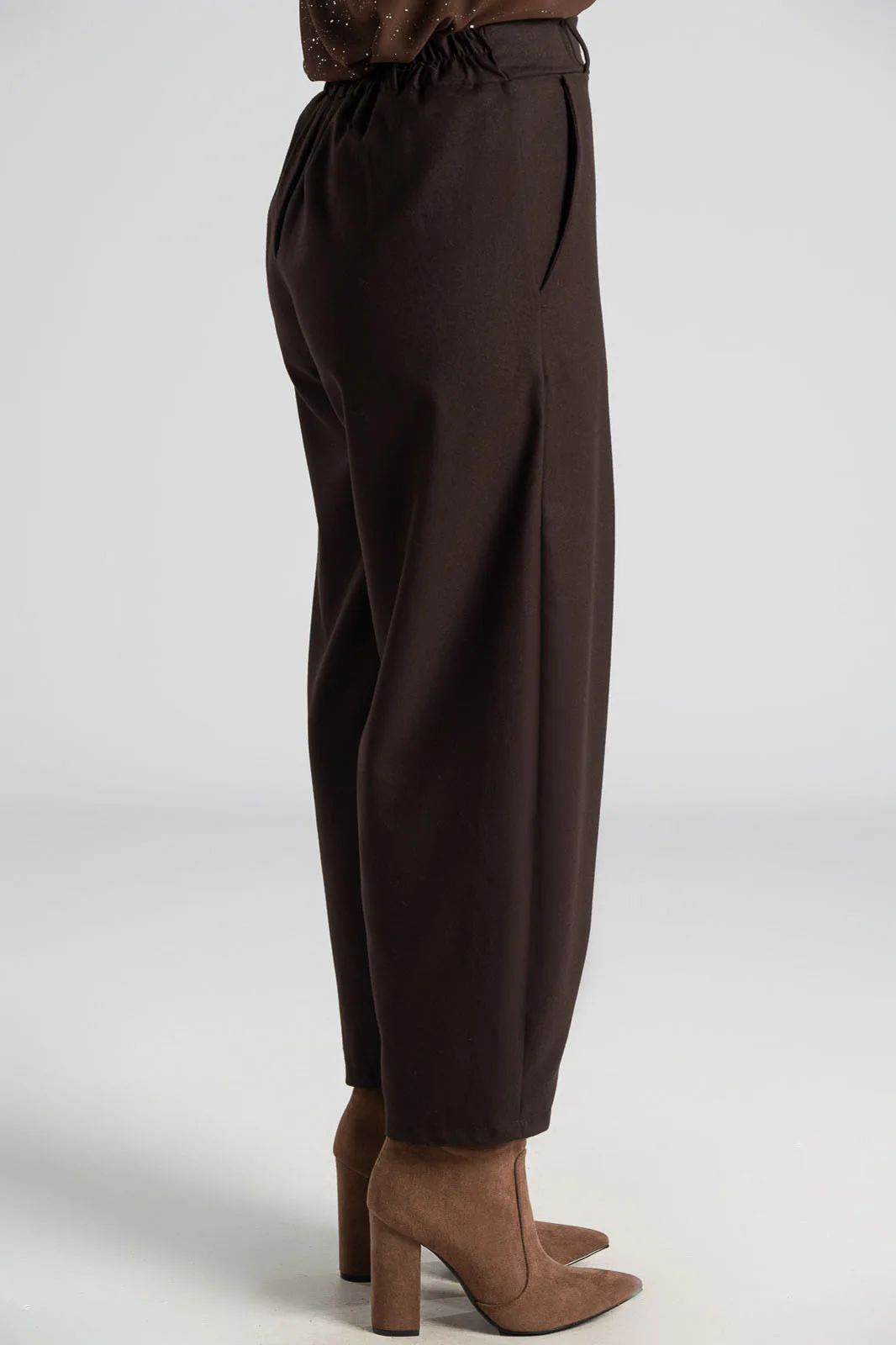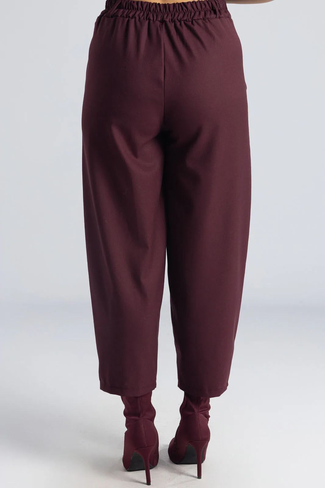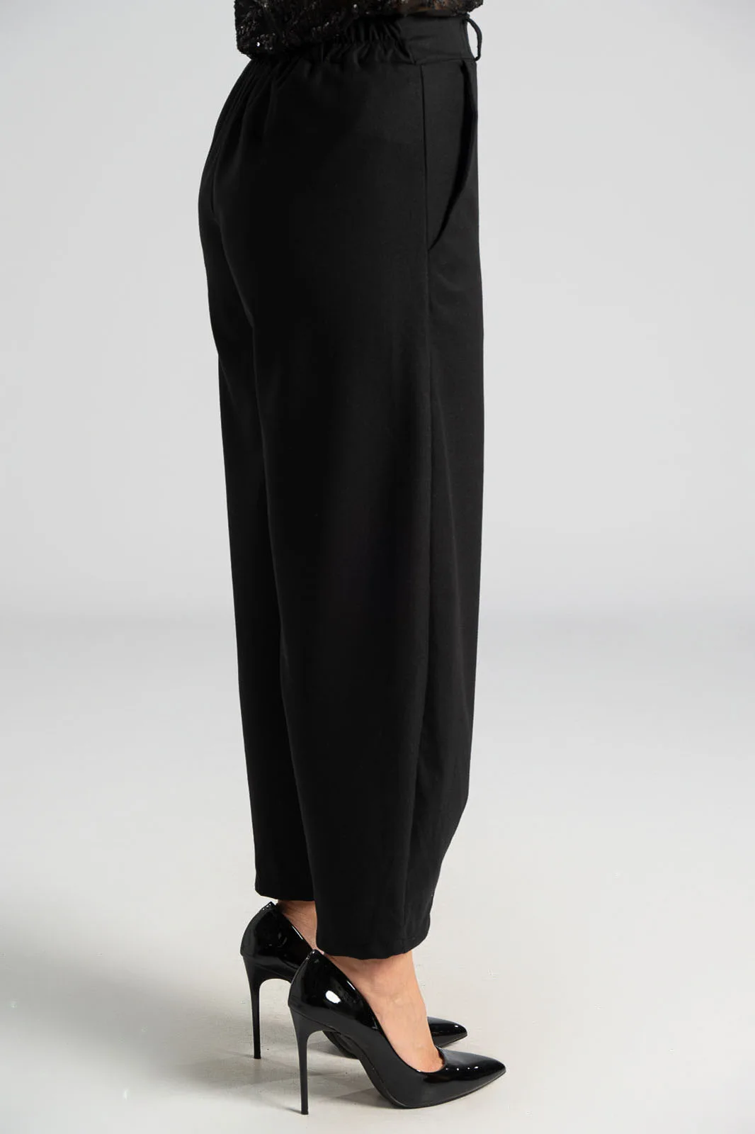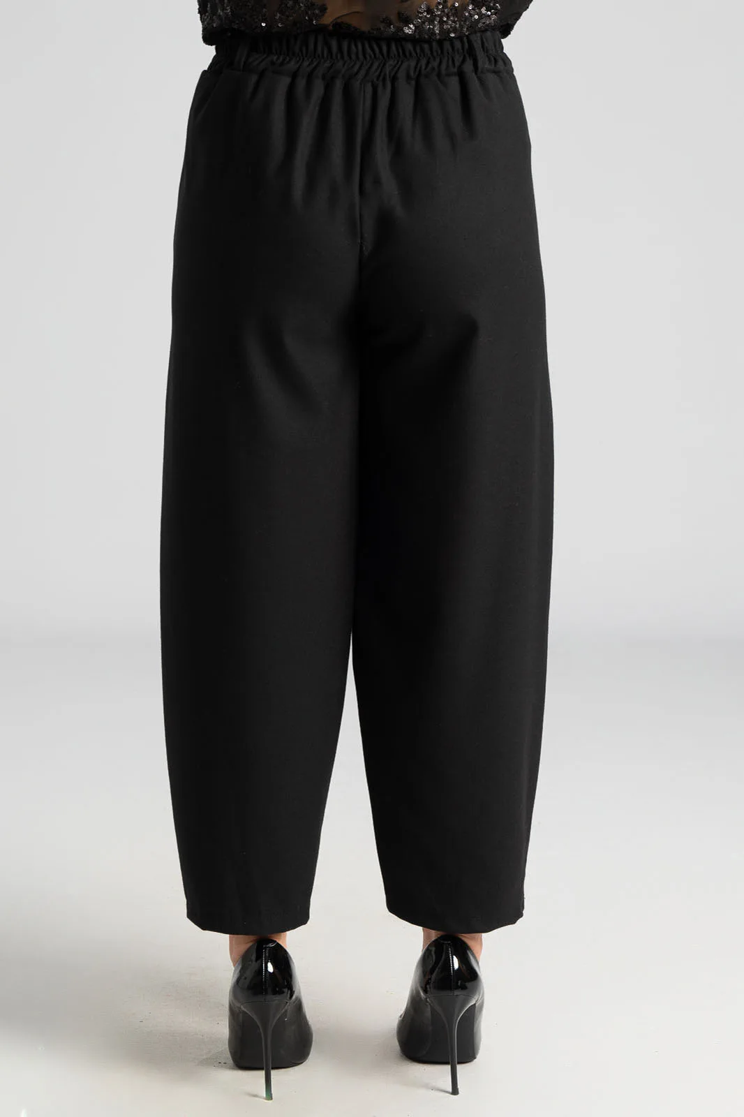 Παντελόνι υφασμάτινο. Στο πίσω μέρος διαθέτει λάστιχο για καλύτερη εφαρμογή. Στα πλαινά έχει τσέπες. Στο τελείωμα στενεύει και στο πίσω μέρος έχει μικρή πιέτα. Οι μετρήσεις του πίνακα είναι αντιπροσωπευτικές για κάθε προϊόν. 33% viscose, 65% polyester, 2% elastan.
