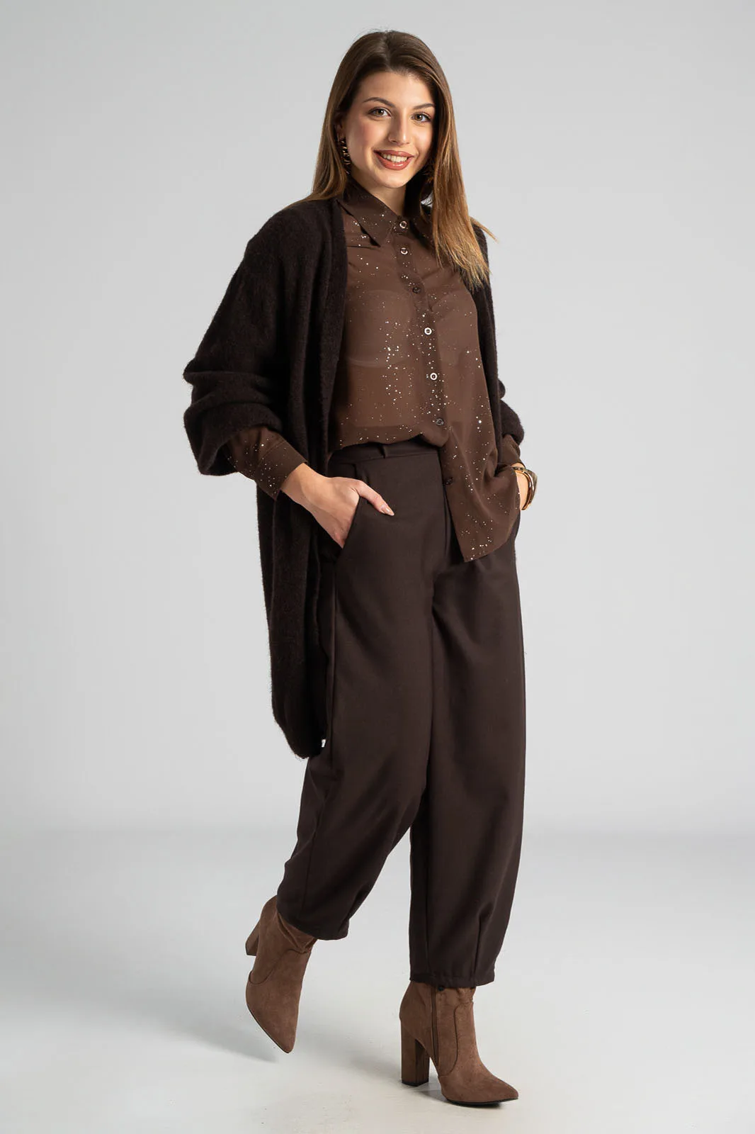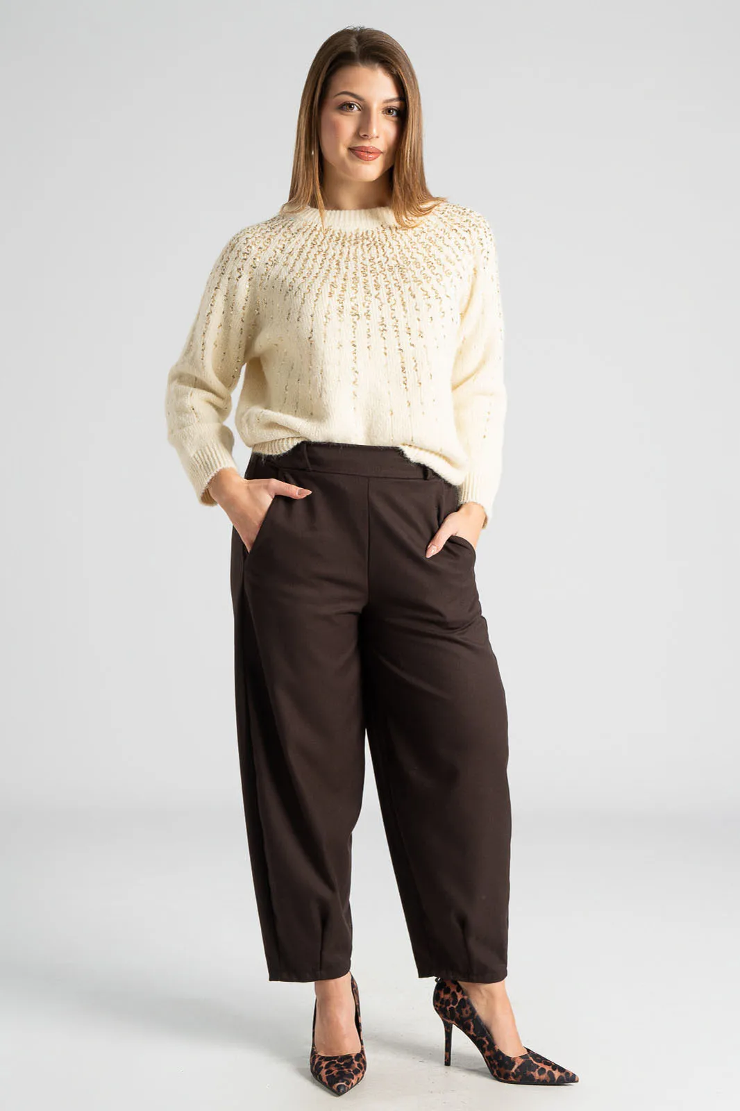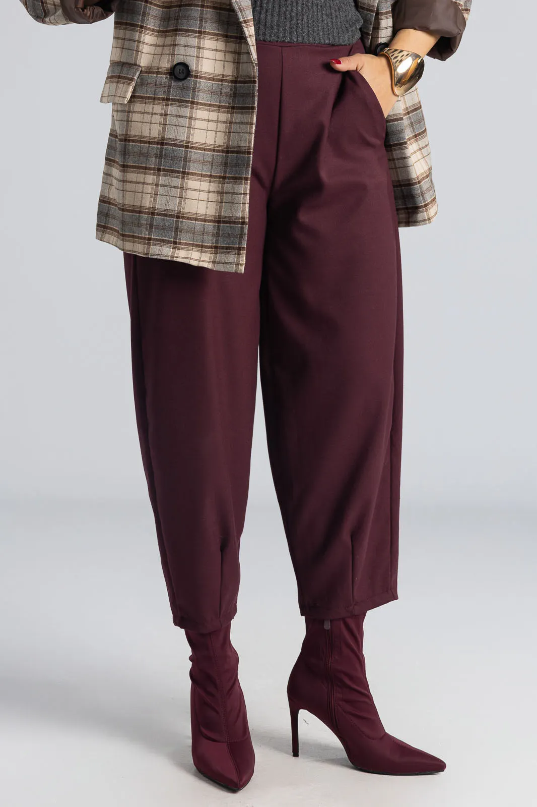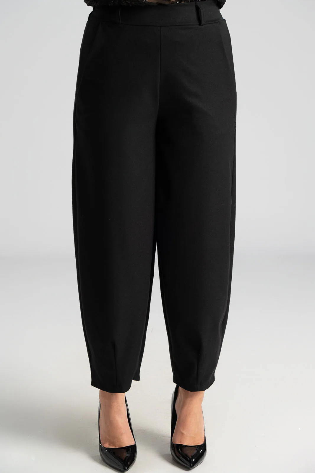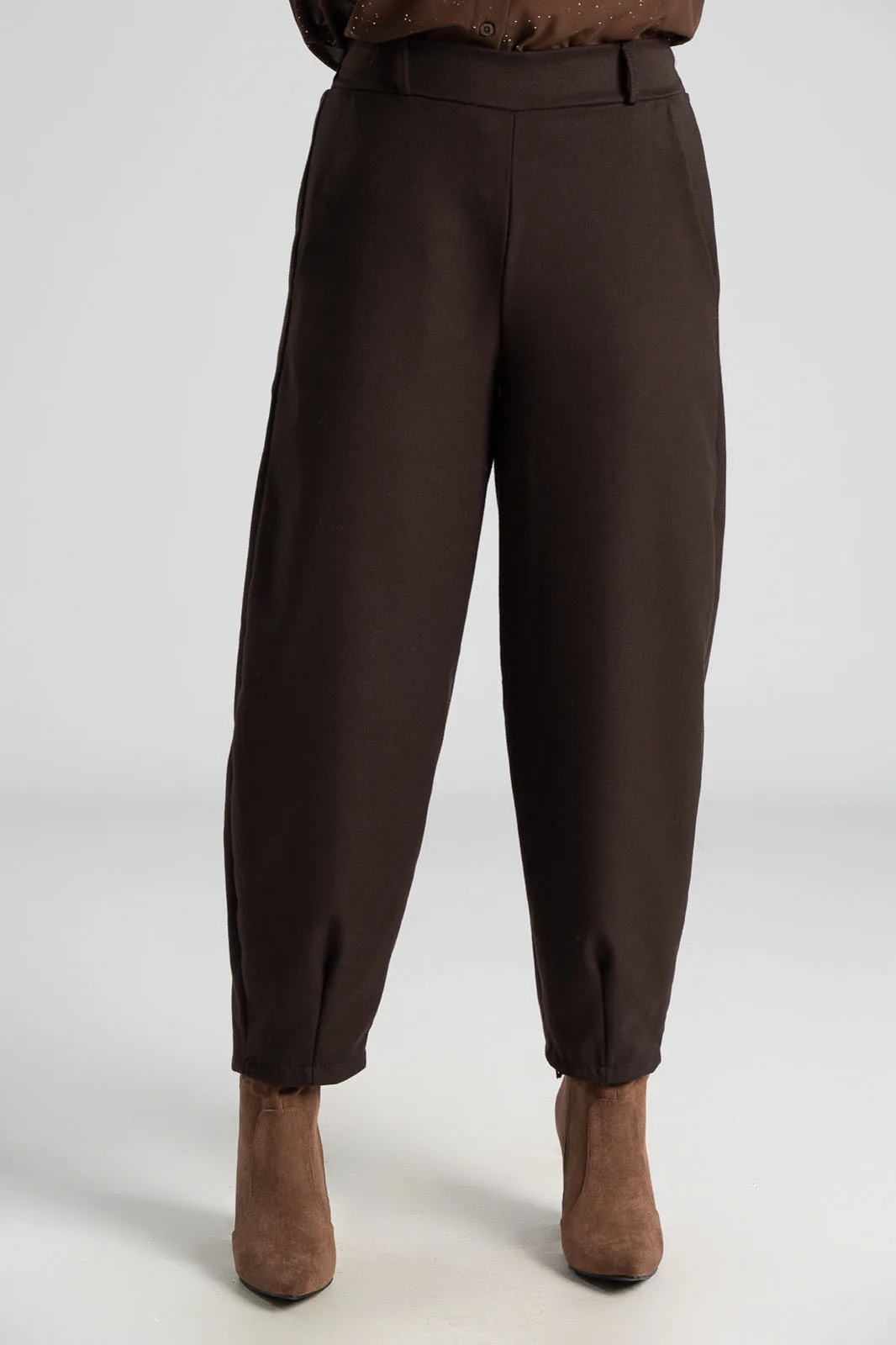 Παντελόνι υφασμάτινο. Στο πίσω μέρος διαθέτει λάστιχο για καλύτερη εφαρμογή. Στα πλαινά έχει τσέπες. Στο τελείωμα στενεύει και στο πίσω μέρος έχει μικρή πιέτα. Οι μετρήσεις του πίνακα είναι αντιπροσωπευτικές για κάθε προϊόν. 33% viscose, 65% polyester, 2% elastan.