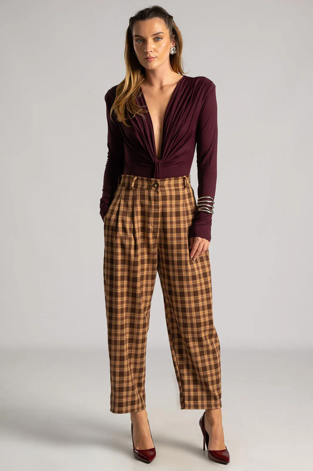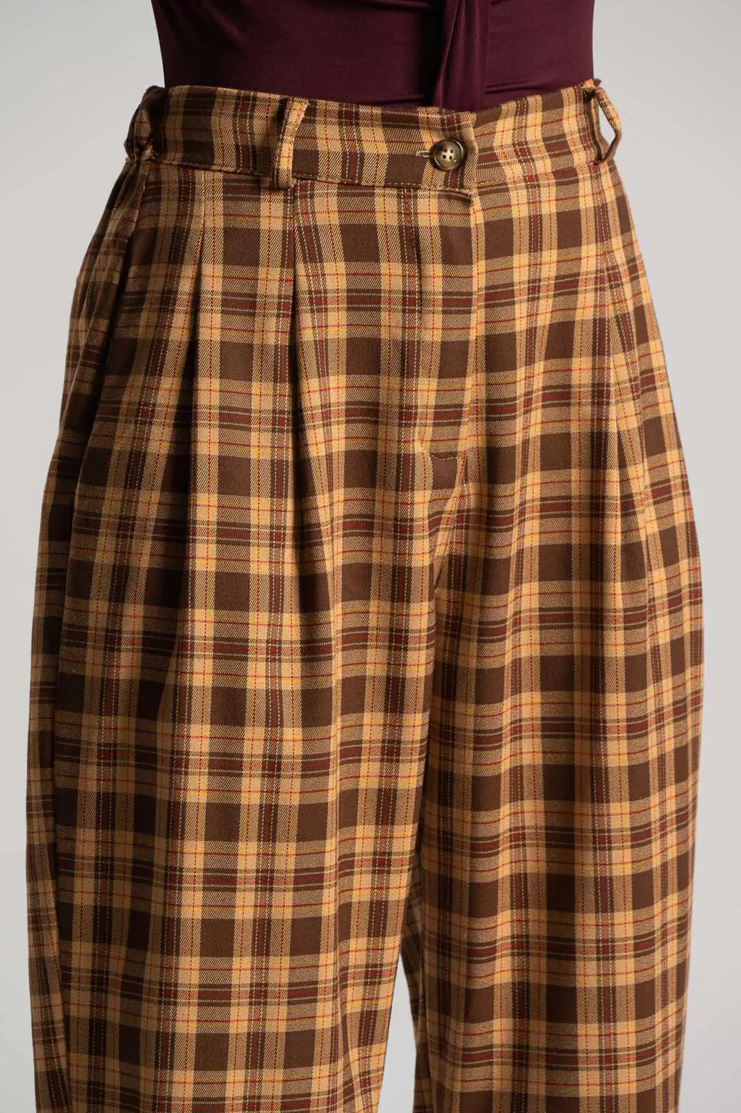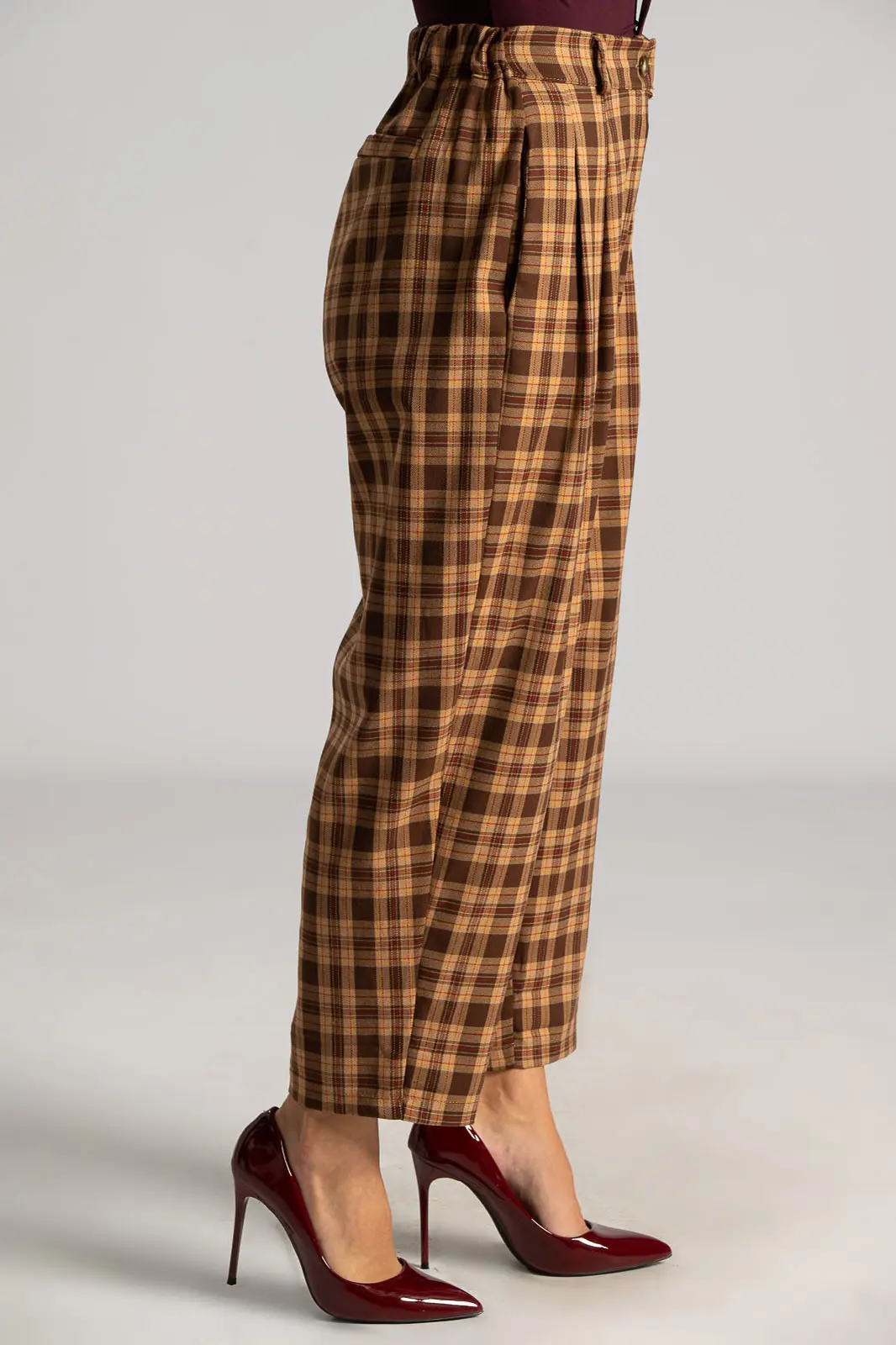 Trousers with elastic at the back. Fastens with a button and zipper. Checkered pattern. Pleats around the waist. Two side pockets and two faux pockets at the back. They are slightly baggy at the top and taper at the bottom. The measurements in the table are representative for each code. 64% polyester, 34% viscose, 2% elastane.