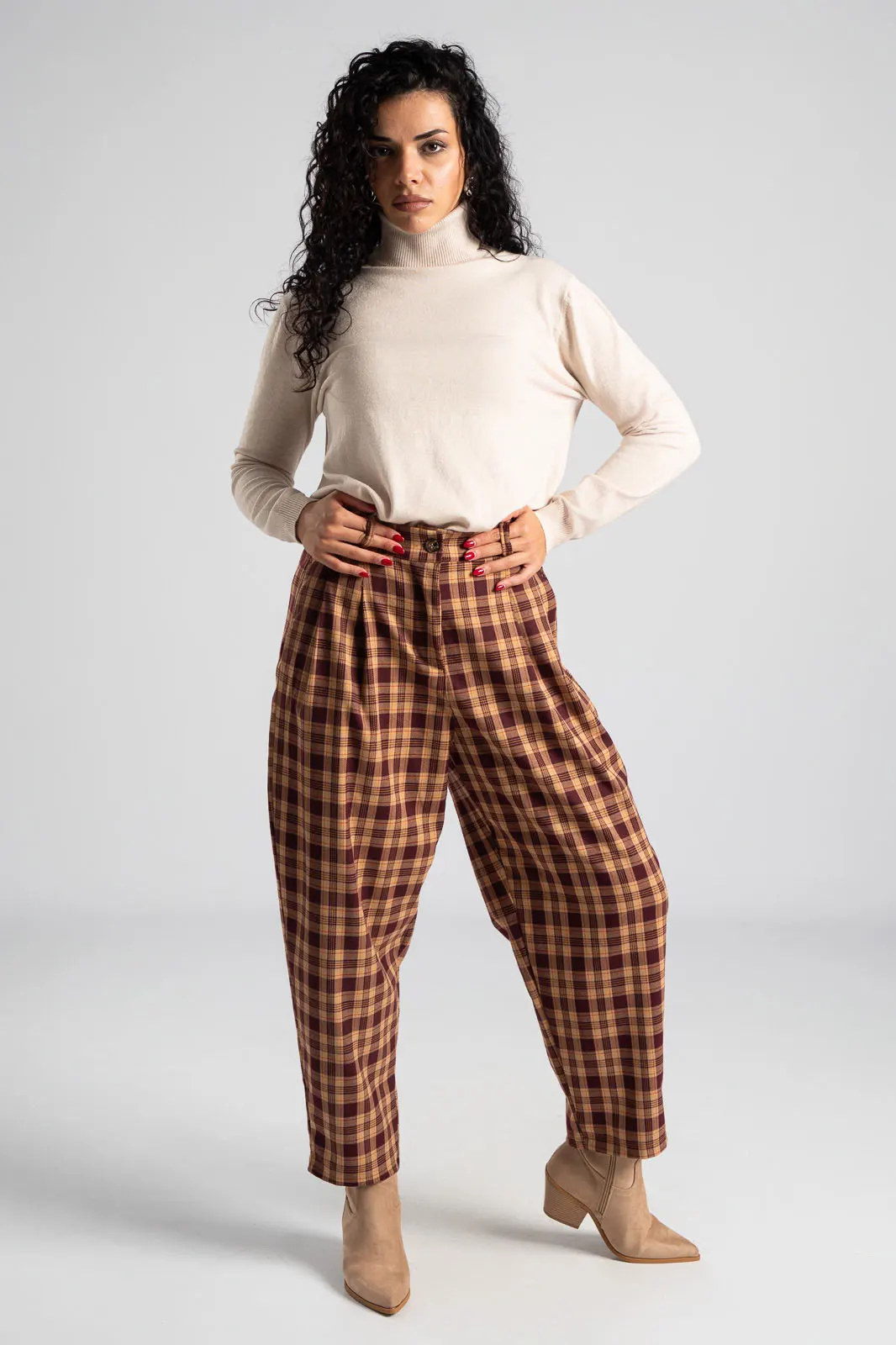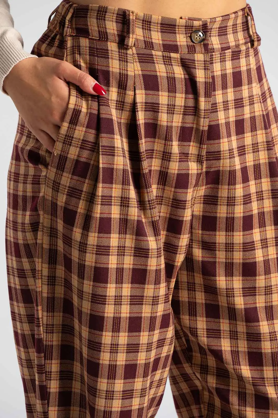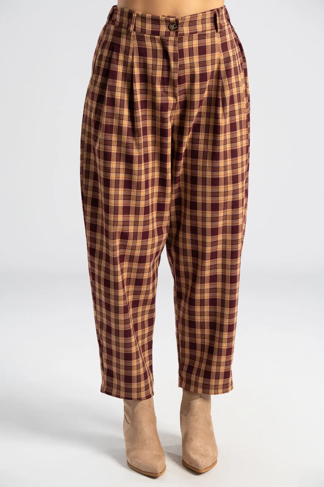Παντελόνι με λάστιχο στην πίσω πλευρά. Kλείνει με κουμπί και φερμουάρ. Είναι σε καρό σχέδιο. Διαθέτει πιέτες περιμετρικά στο ύψος της μέσης. Έχει δυο πλαινές τσέπες και δυο εικονικές στην πίσω πλευρά. Είναι ελαφρώς πιο baggy στην πάνω μεριά και στενεύει στο κάτω μέρος. Οι μετρήσεις του πίνακα είναι αντιπροσωπευτικές για κάθε κωδικό. 64% polyester, 34% viscose, 2% elastan.