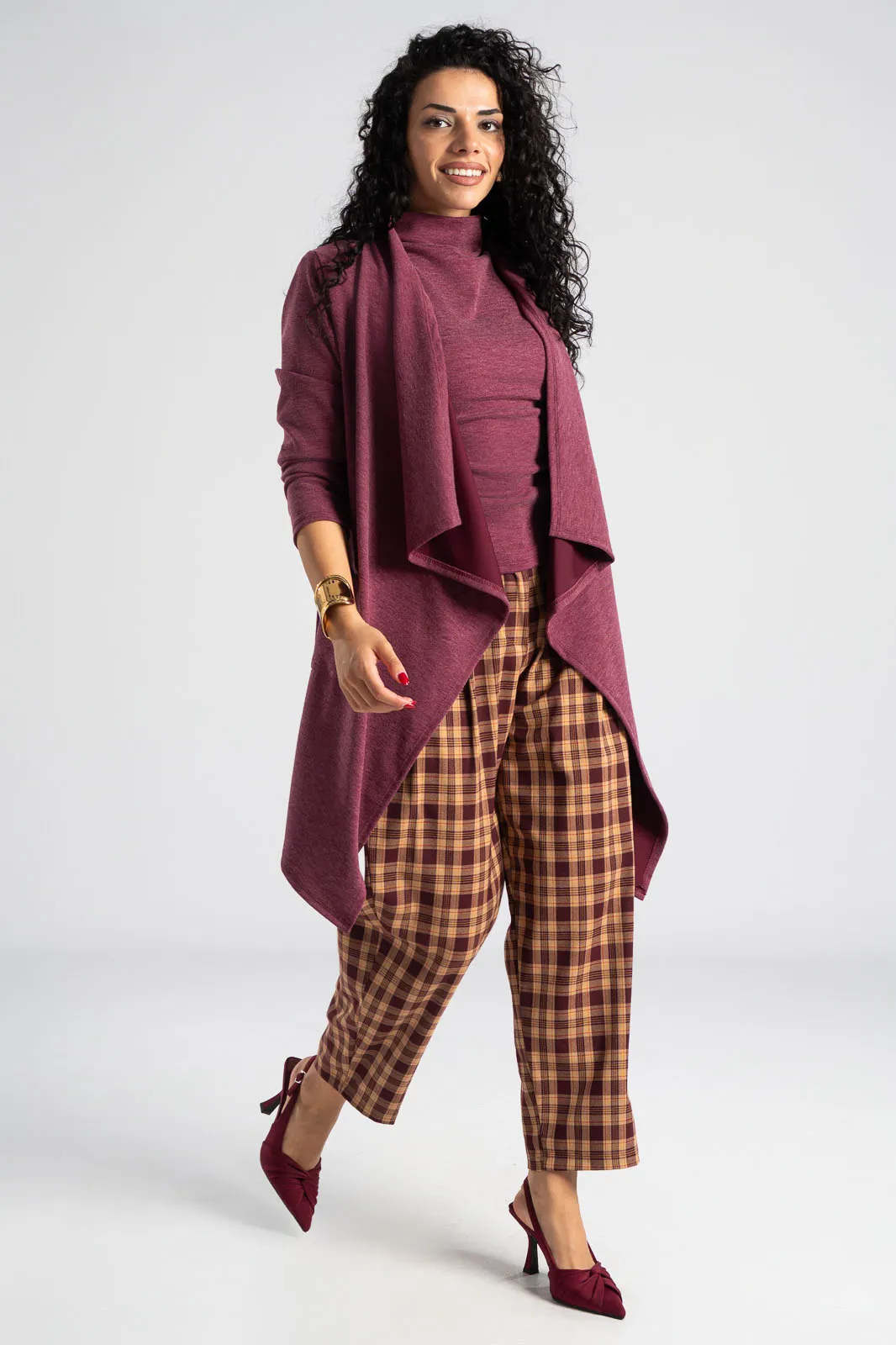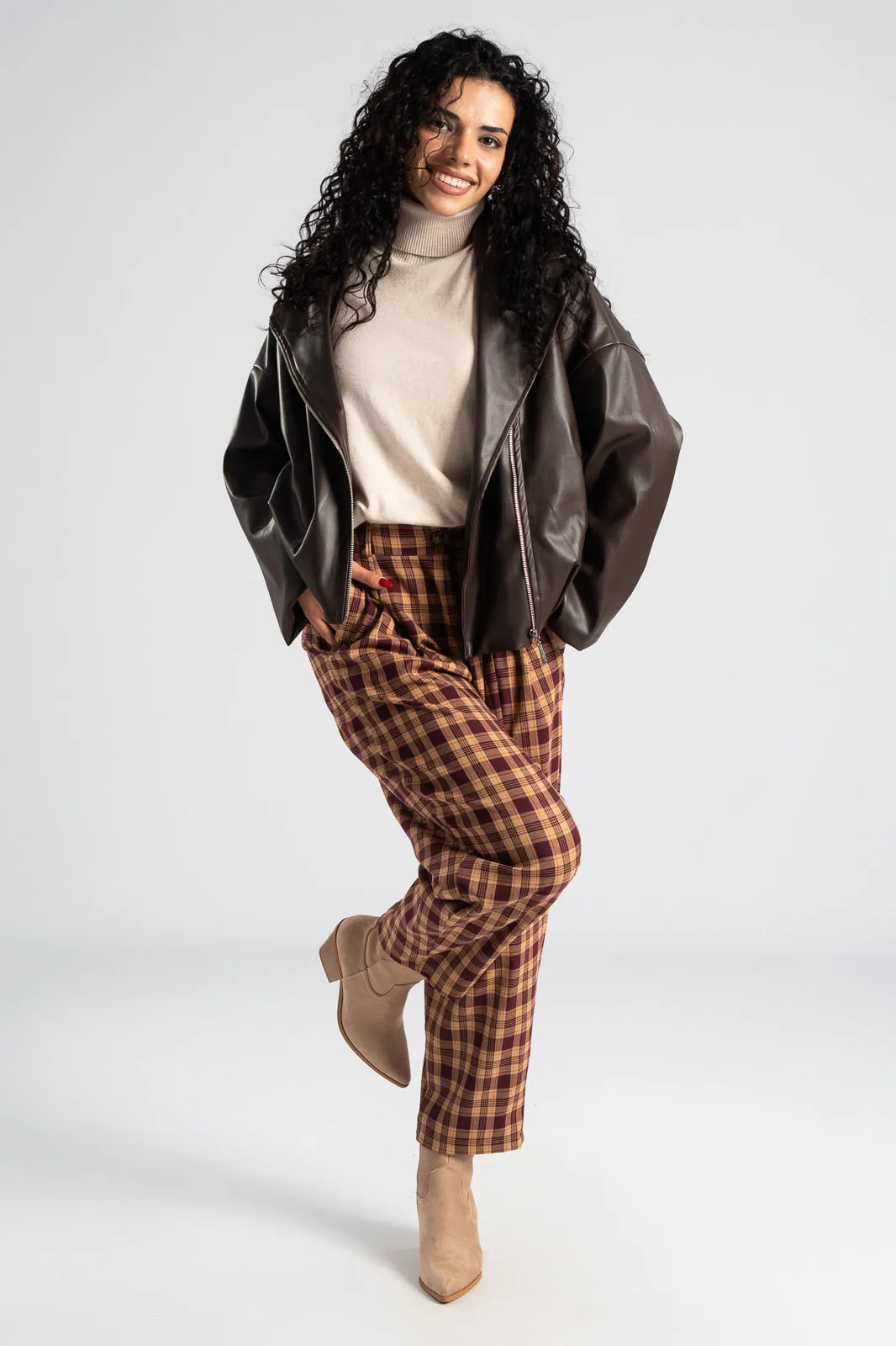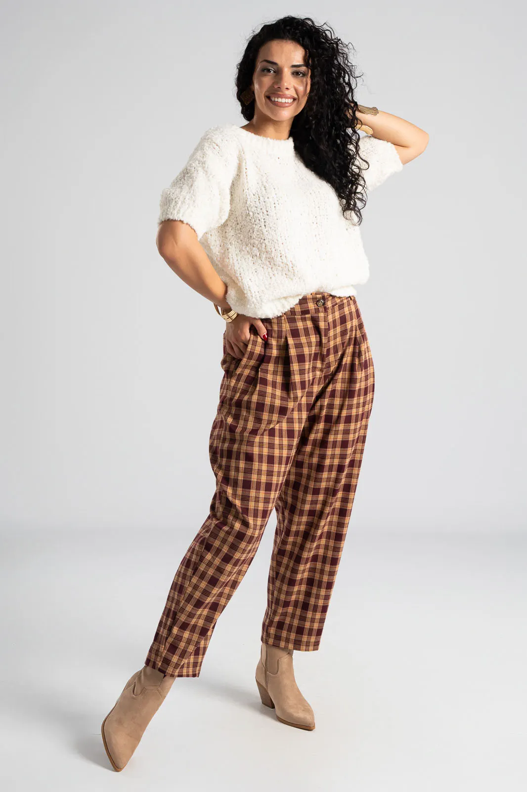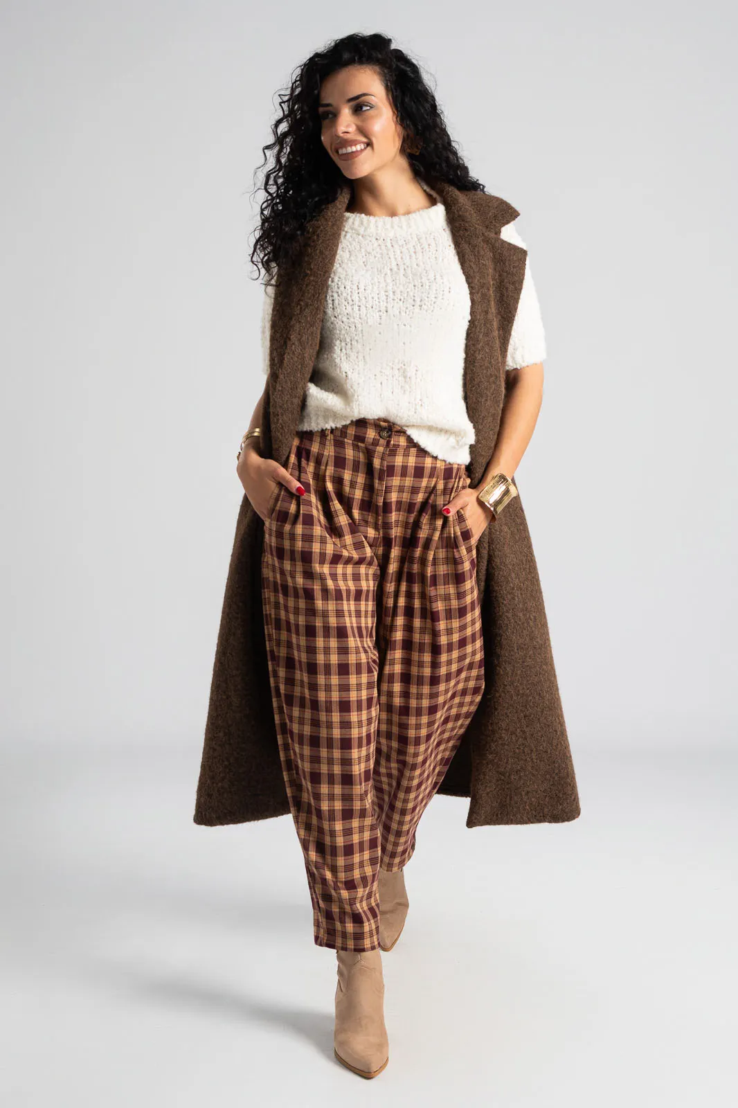 Παντελόνι με λάστιχο στην πίσω πλευρά. Kλείνει με κουμπί και φερμουάρ. Είναι σε καρό σχέδιο. Διαθέτει πιέτες περιμετρικά στο ύψος της μέσης. Έχει δυο πλαινές τσέπες και δυο εικονικές στην πίσω πλευρά. Είναι ελαφρώς πιο baggy στην πάνω μεριά και στενεύει στο κάτω μέρος. Οι μετρήσεις του πίνακα είναι αντιπροσωπευτικές για κάθε κωδικό. 64% polyester, 34% viscose, 2% elastan.