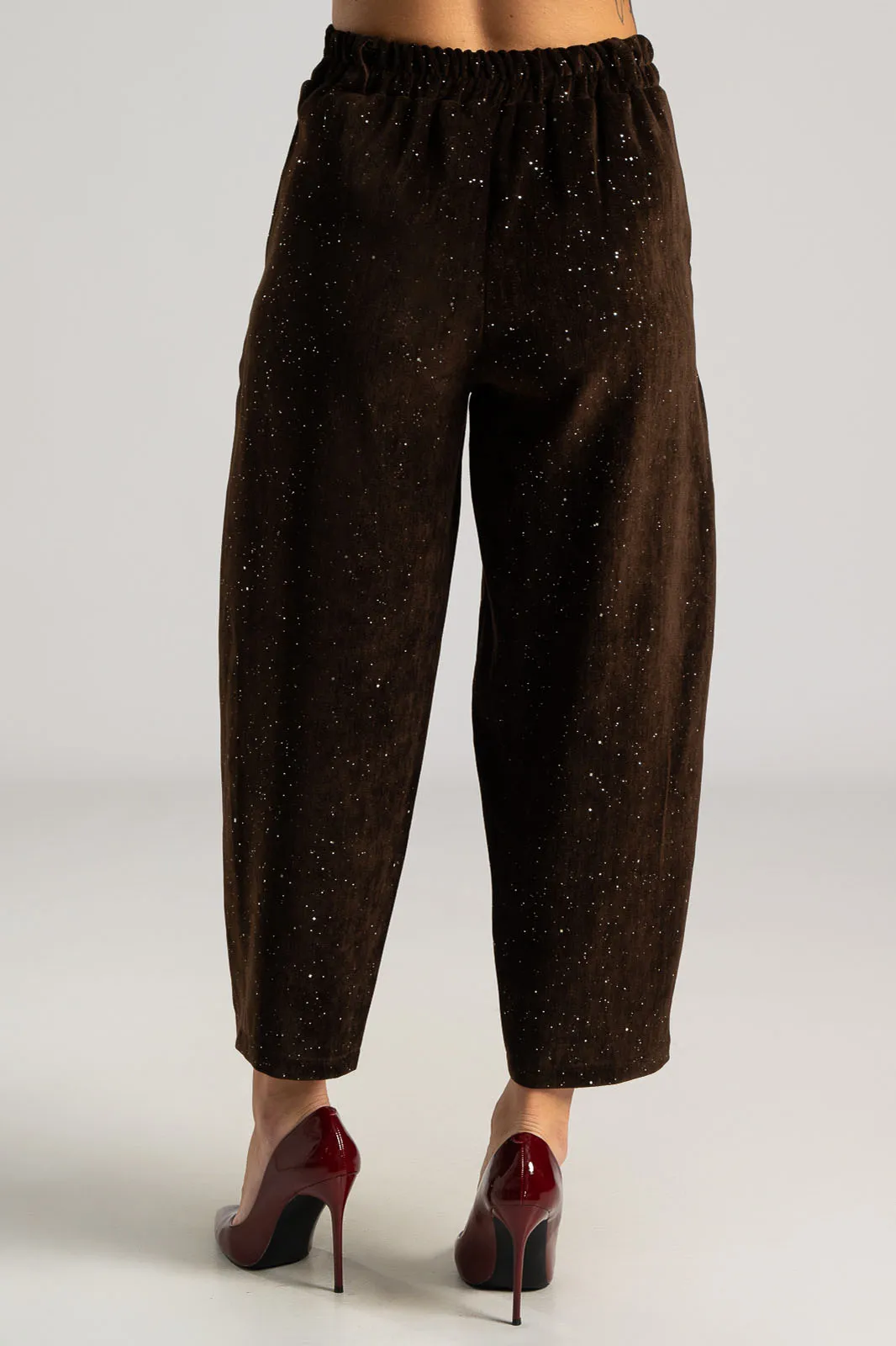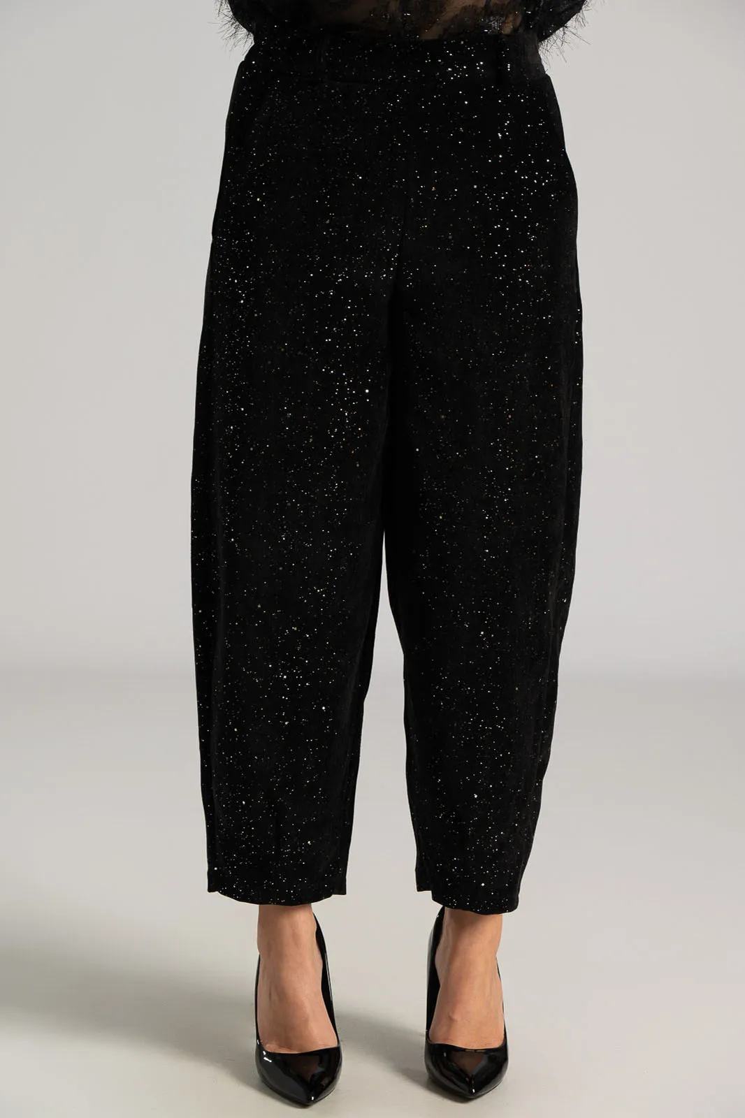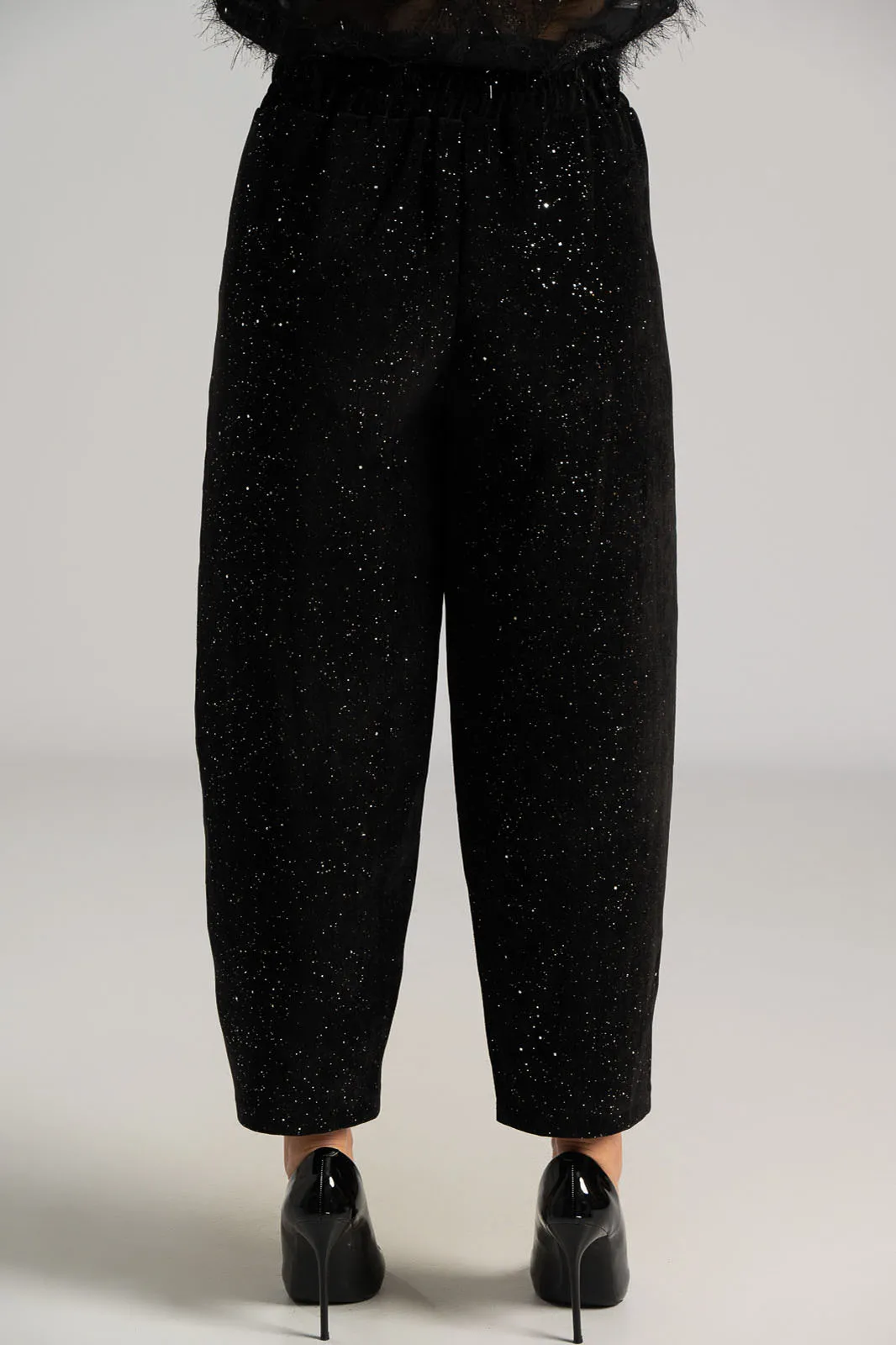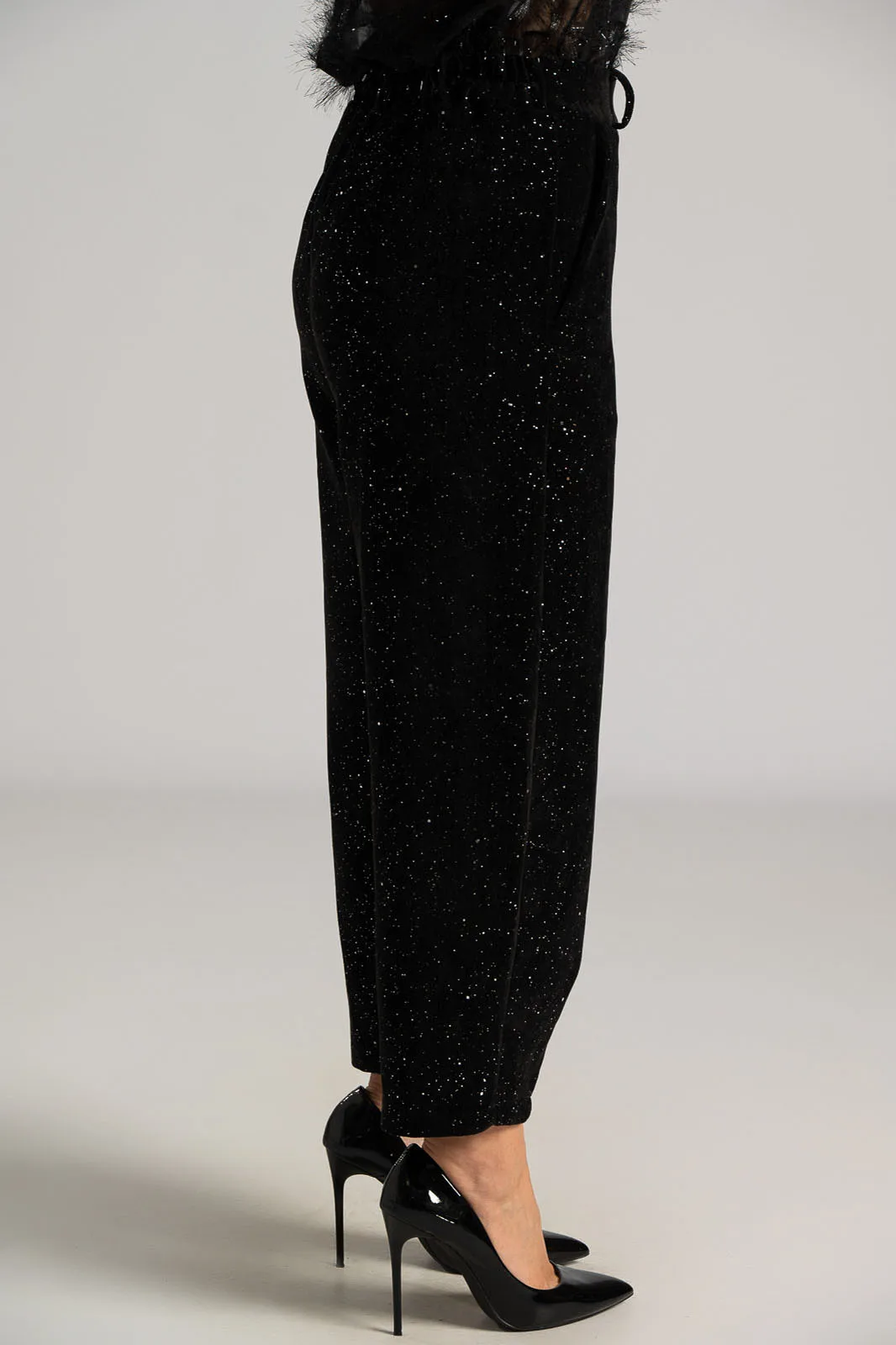 Pants with elastic at the back. Features side pockets. Velvet texture and decorative shimmer throughout. Slightly baggy at the top and tapered at the bottom. The measurements in the table are representative for each code. 93% polyester, 7% elastane.