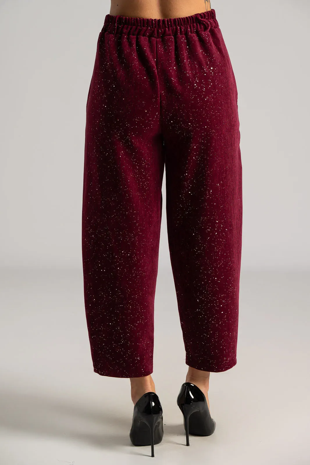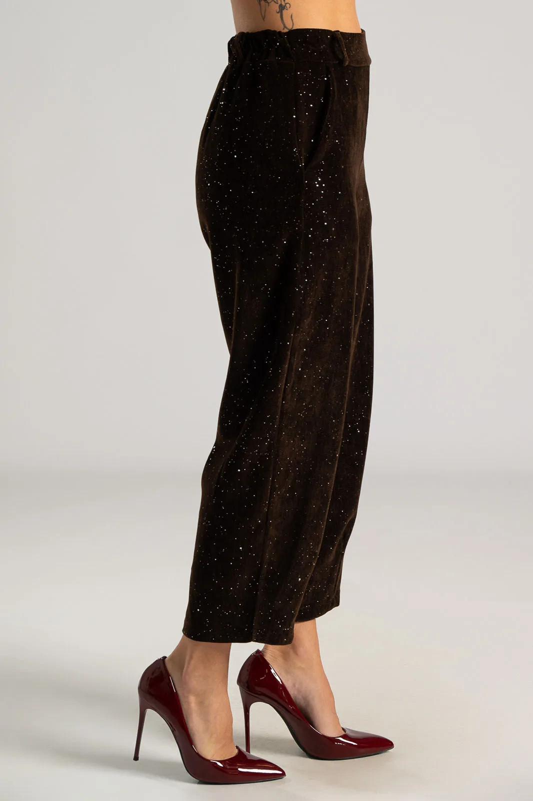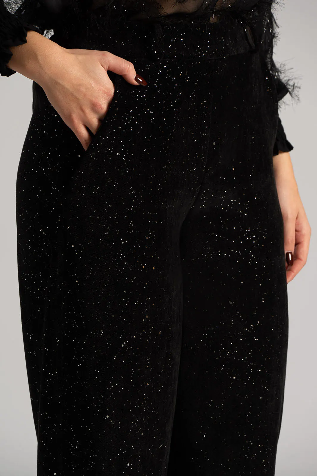 Pants with elastic at the back. Features side pockets. Velvet texture and decorative shimmer throughout. Slightly baggy at the top and tapered at the bottom. The measurements in the table are representative for each code. 93% polyester, 7% elastane.