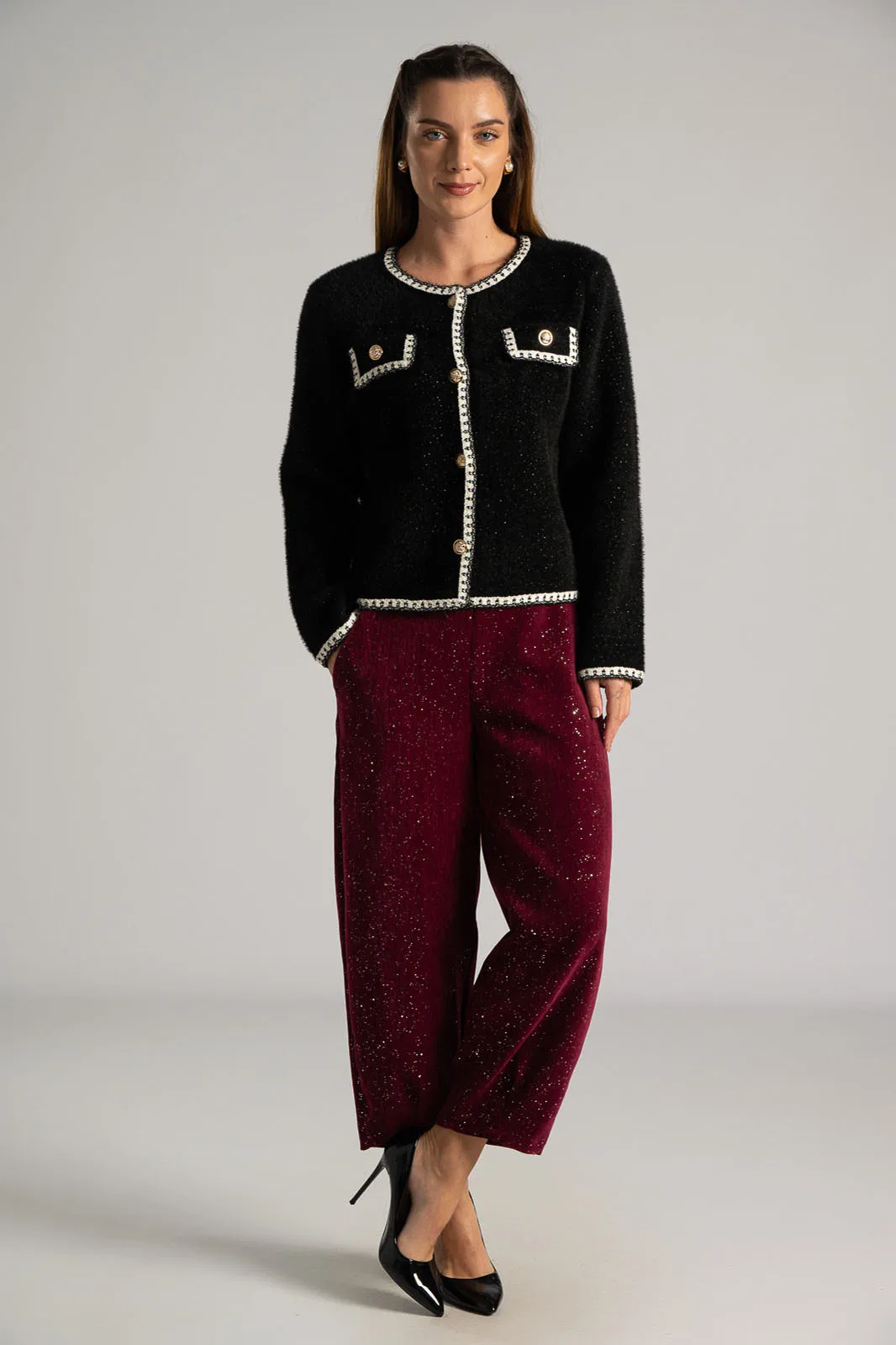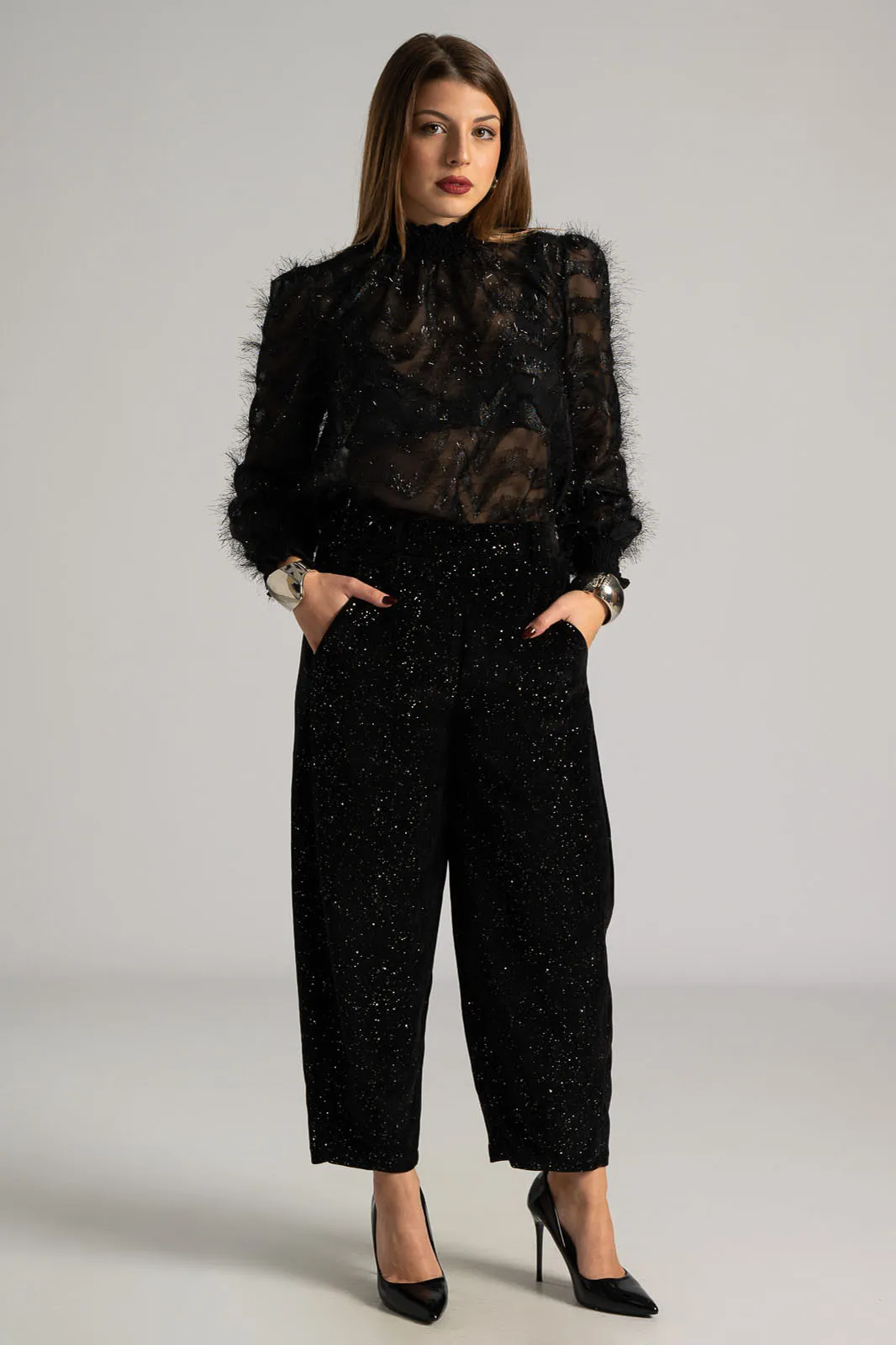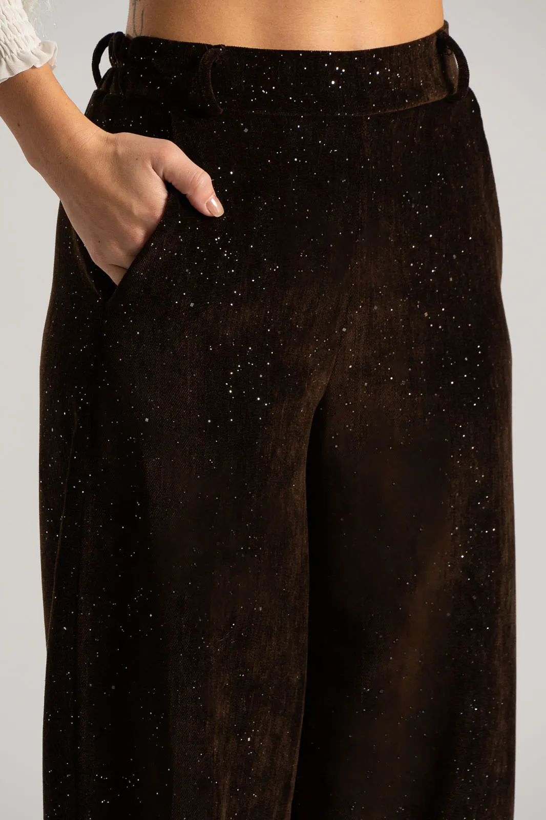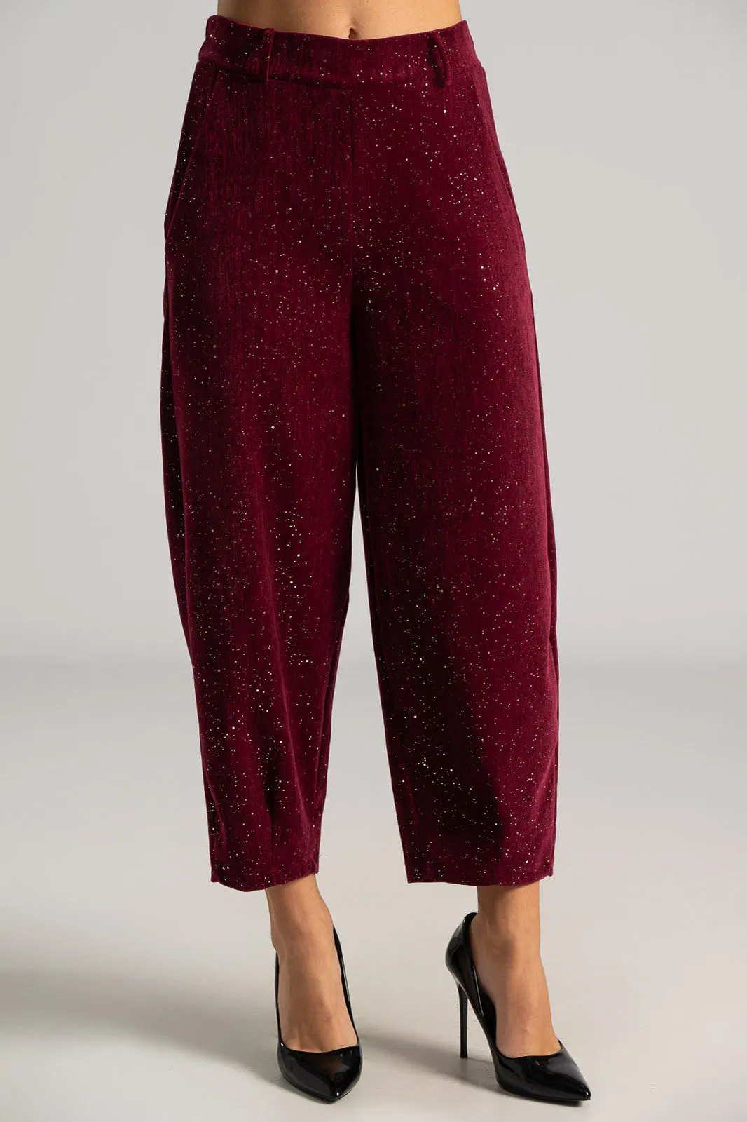 Pants with elastic at the back. Features side pockets. Velvet texture and decorative shimmer throughout. Slightly baggy at the top and tapered at the bottom. The measurements in the table are representative for each code. 93% polyester, 7% elastane.