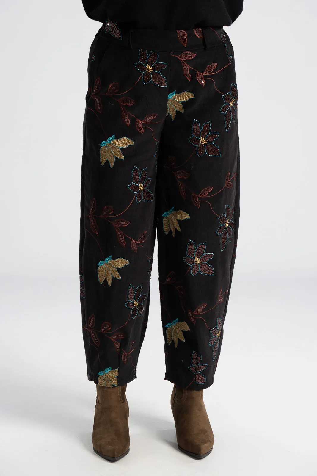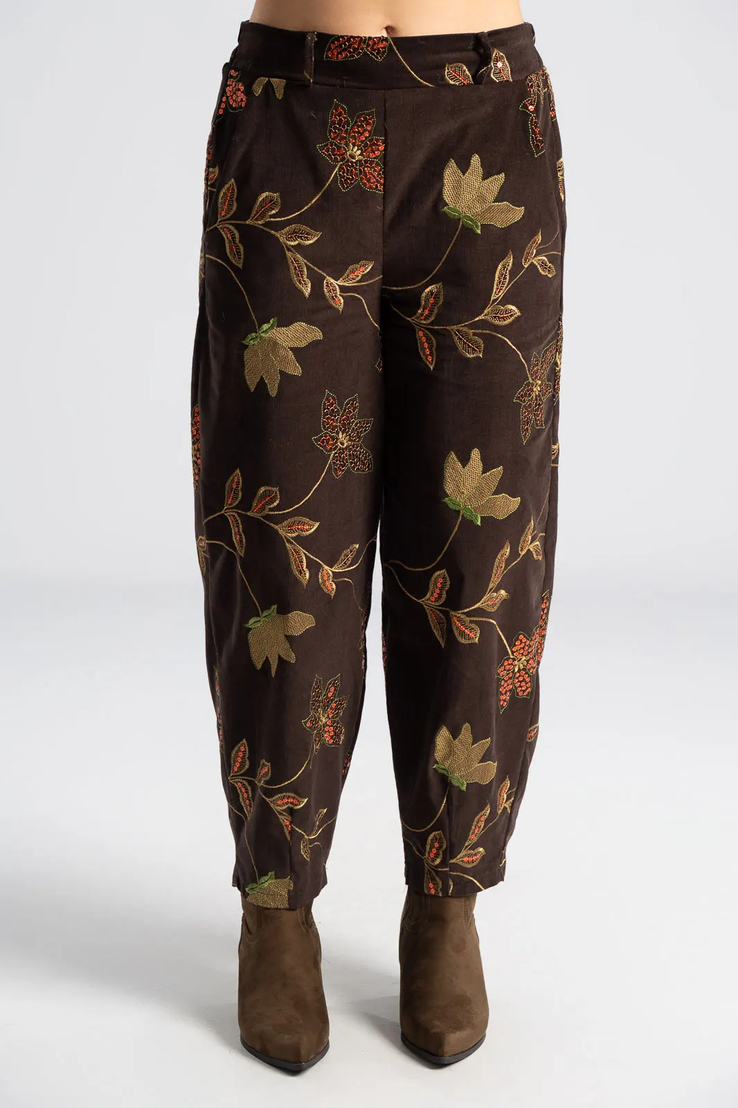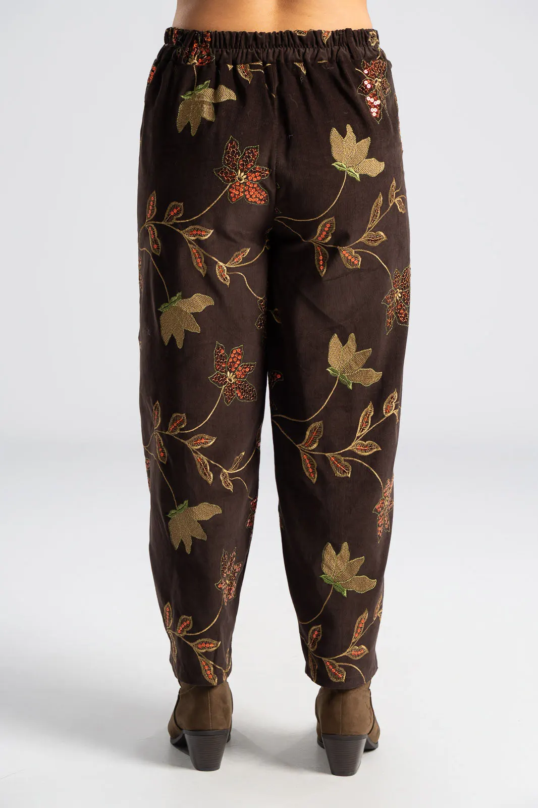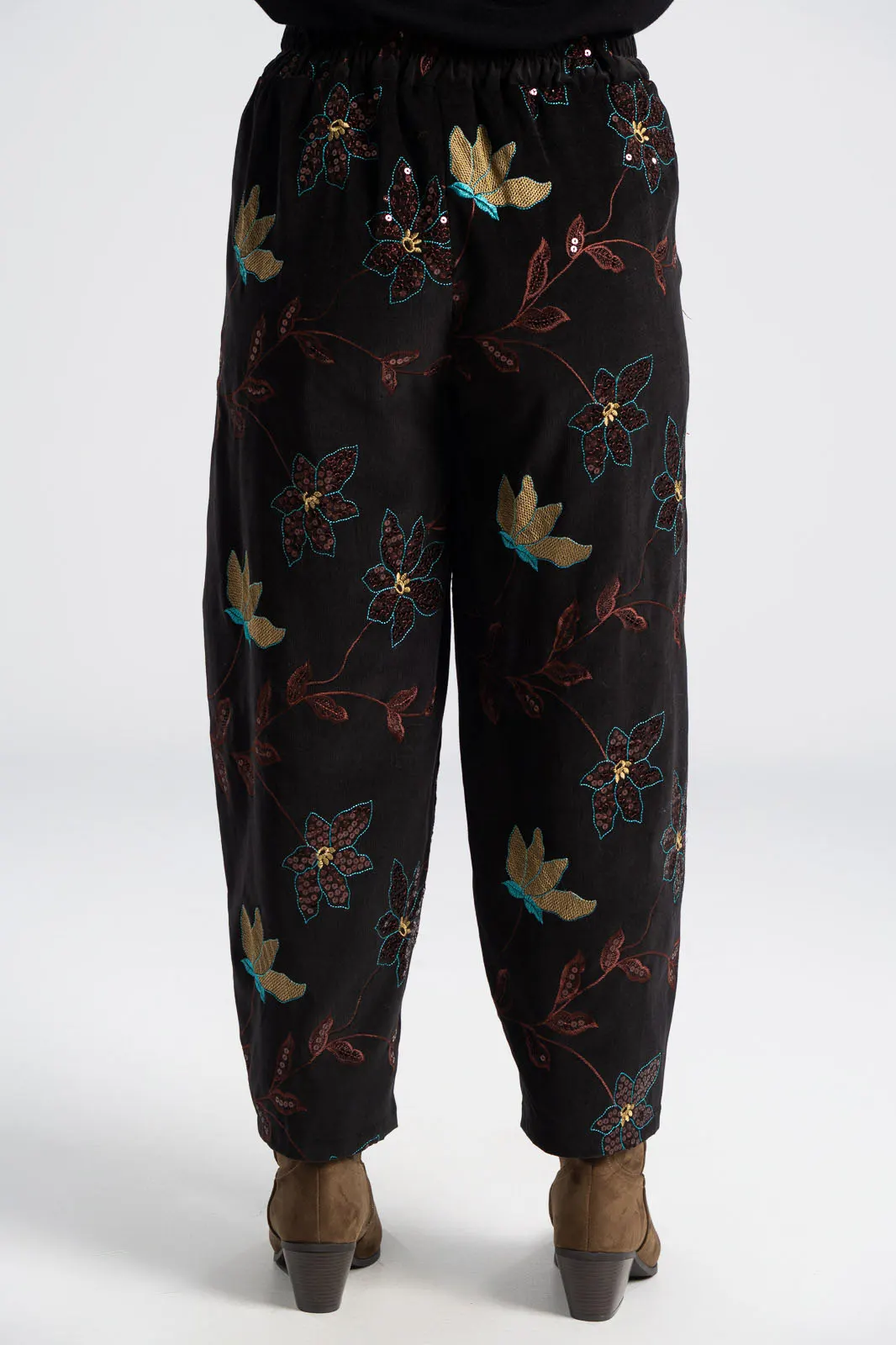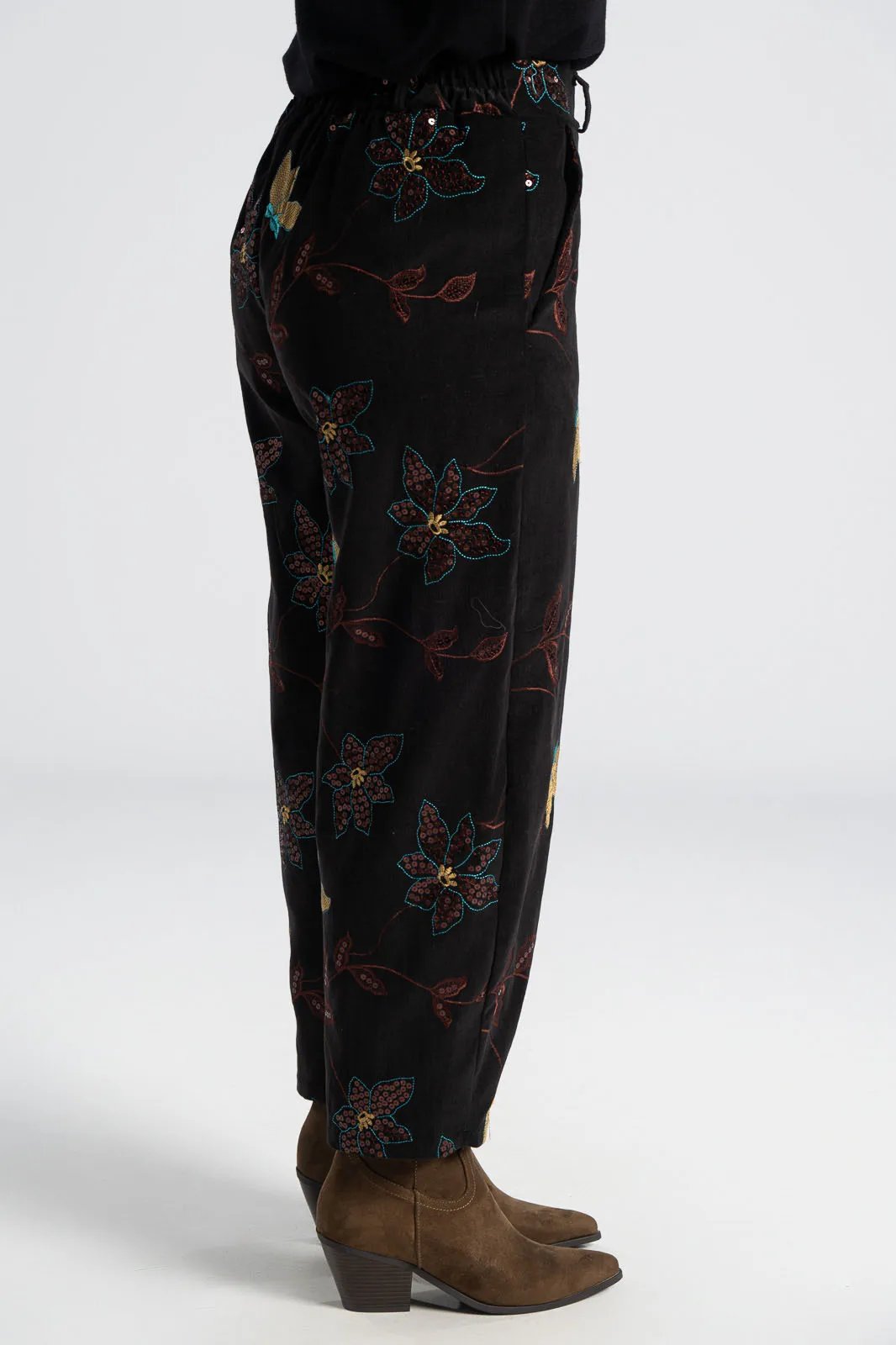 Παντελόνι βαμβακερό κοτλέ με λάστιχο στο πίσω μέρος για καλύτερη εφαρμογή. Είναι σε ίσια γραμμή και το ύφασμα του είναι πολύ μαλακό. Διαθέτει floral κεντητό σχέδιο και παγιέτες σε όλη την επιφάνεια του. Στα πλαινά δειαθέτει τσέπες. Οι μετρήσεις του πίνακα είναι αντιπροσωπευτικές για κάθε κωδικό. 100% cotton.
