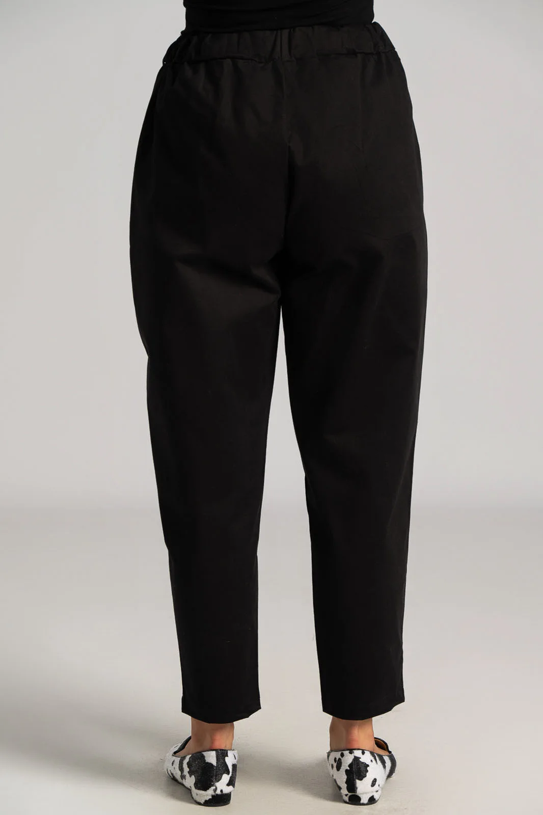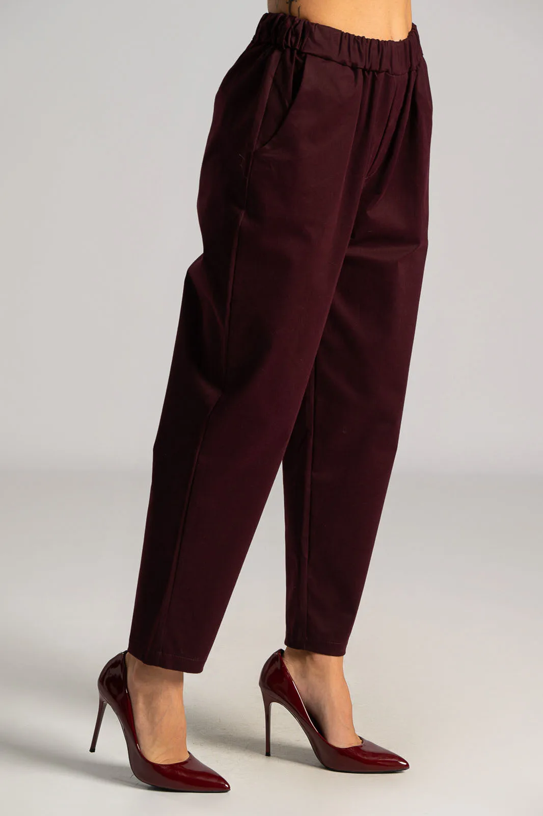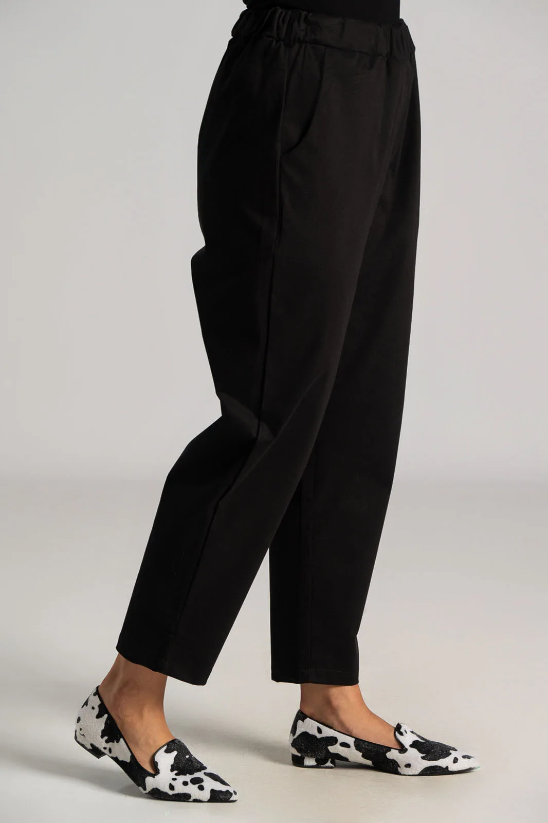 Pants with elastic waistband for a better fit. Soft texture. Side pockets. Slightly baggy with a tapered bottom. The measurements in the table are representative of each product. 80% cotton, 17% viscose, 3% elastane.