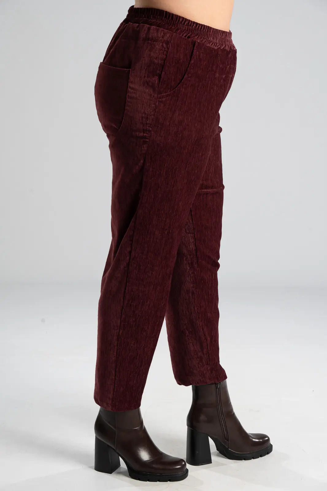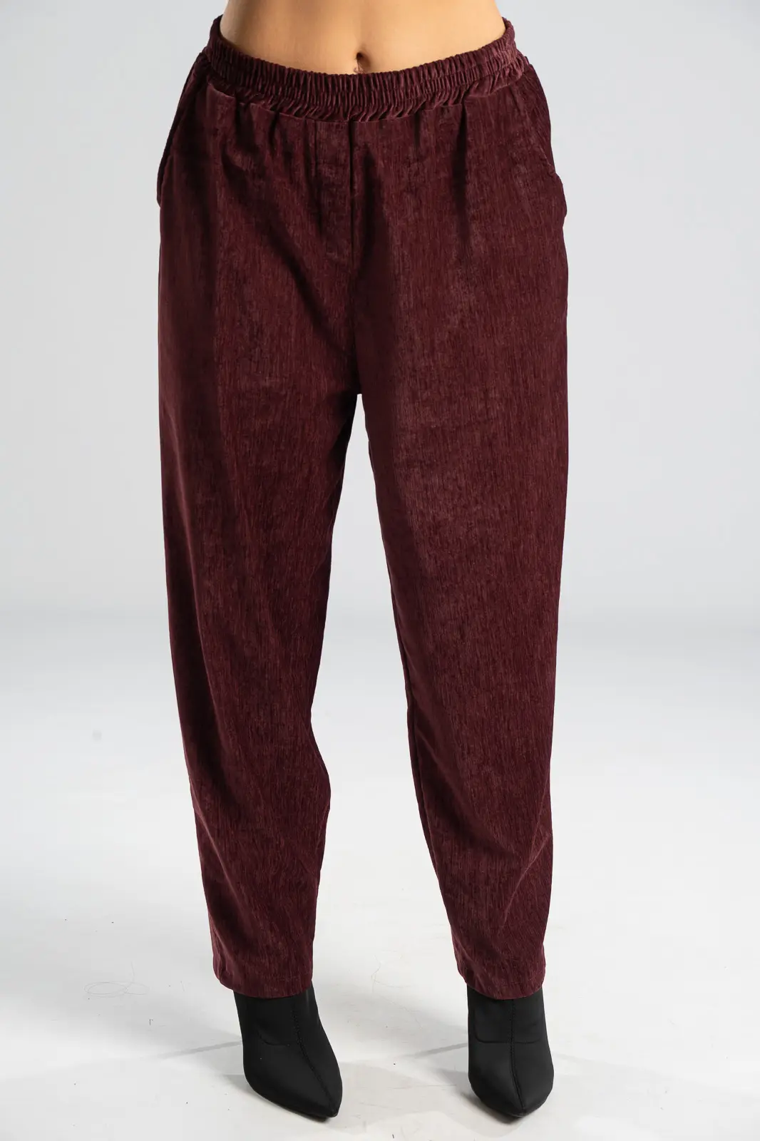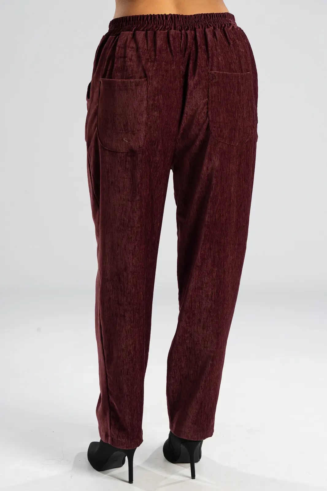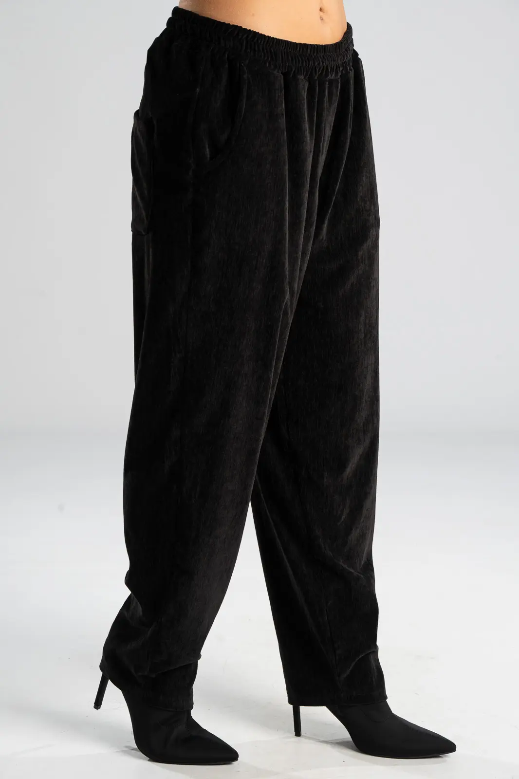 Παντελόνι velvet με λάστιχο περιμετρικά για καλύτερη εφαρμογή. Είναι σε ίσια γραμμή και το ύφασμα του είναι πολύ μαλακό. Στα πλαινά και στο πίσω μέρος έχει τσέπες. Οι μετρήσεις του πίνακα είναι αντιπροσωπευτικές για κάθε κωδικό. 96% polyester, 4% elastan.