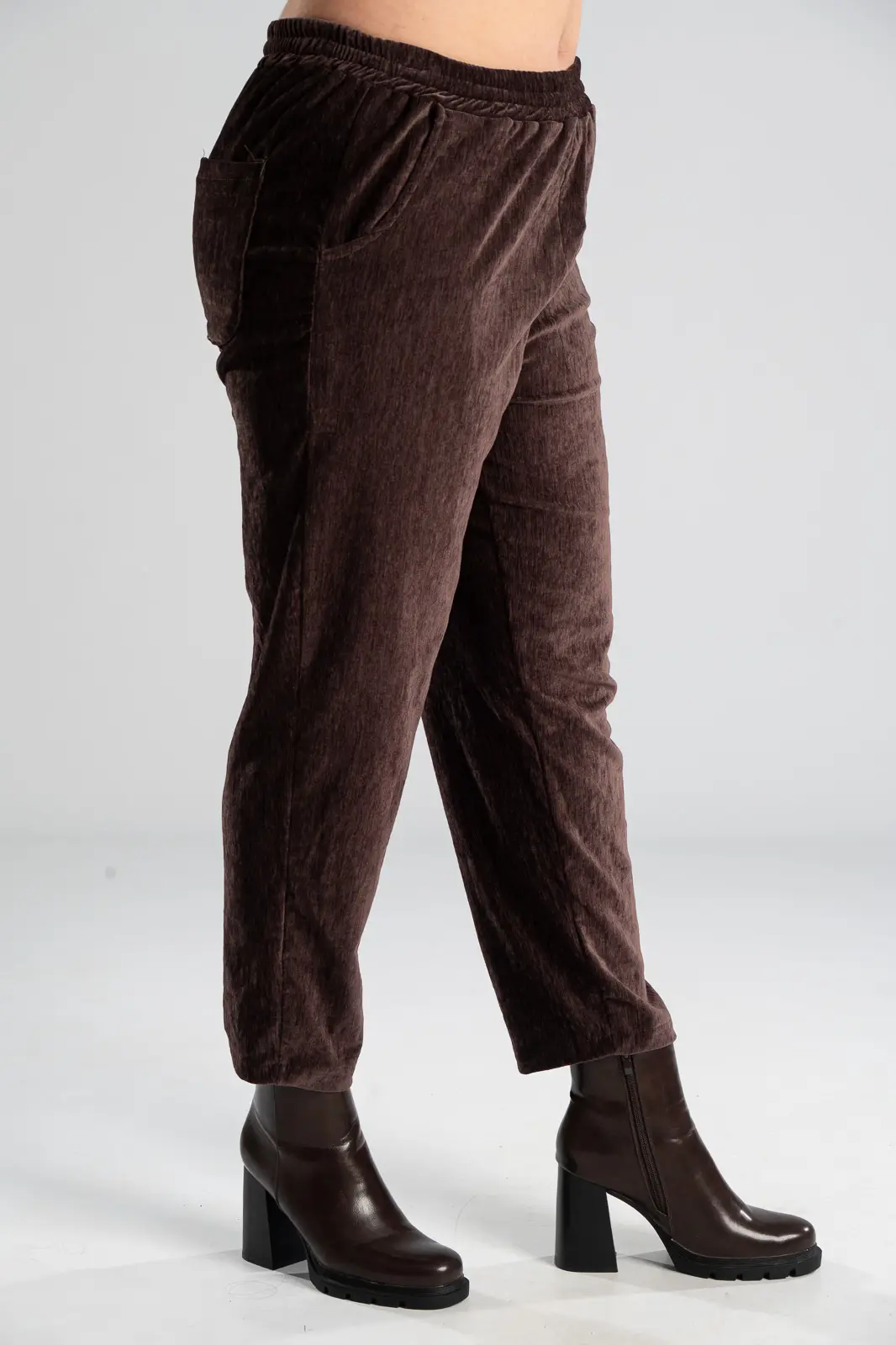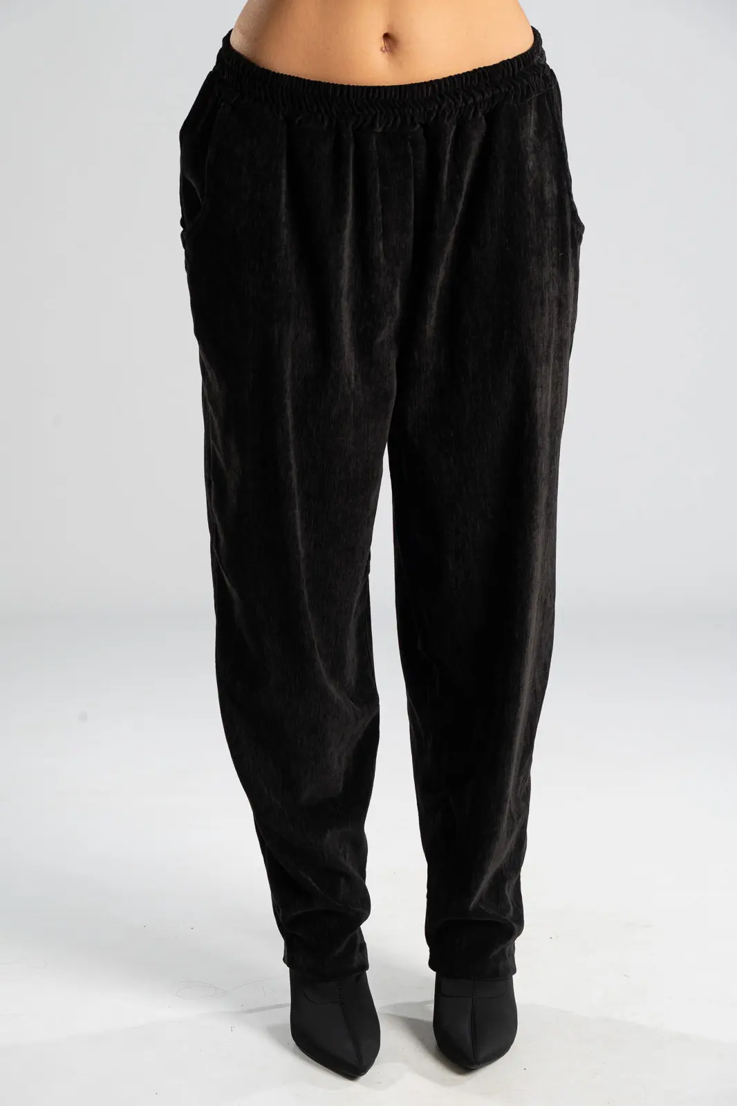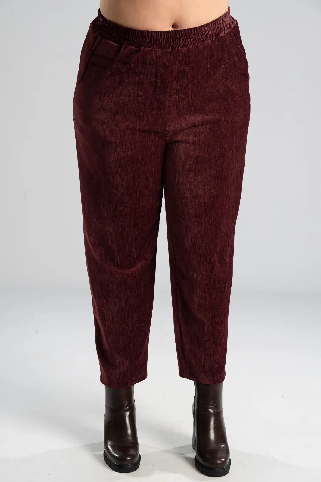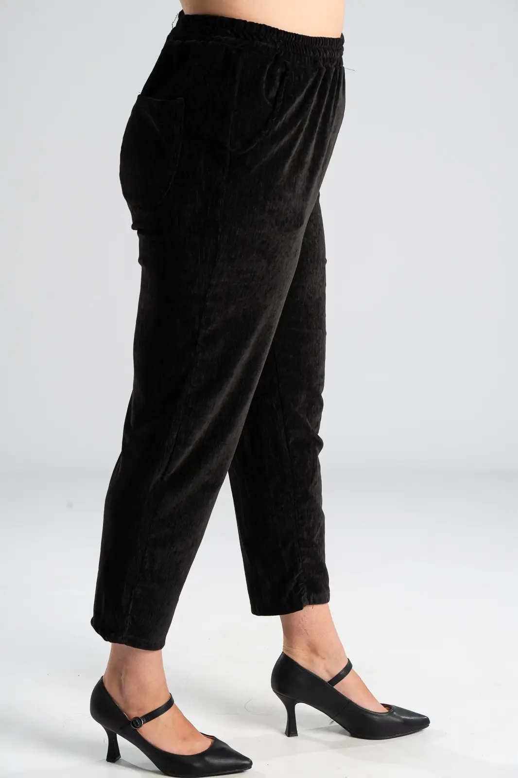 Παντελόνι velvet με λάστιχο περιμετρικά για καλύτερη εφαρμογή. Είναι σε ίσια γραμμή και το ύφασμα του είναι πολύ μαλακό. Στα πλαινά και στο πίσω μέρος έχει τσέπες. Οι μετρήσεις του πίνακα είναι αντιπροσωπευτικές για κάθε κωδικό. 96% polyester, 4% elastan.