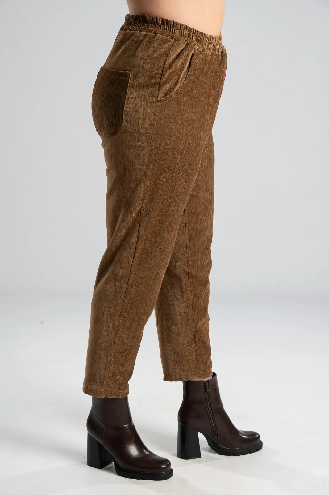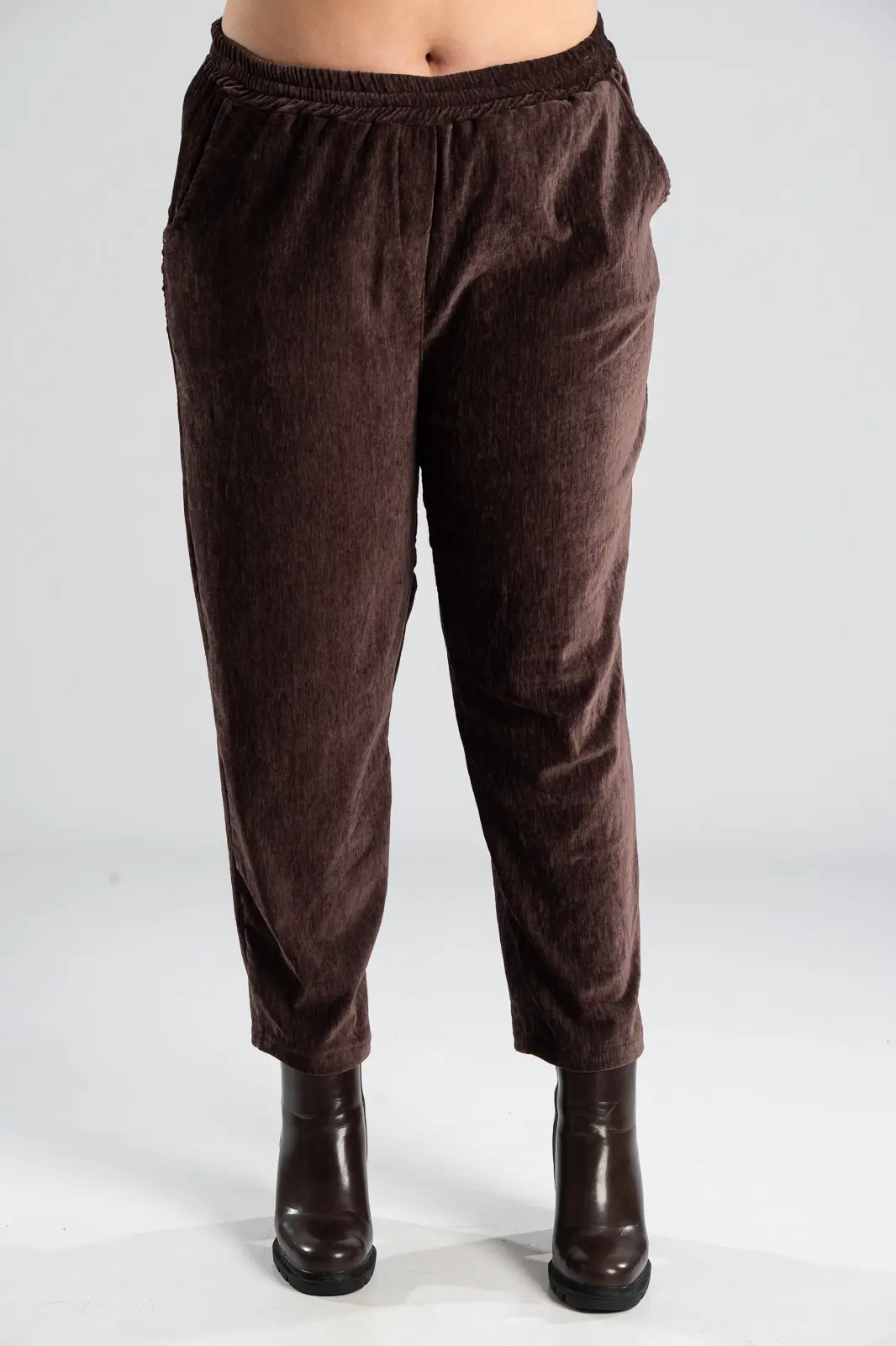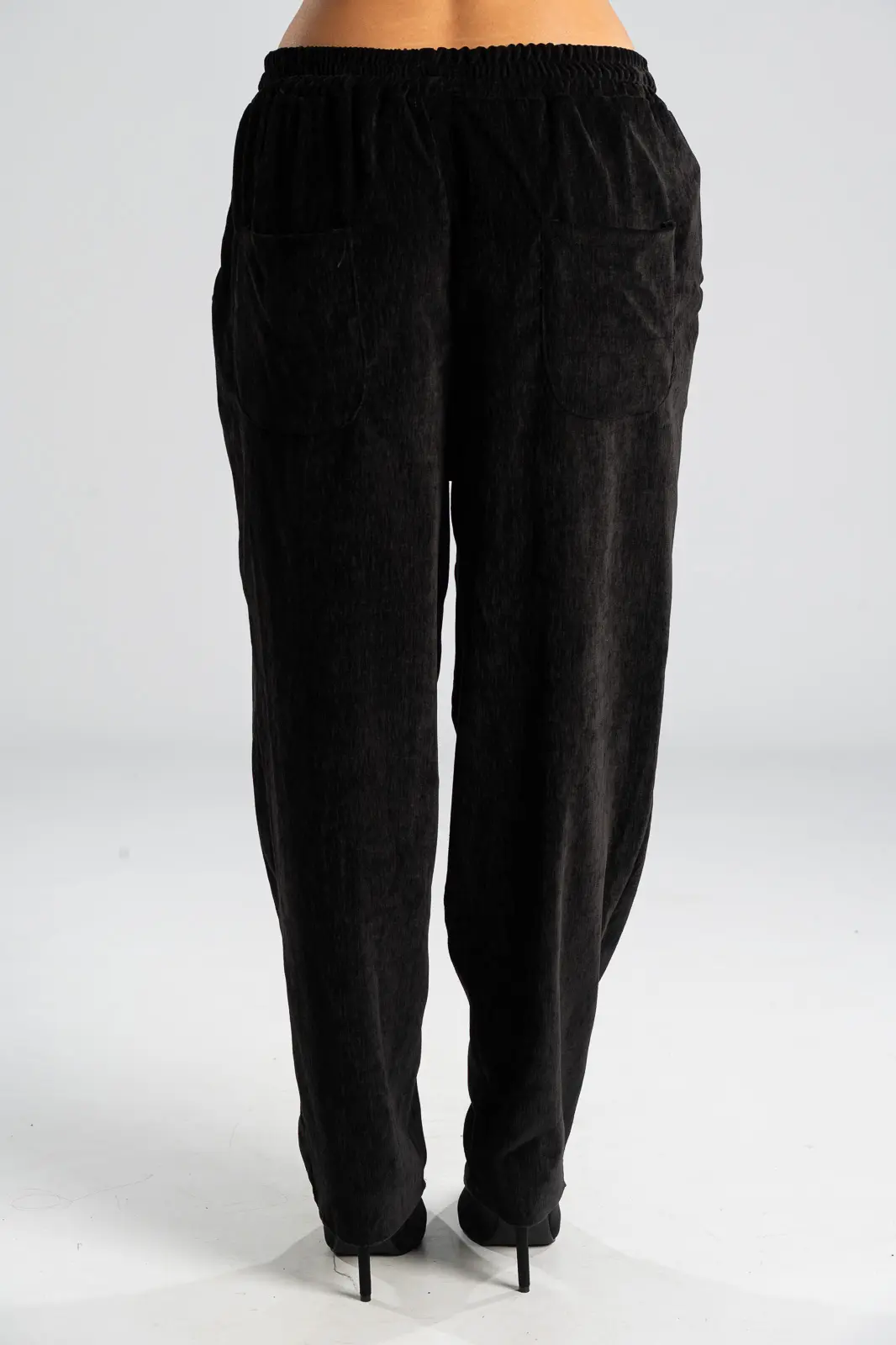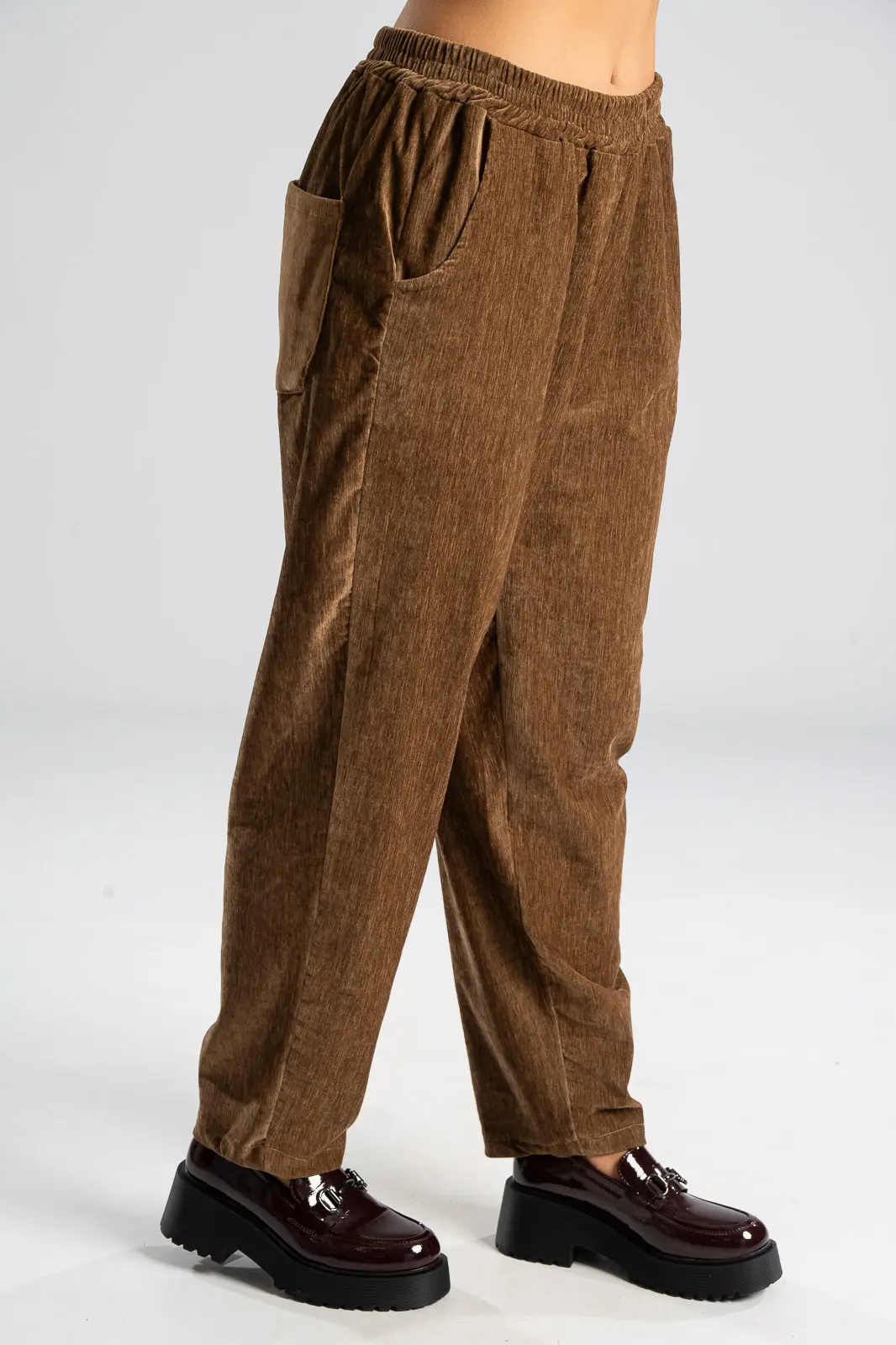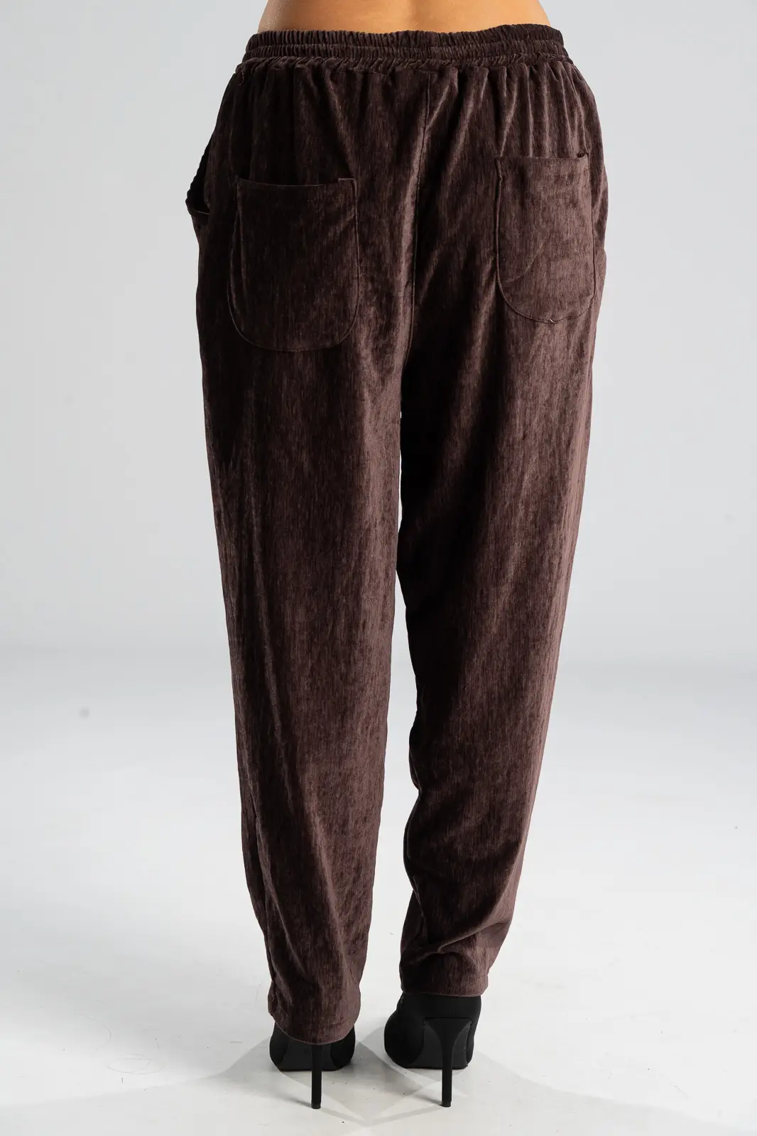 Παντελόνι velvet με λάστιχο περιμετρικά για καλύτερη εφαρμογή. Είναι σε ίσια γραμμή και το ύφασμα του είναι πολύ μαλακό. Στα πλαινά και στο πίσω μέρος έχει τσέπες. Οι μετρήσεις του πίνακα είναι αντιπροσωπευτικές για κάθε κωδικό. 96% polyester, 4% elastan.